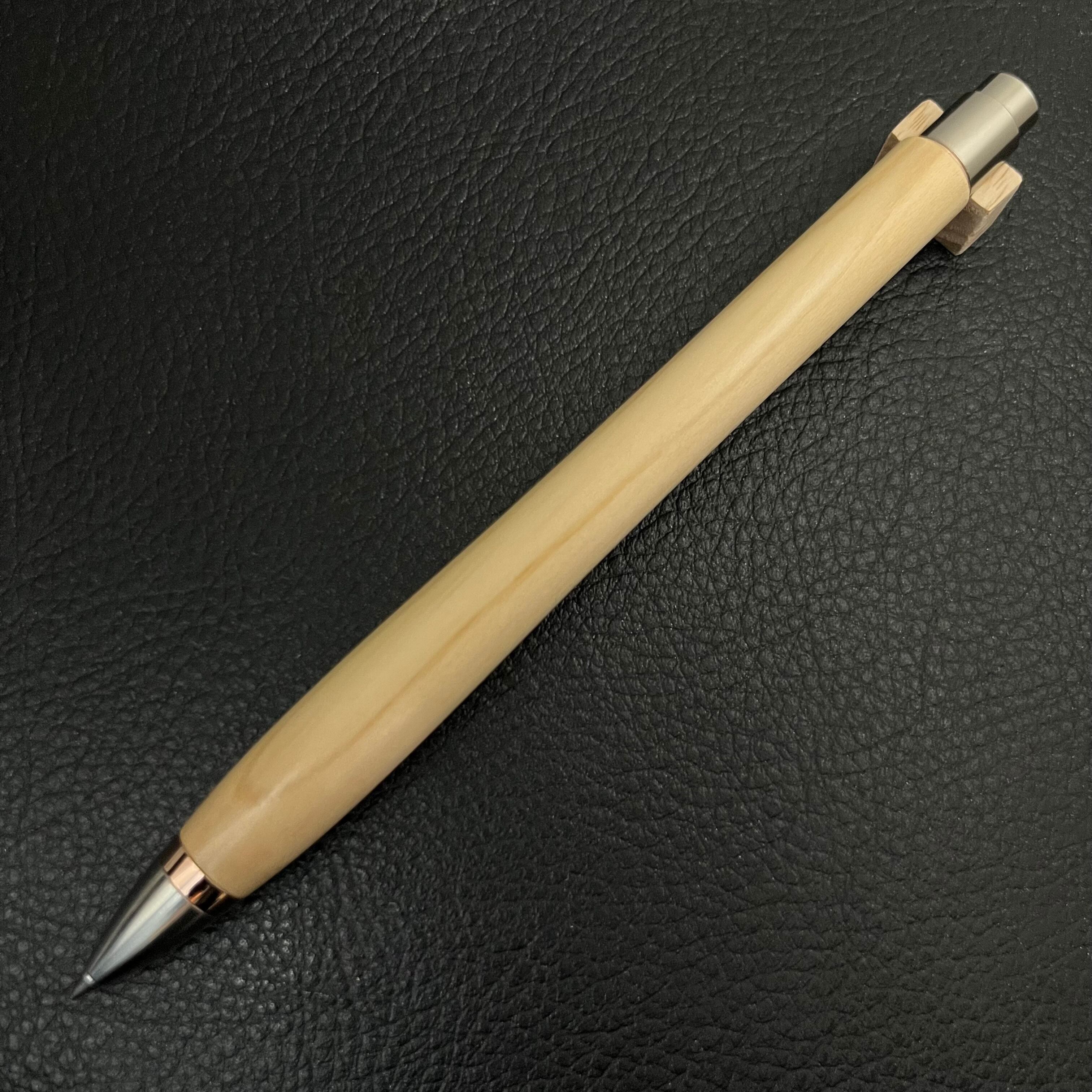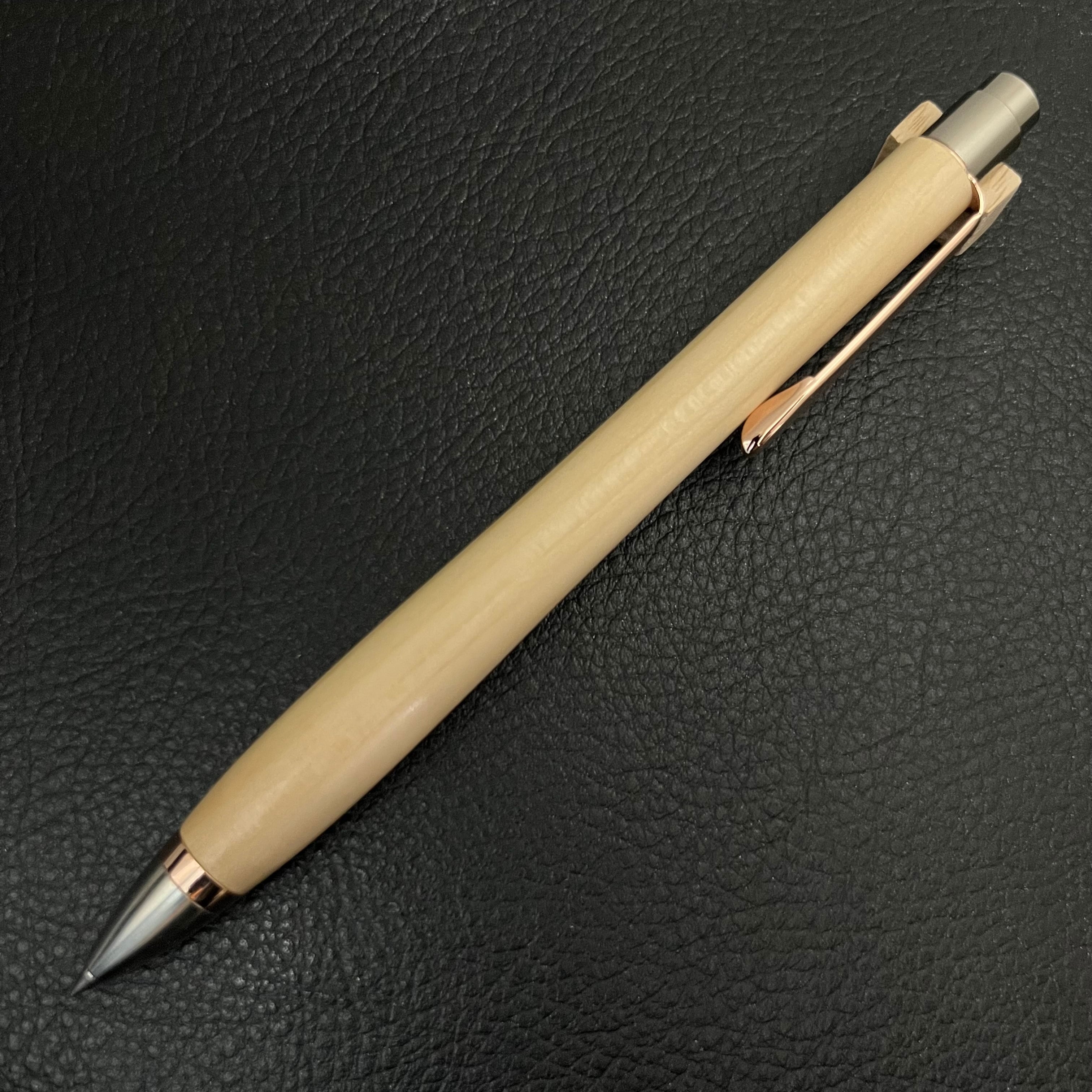 ボールペンのノックシステムは、ドイツ最高のクリックメカニズムを採用してあります。このメカニズムはユニークな機構のため、クリックしたときのカチカチ音が静かで、どんな場所でも気兼ねなく使うことができます。滑らかに動くこのプッシュ感覚を一度味わうと他には戻れなくなってしまうほどの魅力があります。 100分の1単位の加工精度で削り出されたペン先は、軸ブレも全くありません。