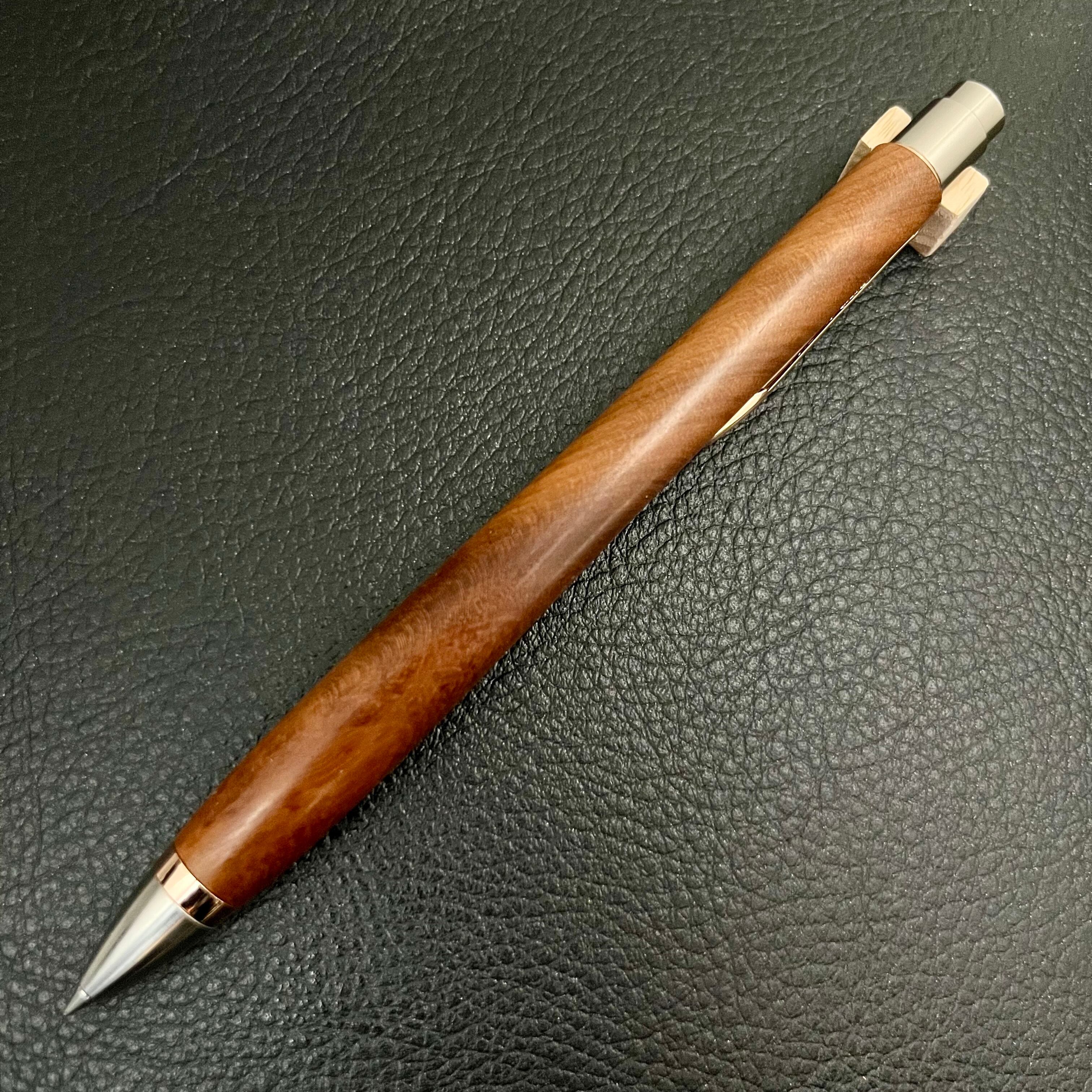 ボールペンのノックシステムは、ドイツ最高のクリックメカニズムを採用してあります。このメカニズムはユニークな機構のため、クリックしたときのカチカチ音が静かで、どんな場所でも気兼ねなく使うことができます。滑らかに動くこのプッシュ感覚を一度味わうと他には戻れなくなってしまうほどの魅力があります。 100分の1単位の加工精度で削り出されたペン先は、軸ブレも全くありません。