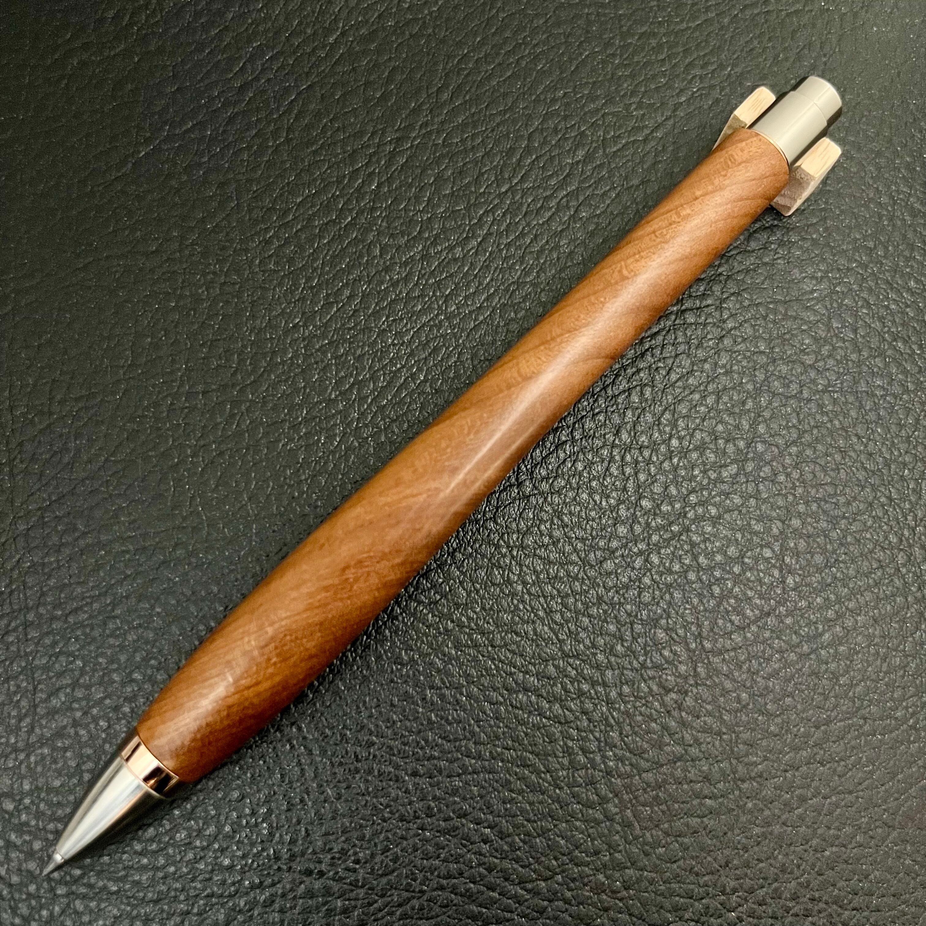 ボールペンのノックシステムは、ドイツ最高のクリックメカニズムを採用してあります。このメカニズムはユニークな機構のため、クリックしたときのカチカチ音が静かで、どんな場所でも気兼ねなく使うことができます。滑らかに動くこのプッシュ感覚を一度味わうと他には戻れなくなってしまうほどの魅力があります。 100分の1単位の加工精度で削り出されたペン先は、軸ブレも全くありません。