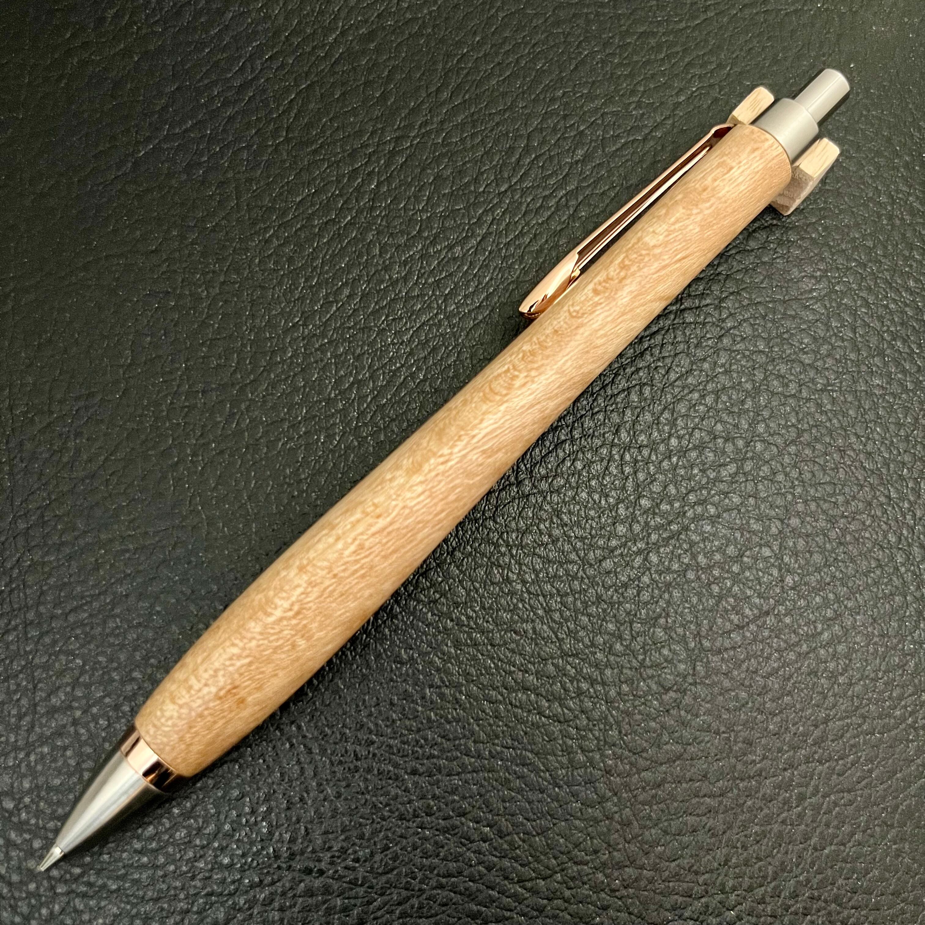 ペンシルは軸ブレが起こりにくい固定式口金を採用し、木の表情を最大限に楽しめる木軸の長さと、書き心地にこだわったバランスで金具を設計してあります。