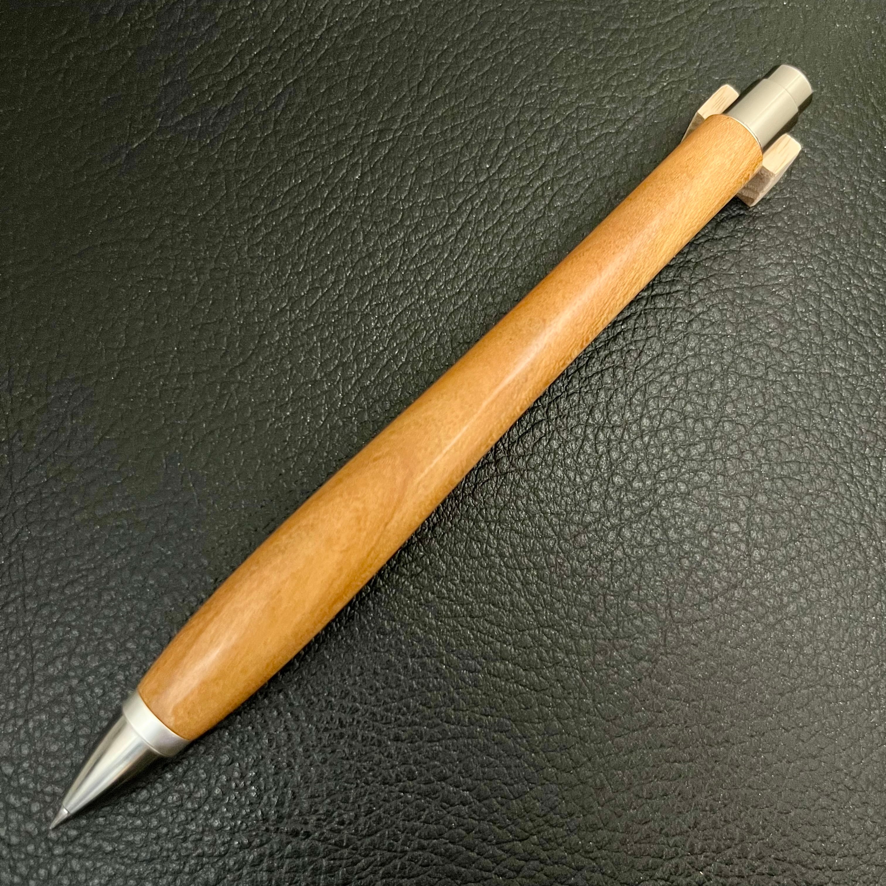 ボールペンのノックシステムは、ドイツ最高のクリックメカニズムを採用してあります。このメカニズムはユニークな機構のため、クリックしたときのカチカチ音が静かで、どんな場所でも気兼ねなく使うことができます。滑らかに動くこのプッシュ感覚を一度味わうと他には戻れなくなってしまうほどの魅力があります。 100分の1単位の加工精度で削り出されたペン先は、軸ブレも全くありません。