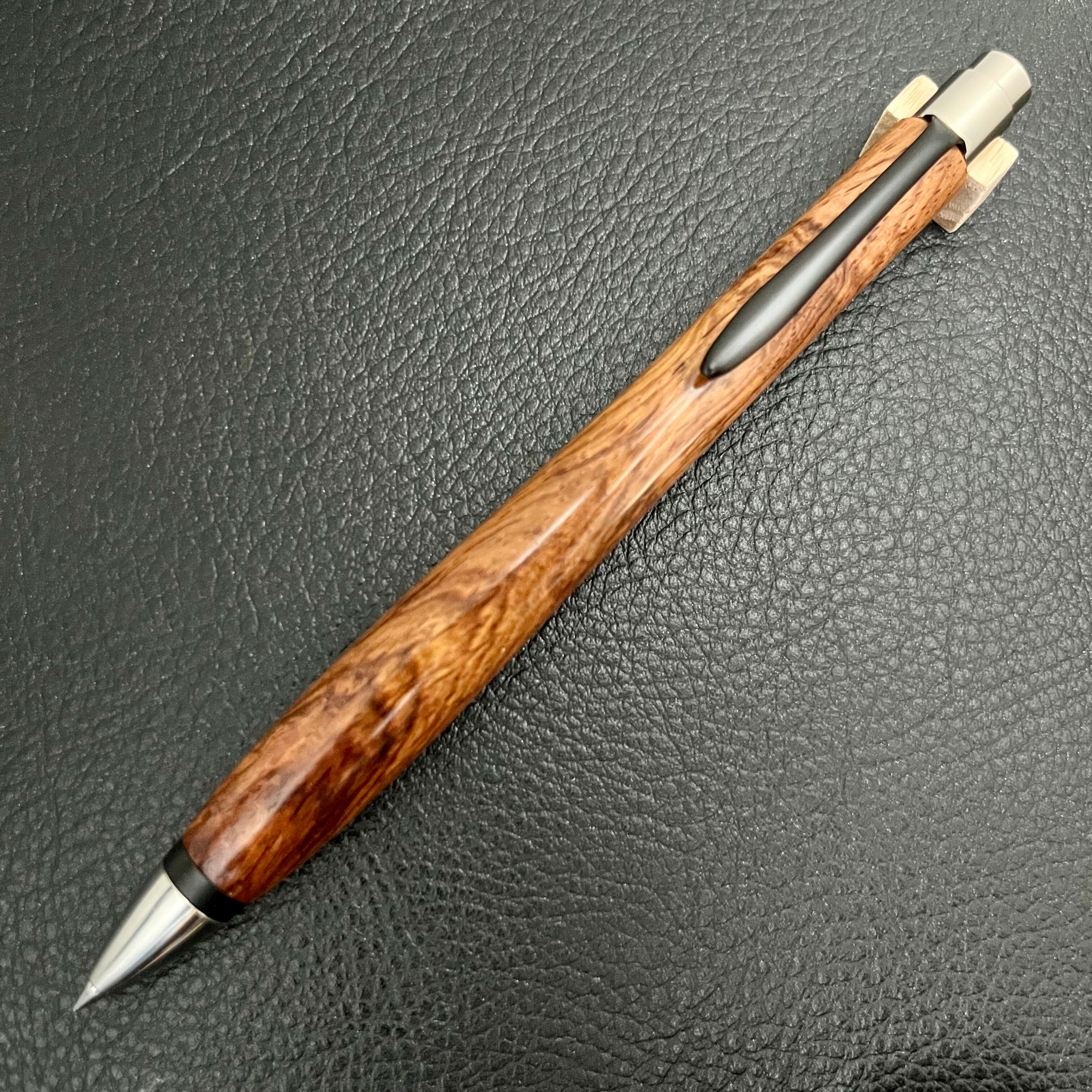 ボールペンのノックシステムは、ドイツ最高のクリックメカニズムを採用してあります。このメカニズムはユニークな機構のため、クリックしたときのカチカチ音が静かで、どんな場所でも気兼ねなく使うことができます。滑らかに動くこのプッシュ感覚を一度味わうと他には戻れなくなってしまうほどの魅力があります。 100分の1単位の加工精度で削り出されたペン先は、軸ブレも全くありません。