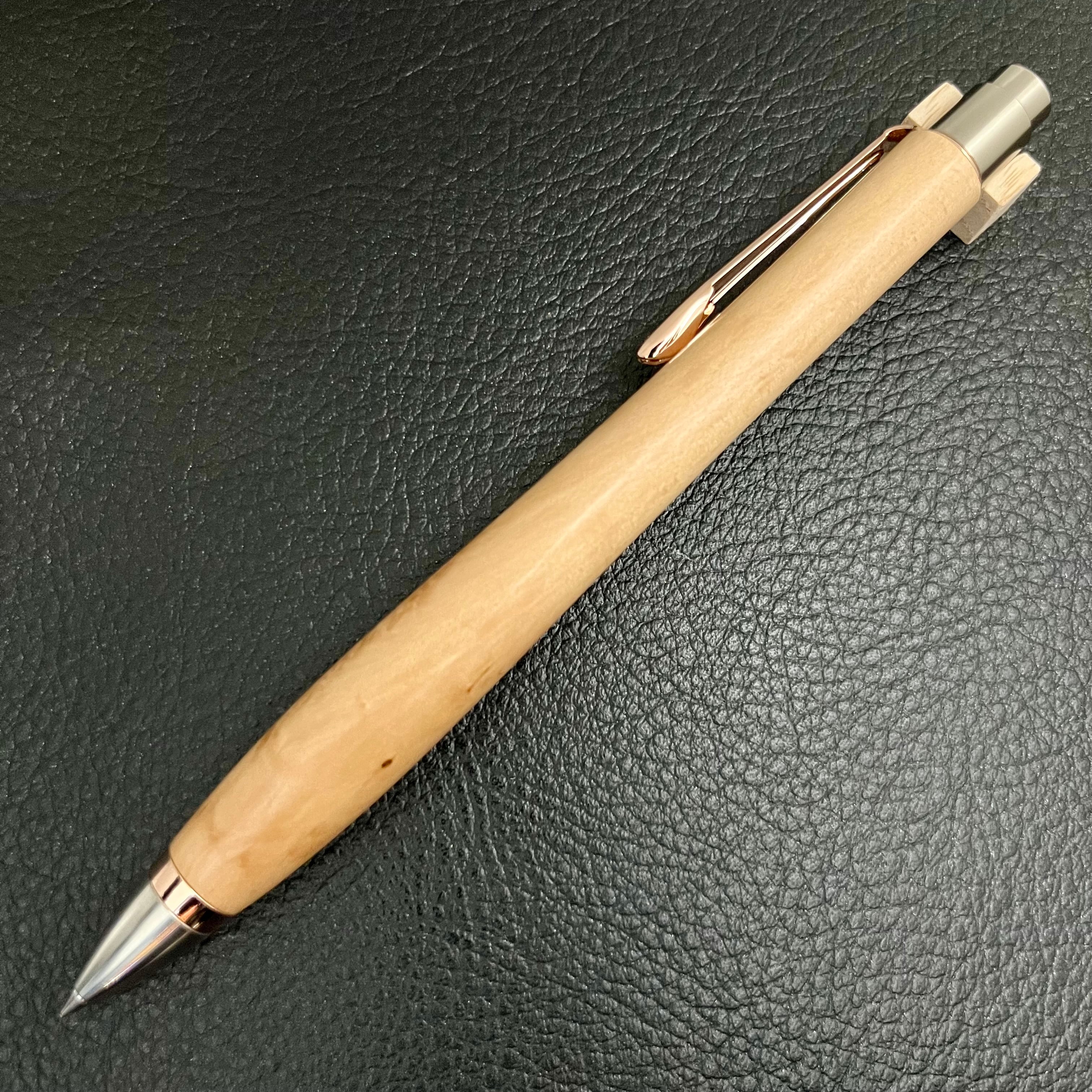 ボールペンのノックシステムは、ドイツ最高のクリックメカニズムを採用してあります。このメカニズムはユニークな機構のため、クリックしたときのカチカチ音が静かで、どんな場所でも気兼ねなく使うことができます。滑らかに動くこのプッシュ感覚を一度味わうと他には戻れなくなってしまうほどの魅力があります。 100分の1単位の加工精度で削り出されたペン先は、軸ブレも全くありません。