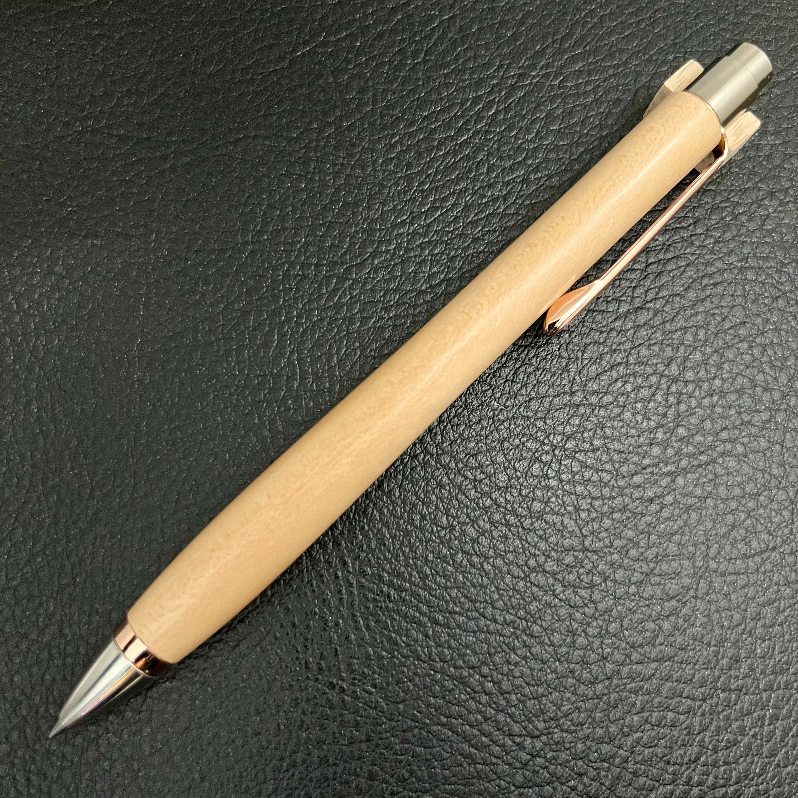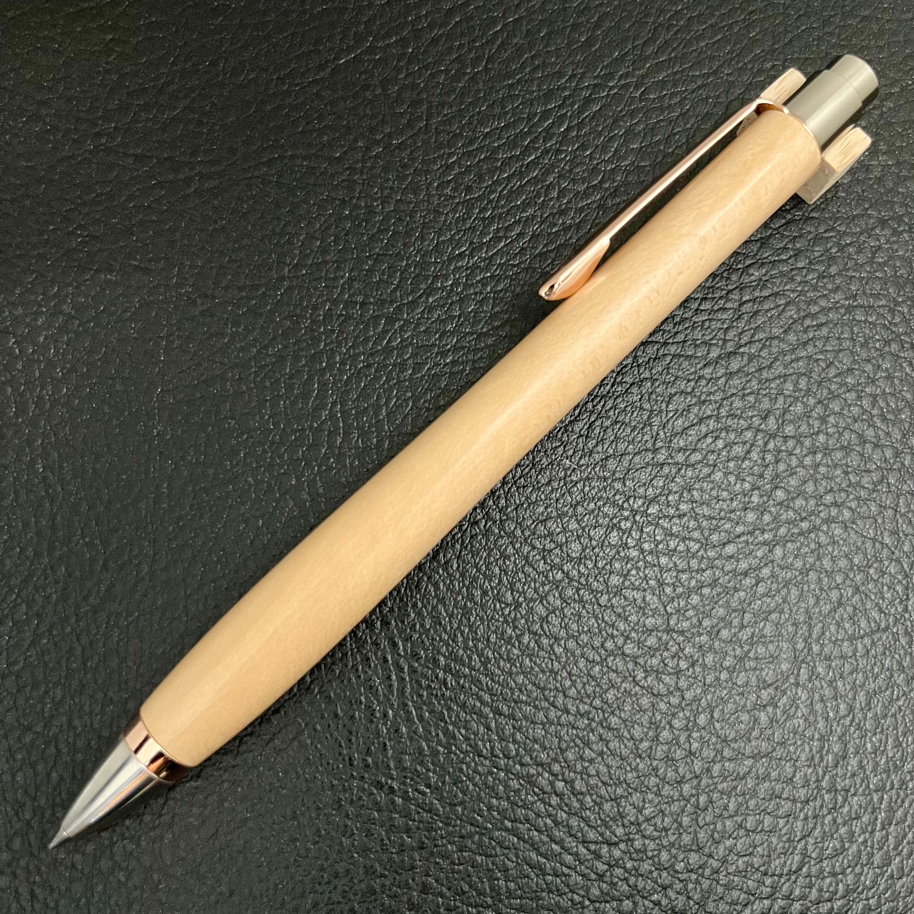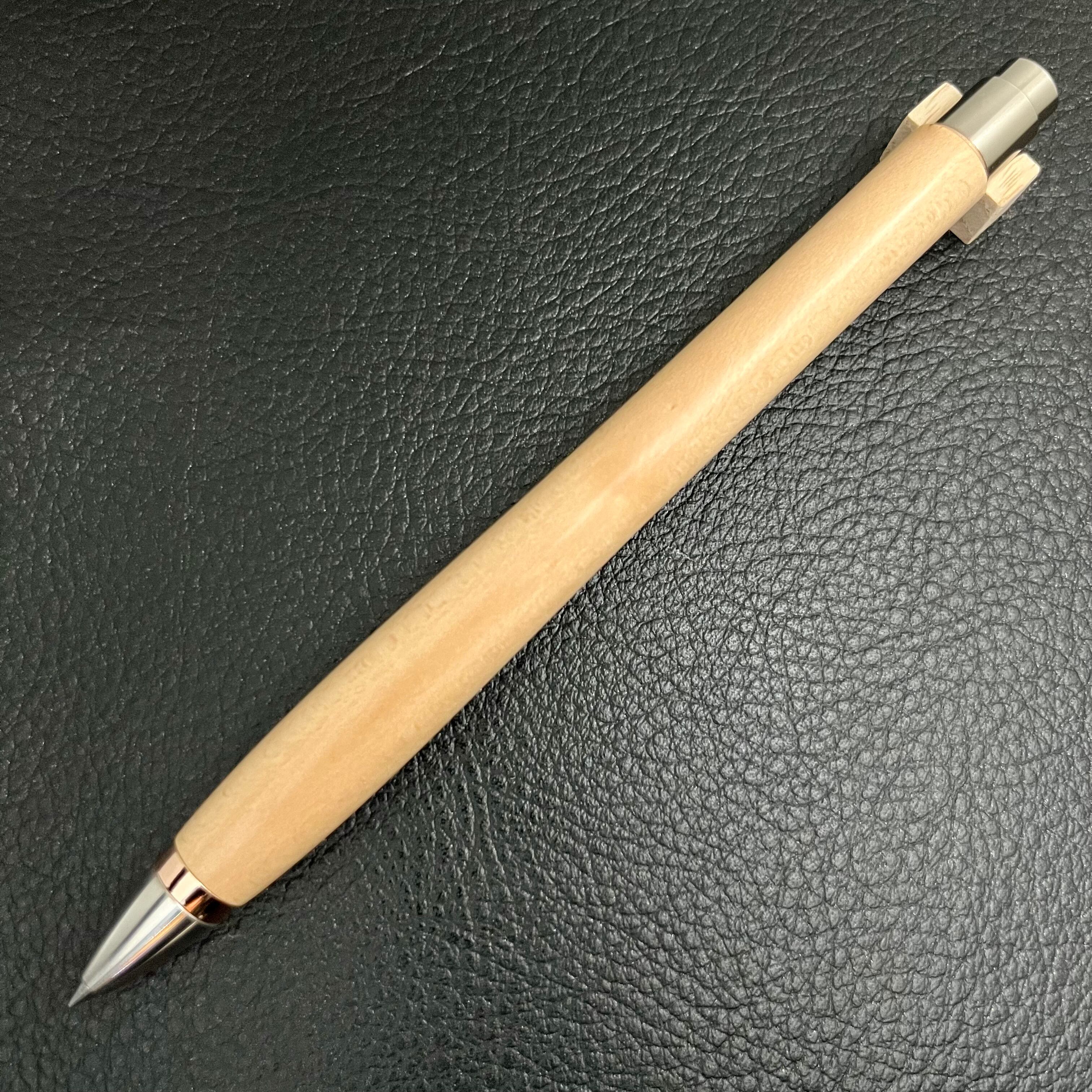 ボールペンのノックシステムは、ドイツ最高のクリックメカニズムを採用してあります。このメカニズムはユニークな機構のため、クリックしたときのカチカチ音が静かで、どんな場所でも気兼ねなく使うことができます。滑らかに動くこのプッシュ感覚を一度味わうと他には戻れなくなってしまうほどの魅力があります。 100分の1単位の加工精度で削り出されたペン先は、軸ブレも全くありません。