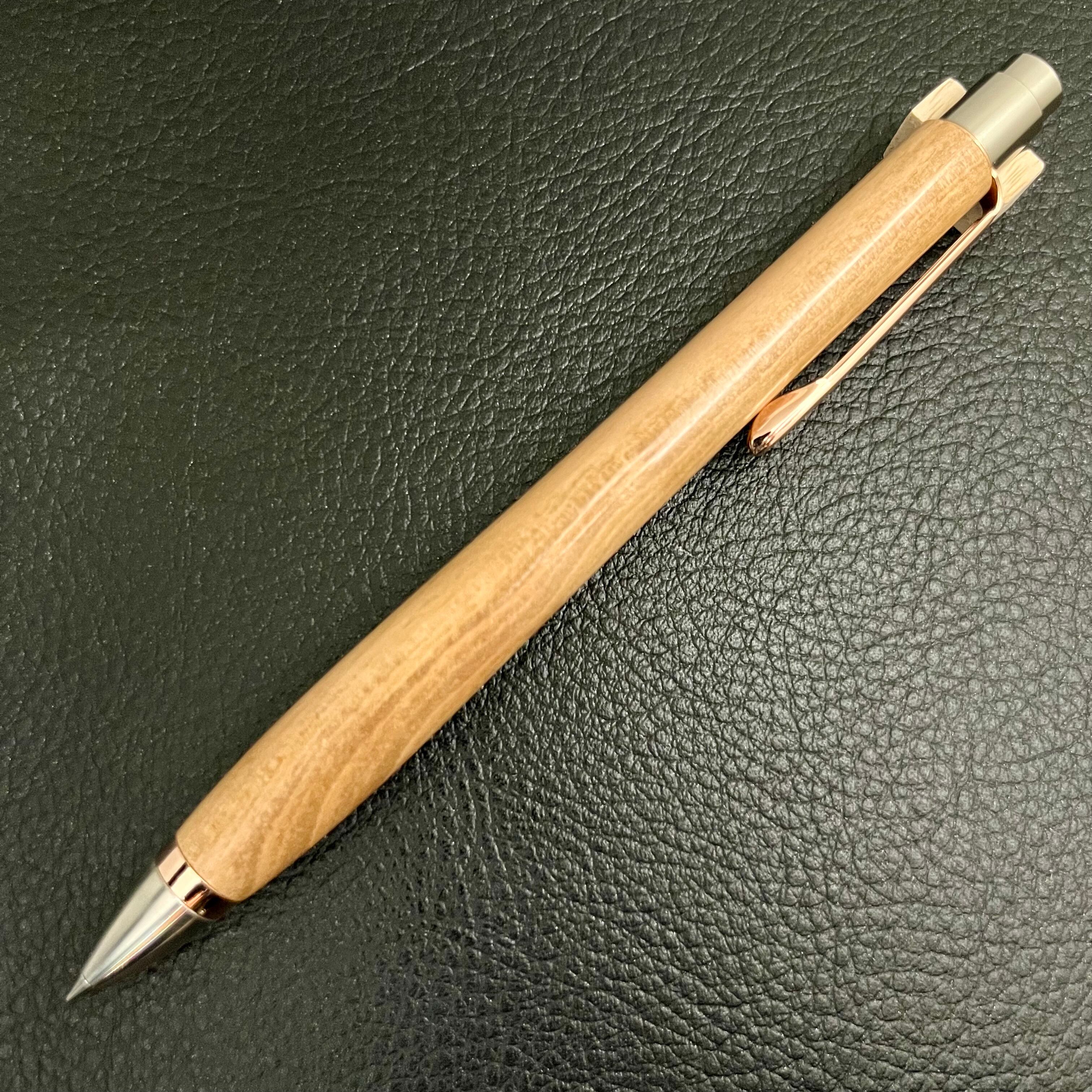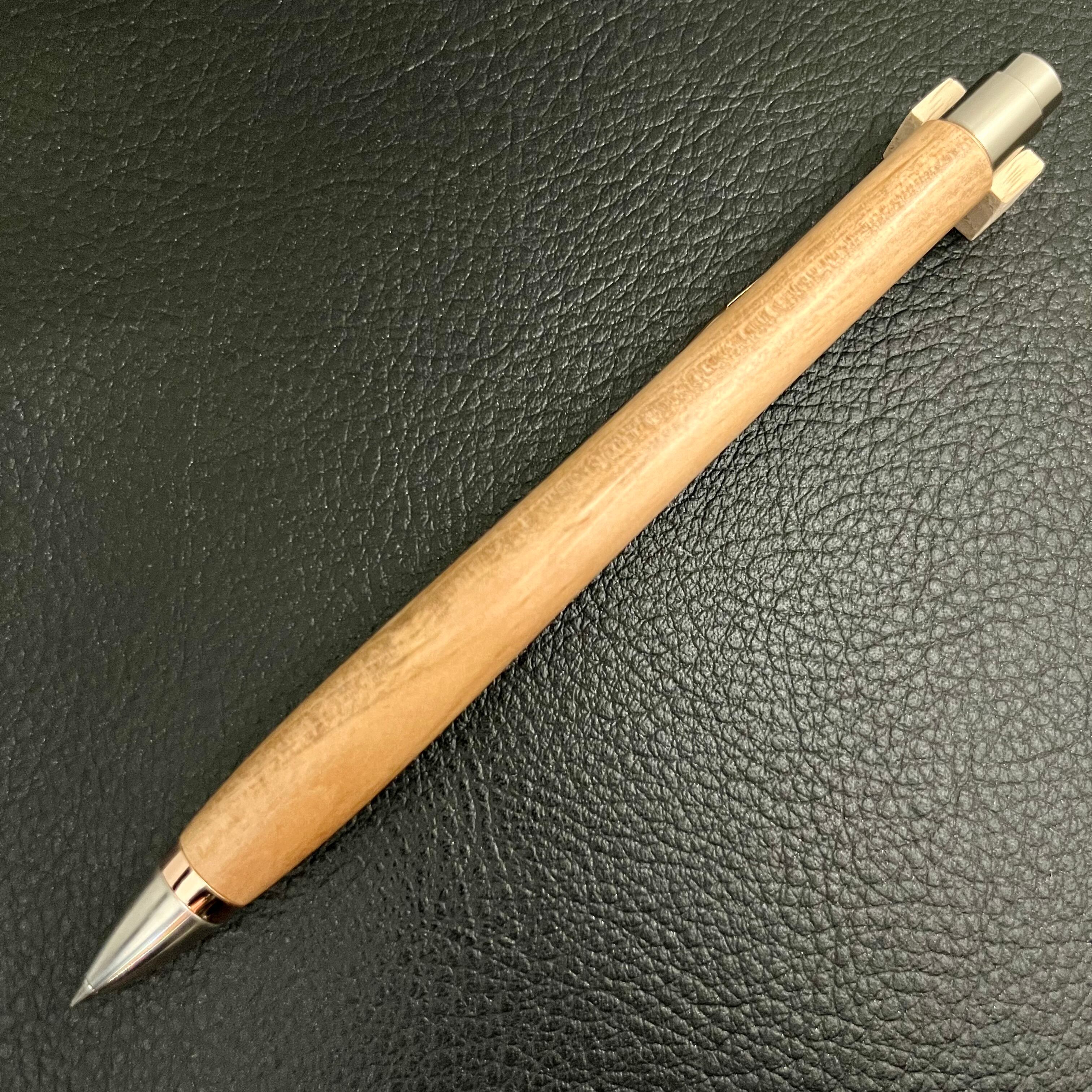 ボールペンのノックシステムは、ドイツ最高のクリックメカニズムを採用してあります。このメカニズムはユニークな機構のため、クリックしたときのカチカチ音が静かで、どんな場所でも気兼ねなく使うことができます。滑らかに動くこのプッシュ感覚を一度味わうと他には戻れなくなってしまうほどの魅力があります。 100分の1単位の加工精度で削り出されたペン先は、軸ブレも全くありません。