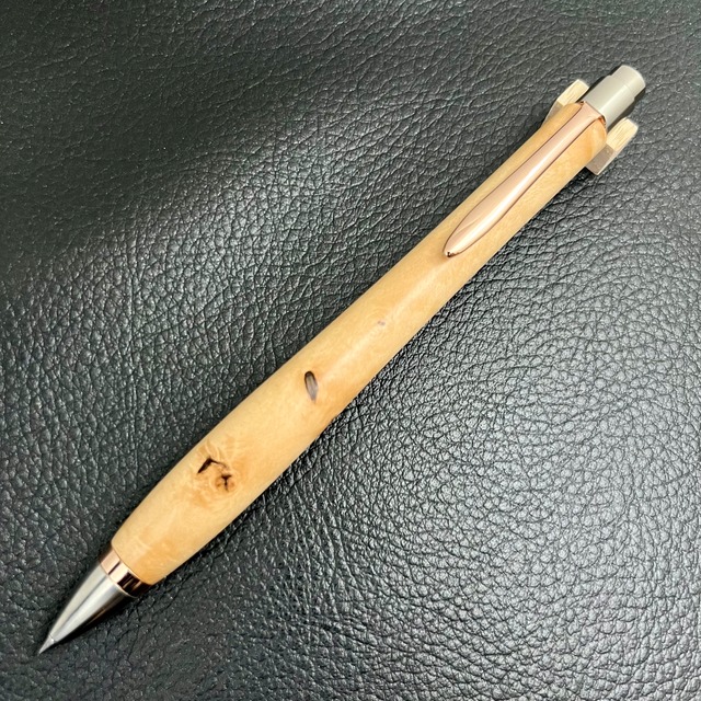 ボールペンのノックシステムは、ドイツ最高のクリックメカニズムを採用してあります。このメカニズムはユニークな機構のため、クリックしたときのカチカチ音が静かで、どんな場所でも気兼ねなく使うことができます。滑らかに動くこのプッシュ感覚を一度味わうと他には戻れなくなってしまうほどの魅力があります。 100分の1単位の加工精度で削り出されたペン先は、軸ブレも全くありません。