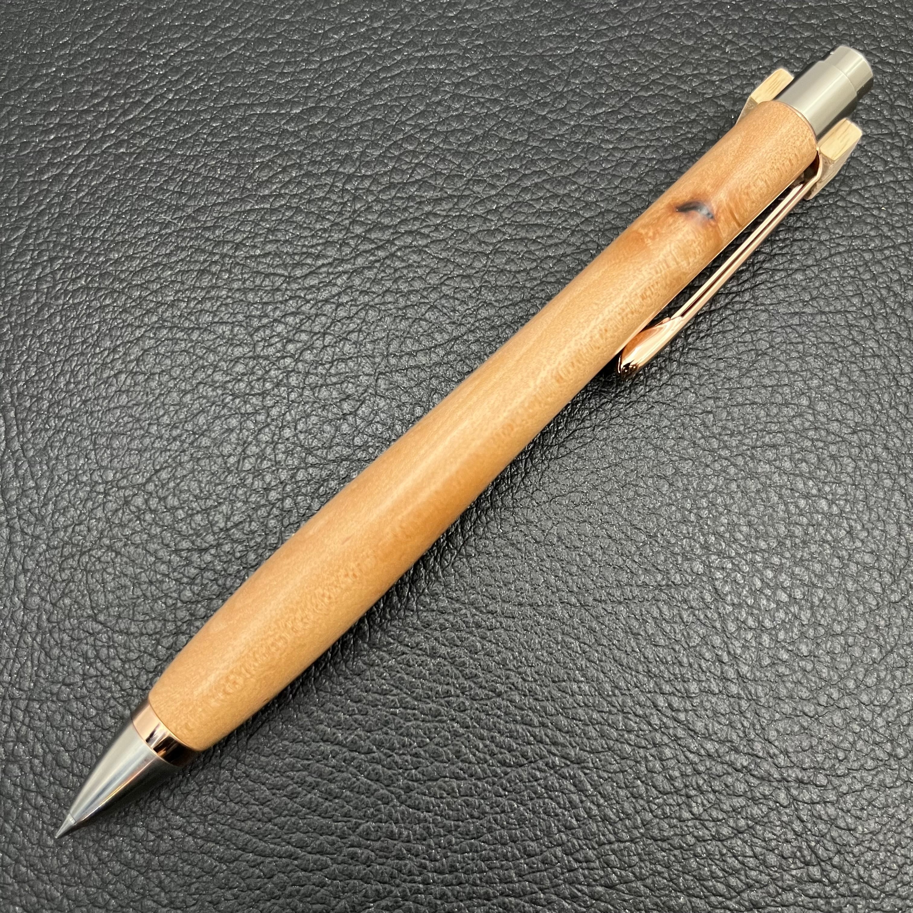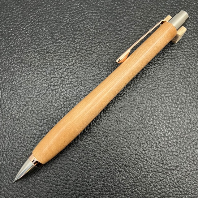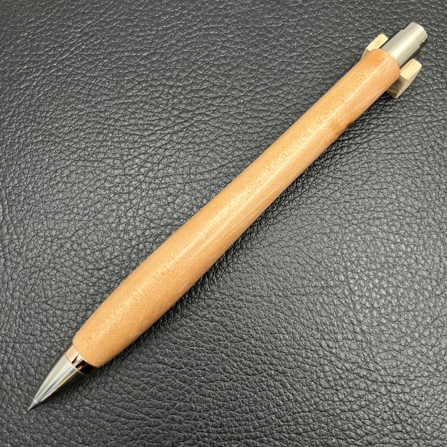 ボールペンのノックシステムは、ドイツ最高のクリックメカニズムを採用してあります。このメカニズムはユニークな機構のため、クリックしたときのカチカチ音が静かで、どんな場所でも気兼ねなく使うことができます。滑らかに動くこのプッシュ感覚を一度味わうと他には戻れなくなってしまうほどの魅力があります。 100分の1単位の加工精度で削り出されたペン先は、軸ブレも全くありません。