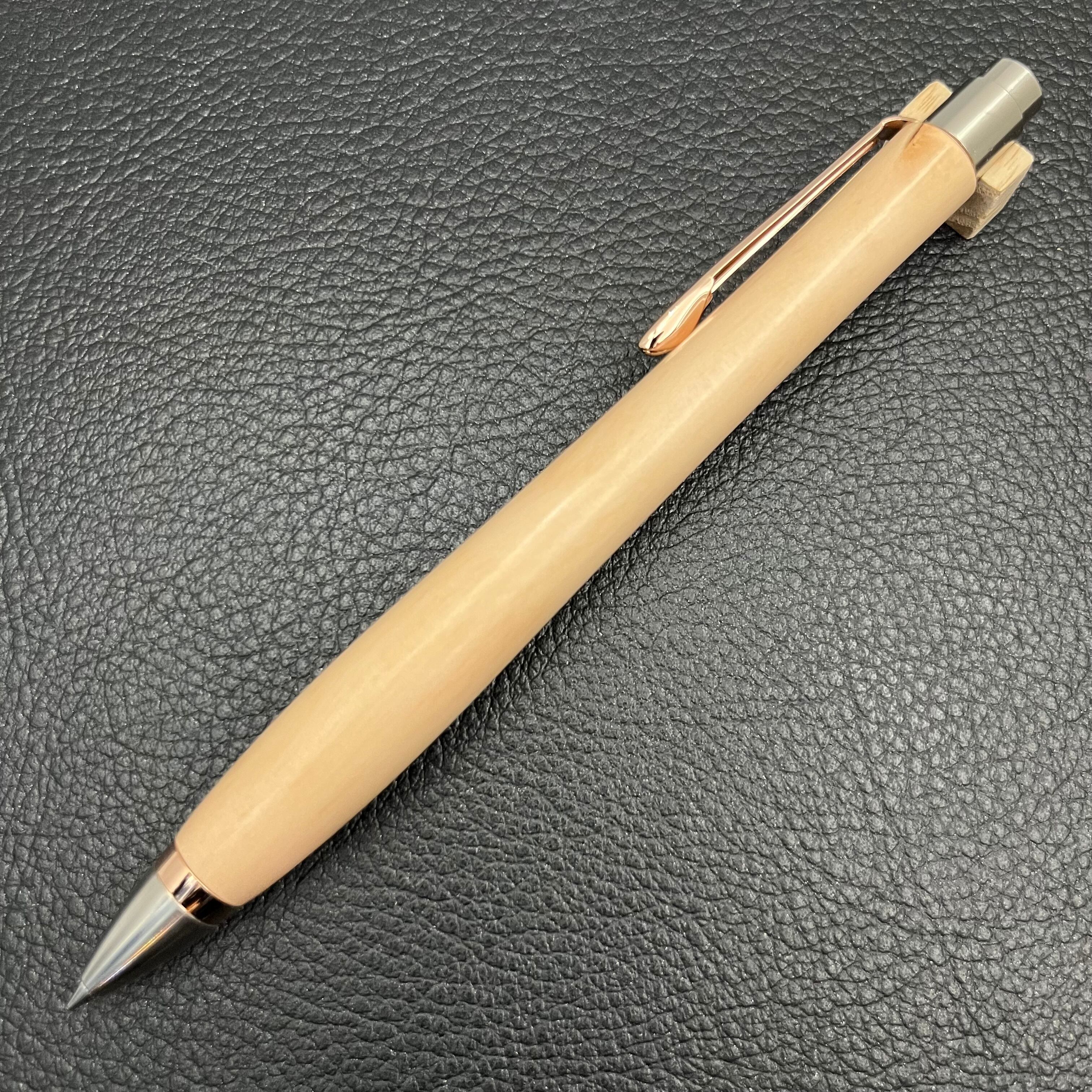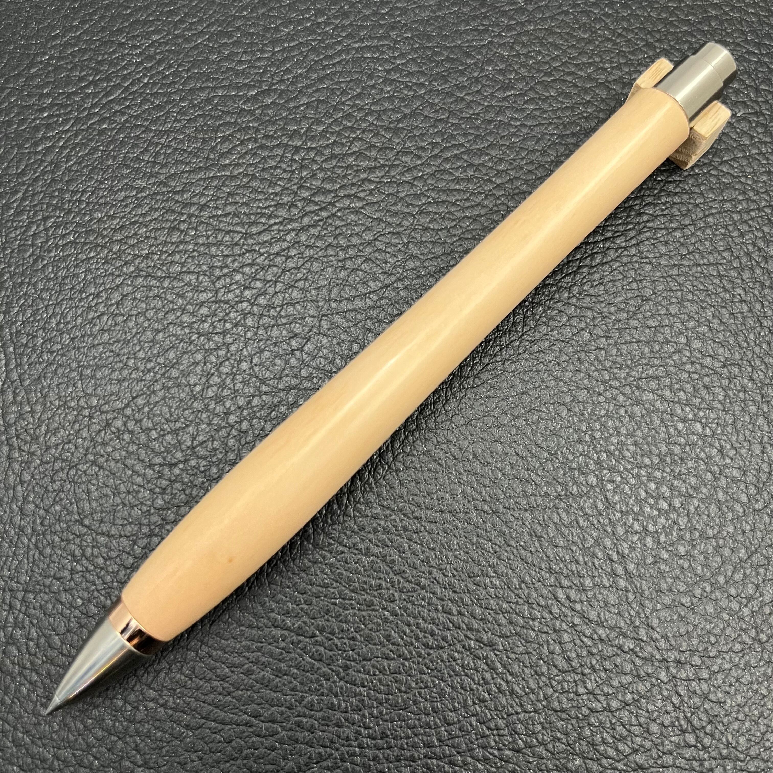 ボールペンのノックシステムは、ドイツ最高のクリックメカニズムを採用してあります。このメカニズムはユニークな機構のため、クリックしたときのカチカチ音が静かで、どんな場所でも気兼ねなく使うことができます。滑らかに動くこのプッシュ感覚を一度味わうと他には戻れなくなってしまうほどの魅力があります。 100分の1単位の加工精度で削り出されたペン先は、軸ブレも全くありません。