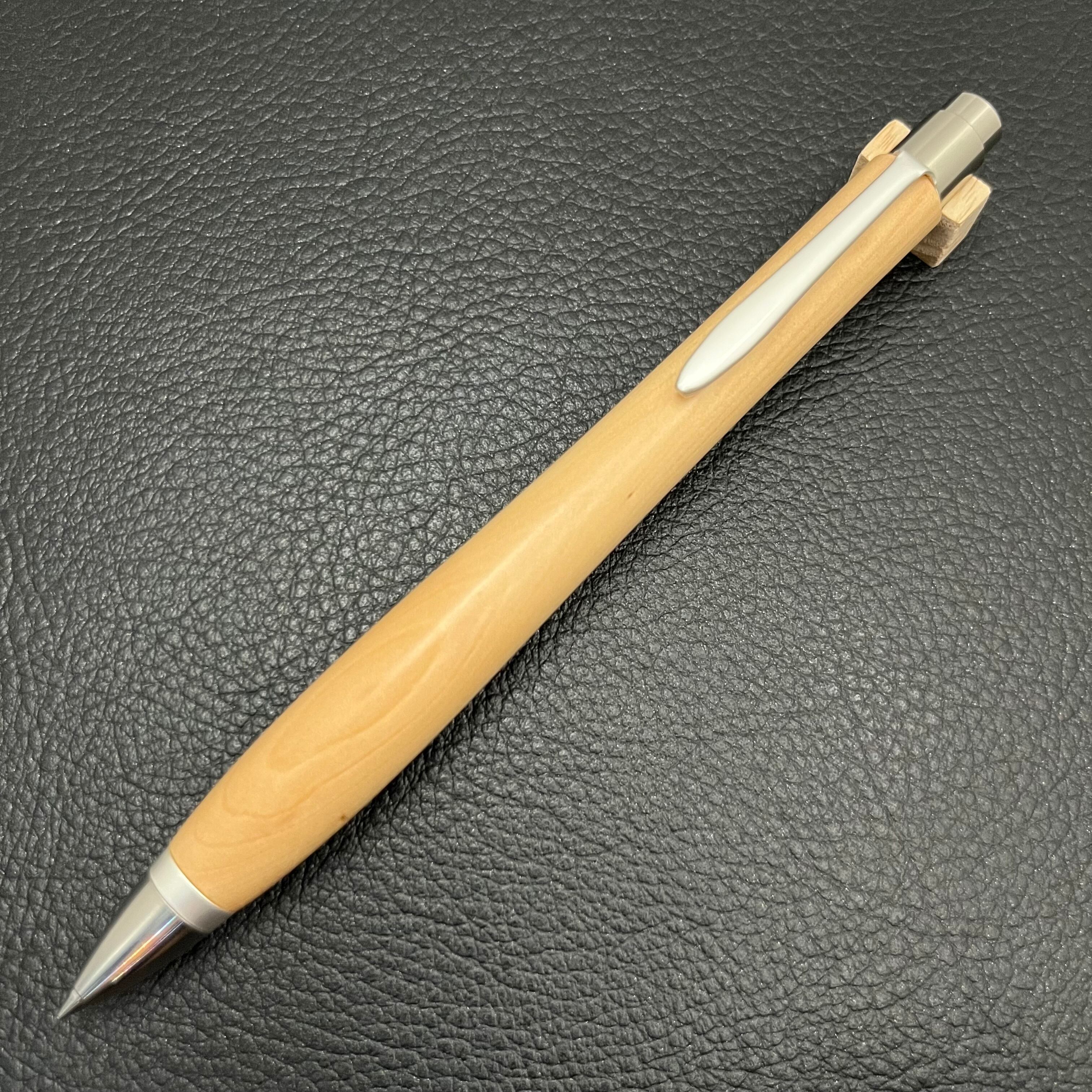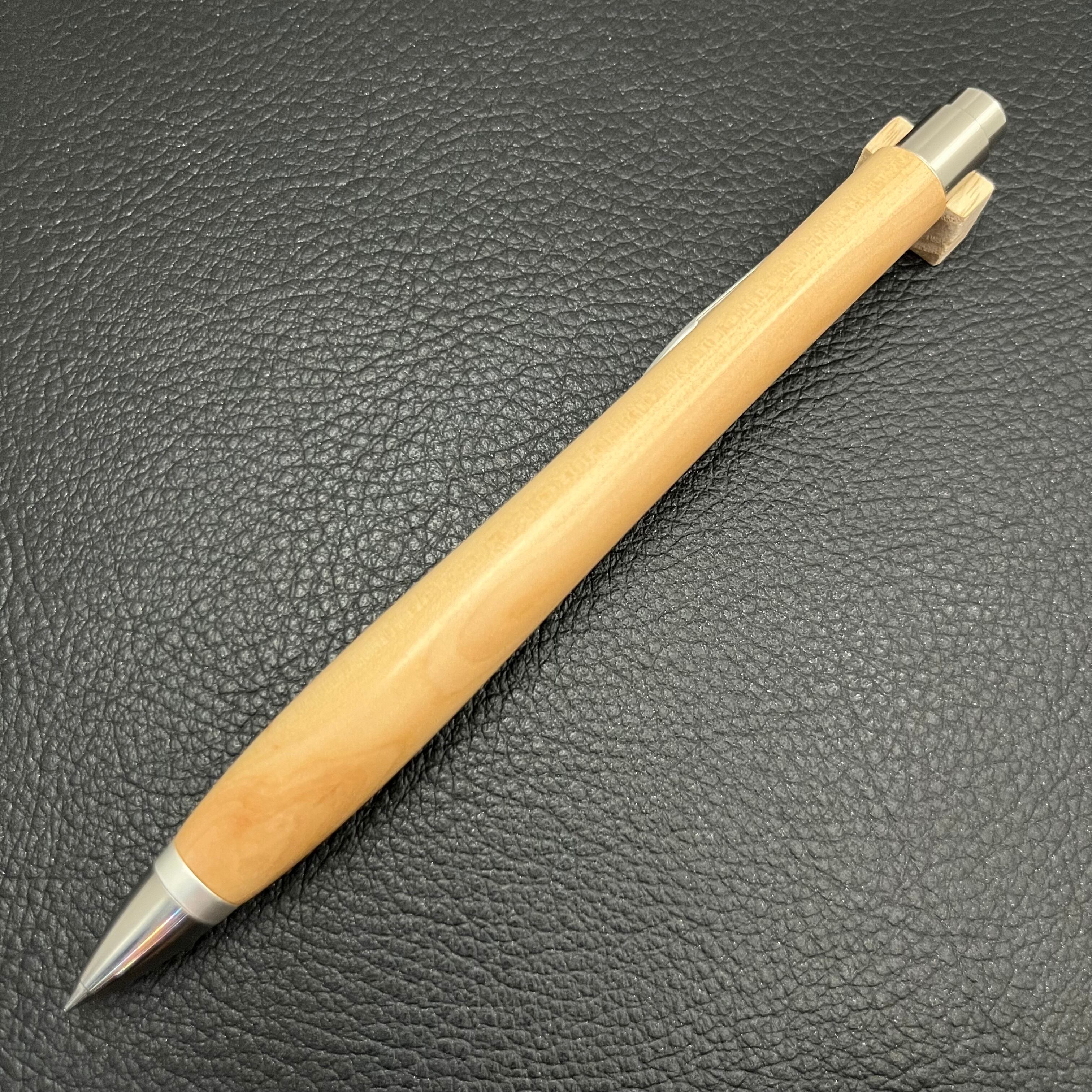 ボールペンのノックシステムは、ドイツ最高のクリックメカニズムを採用してあります。このメカニズムはユニークな機構のため、クリックしたときのカチカチ音が静かで、どんな場所でも気兼ねなく使うことができます。滑らかに動くこのプッシュ感覚を一度味わうと他には戻れなくなってしまうほどの魅力があります。 100分の1単位の加工精度で削り出されたペン先は、軸ブレも全くありません。