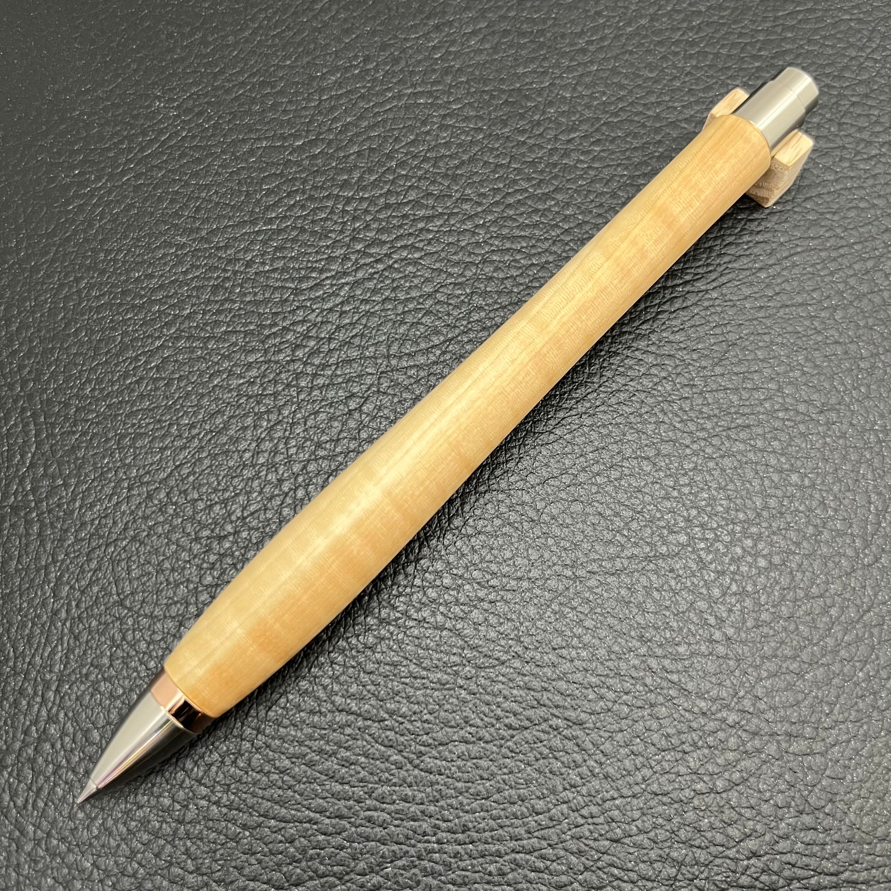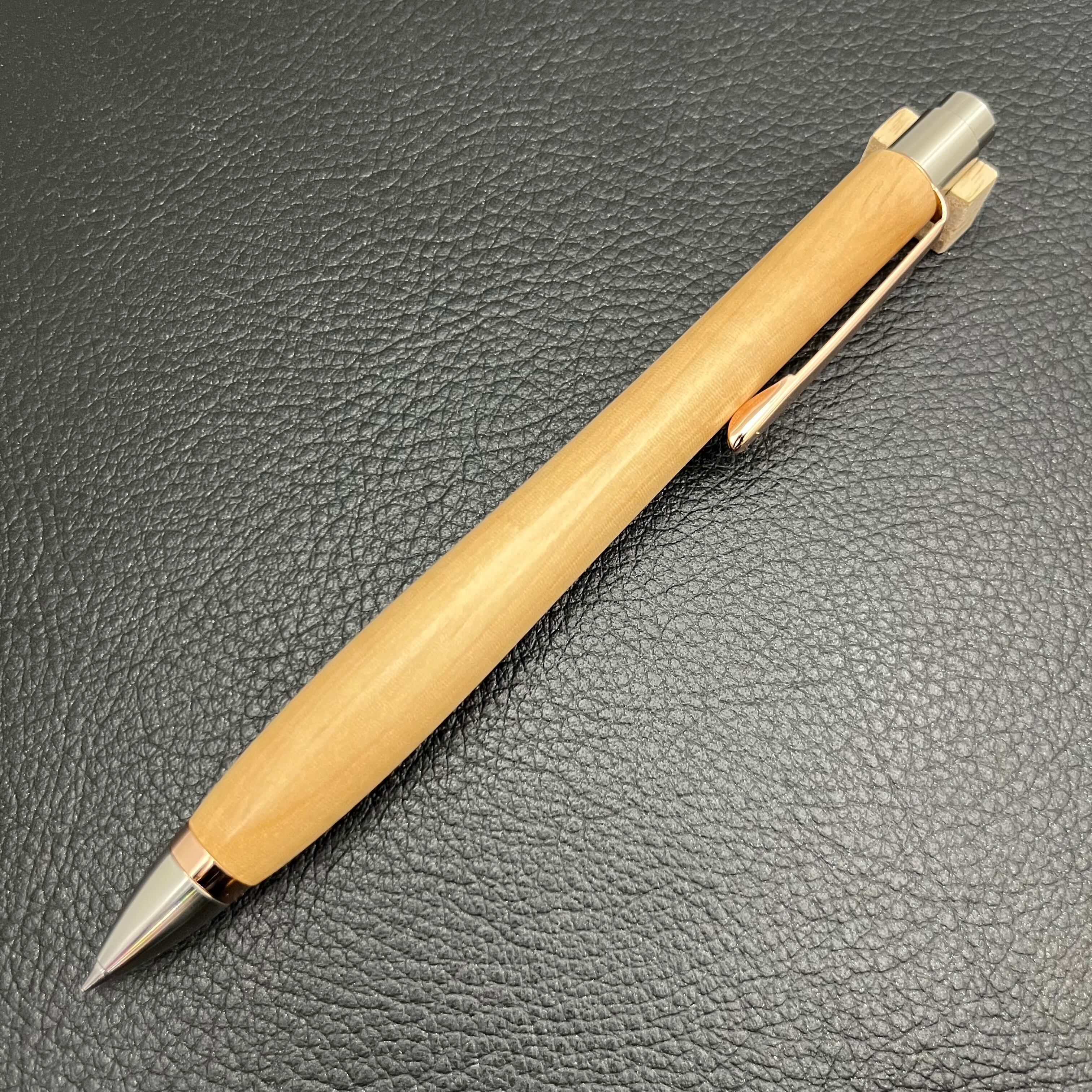 ボールペンのノックシステムは、ドイツ最高のクリックメカニズムを採用してあります。このメカニズムはユニークな機構のため、クリックしたときのカチカチ音が静かで、どんな場所でも気兼ねなく使うことができます。滑らかに動くこのプッシュ感覚を一度味わうと他には戻れなくなってしまうほどの魅力があります。 100分の1単位の加工精度で削り出されたペン先は、軸ブレも全くありません。