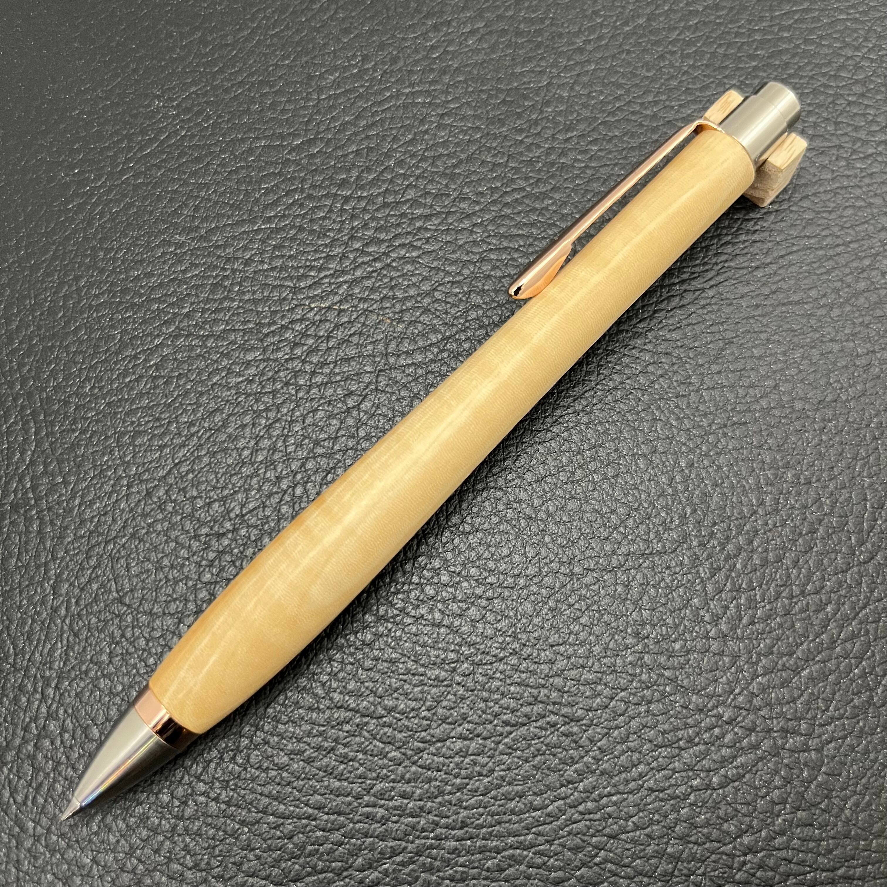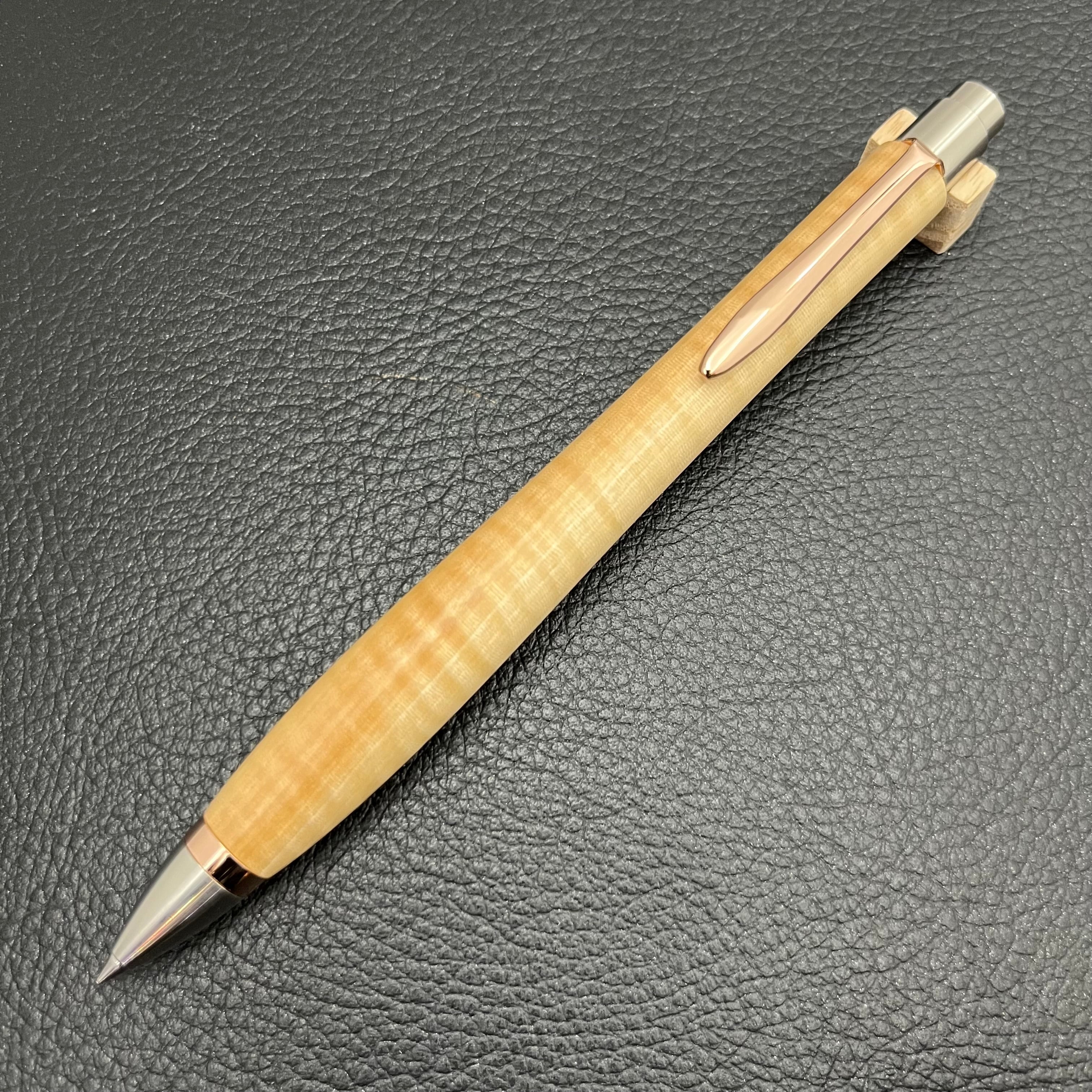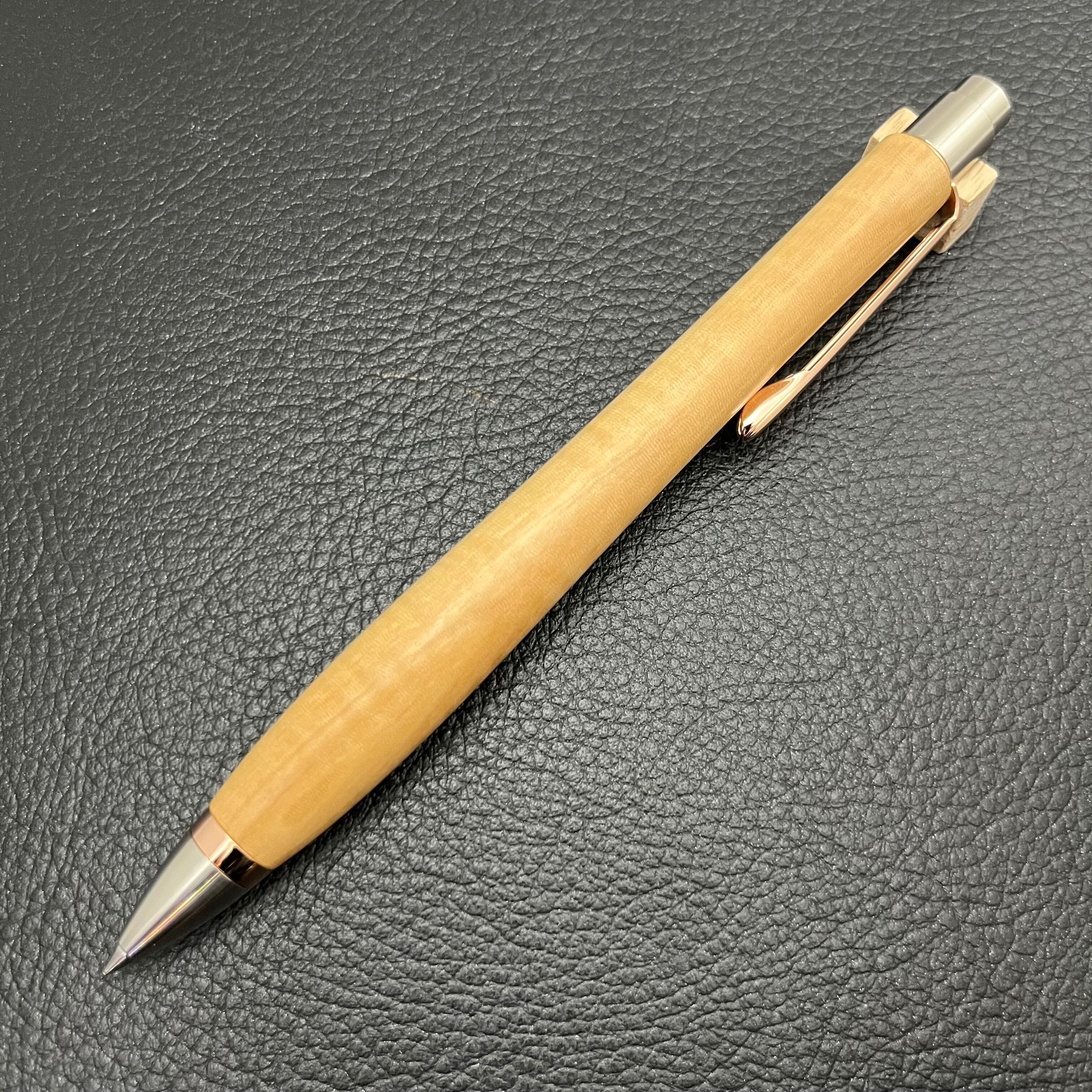 ボールペンのノックシステムは、ドイツ最高のクリックメカニズムを採用してあります。このメカニズムはユニークな機構のため、クリックしたときのカチカチ音が静かで、どんな場所でも気兼ねなく使うことができます。滑らかに動くこのプッシュ感覚を一度味わうと他には戻れなくなってしまうほどの魅力があります。 100分の1単位の加工精度で削り出されたペン先は、軸ブレも全くありません。