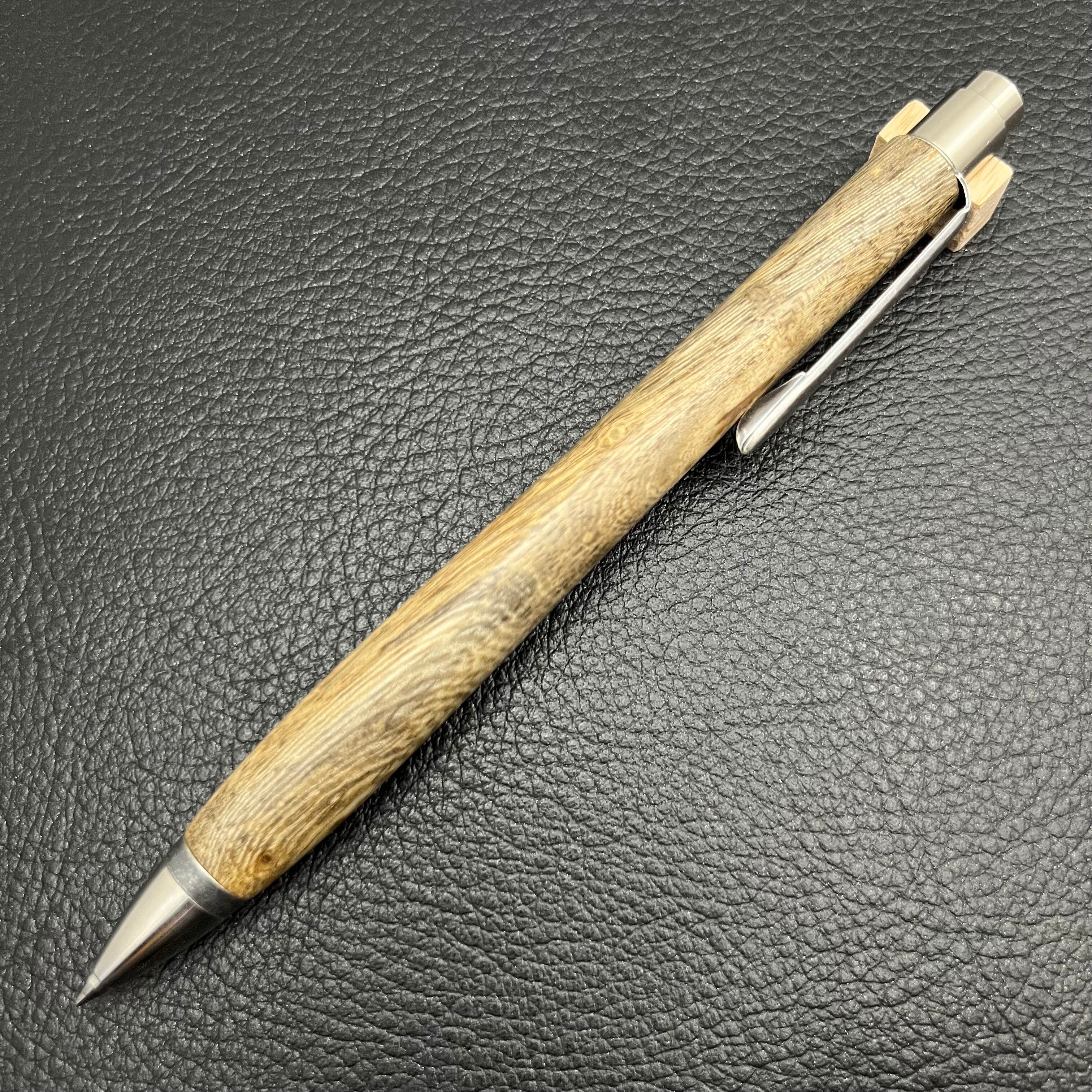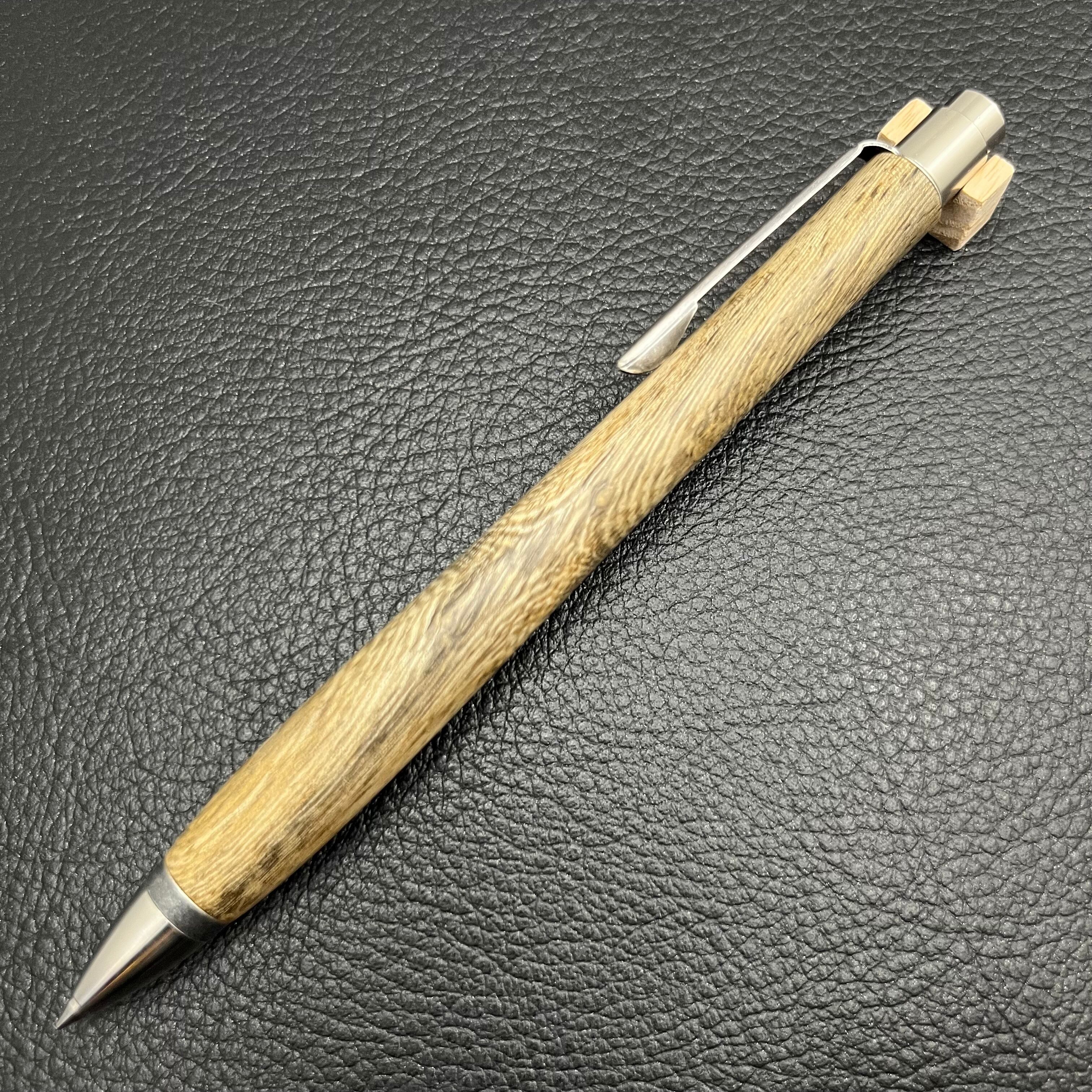 ボールペンのノックシステムは、ドイツ最高のクリックメカニズムを採用してあります。このメカニズムはユニークな機構のため、クリックしたときのカチカチ音が静かで、どんな場所でも気兼ねなく使うことができます。滑らかに動くこのプッシュ感覚を一度味わうと他には戻れなくなってしまうほどの魅力があります。 100分の1単位の加工精度で削り出されたペン先は、軸ブレも全くありません。