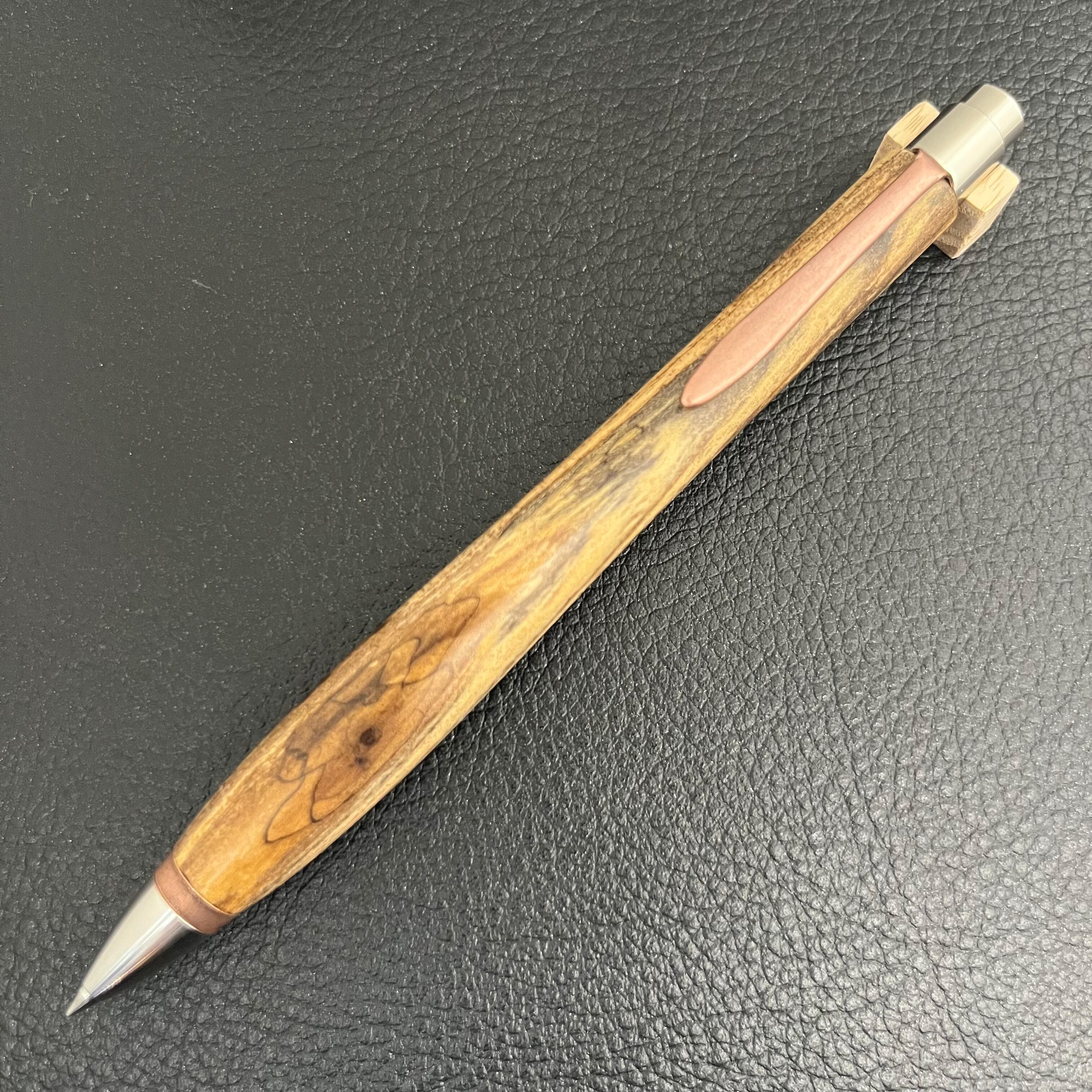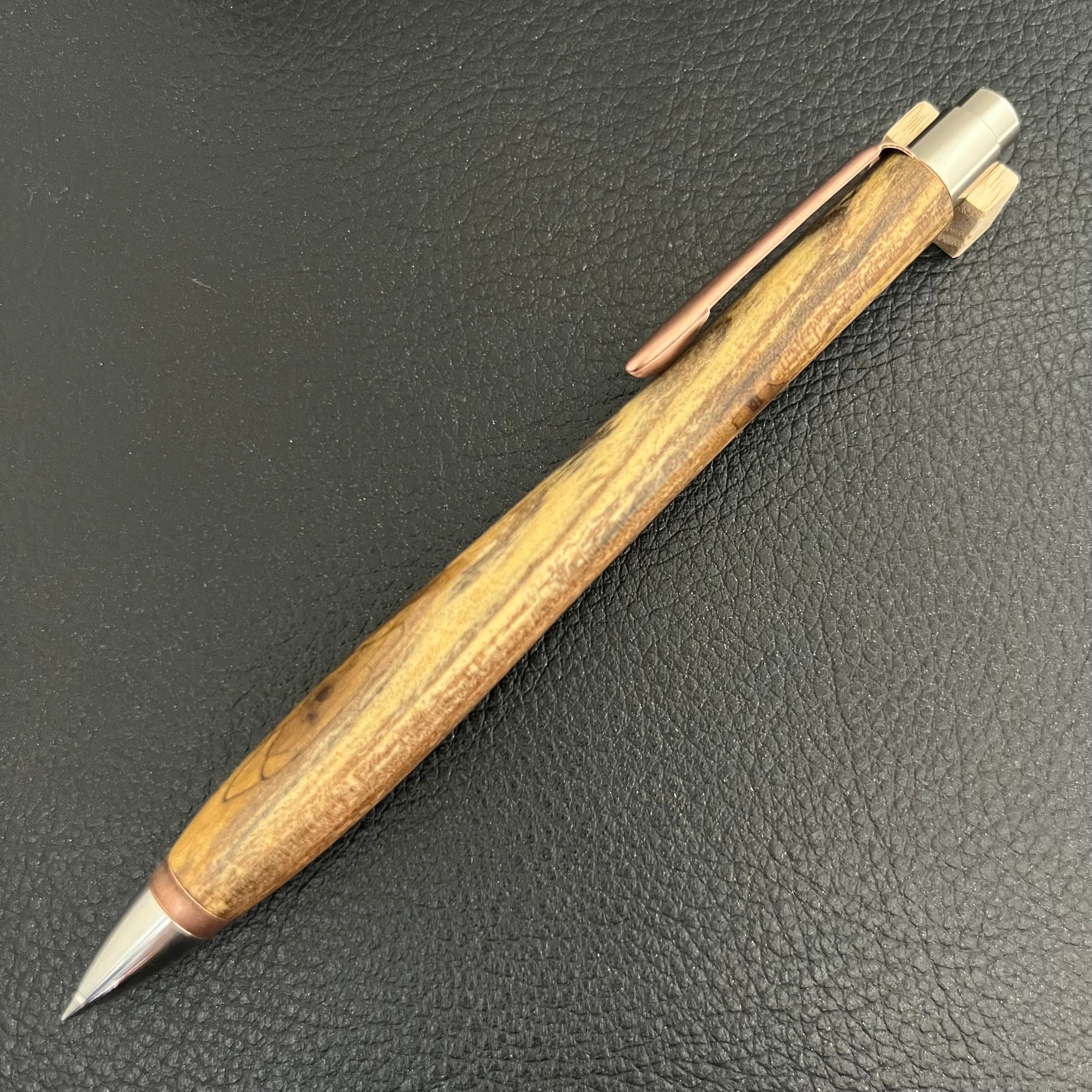 ボールペンのノックシステムは、ドイツ最高のクリックメカニズムを採用してあります。このメカニズムはユニークな機構のため、クリックしたときのカチカチ音が静かで、どんな場所でも気兼ねなく使うことができます。滑らかに動くこのプッシュ感覚を一度味わうと他には戻れなくなってしまうほどの魅力があります。 100分の1単位の加工精度で削り出されたペン先は、軸ブレも全くありません。