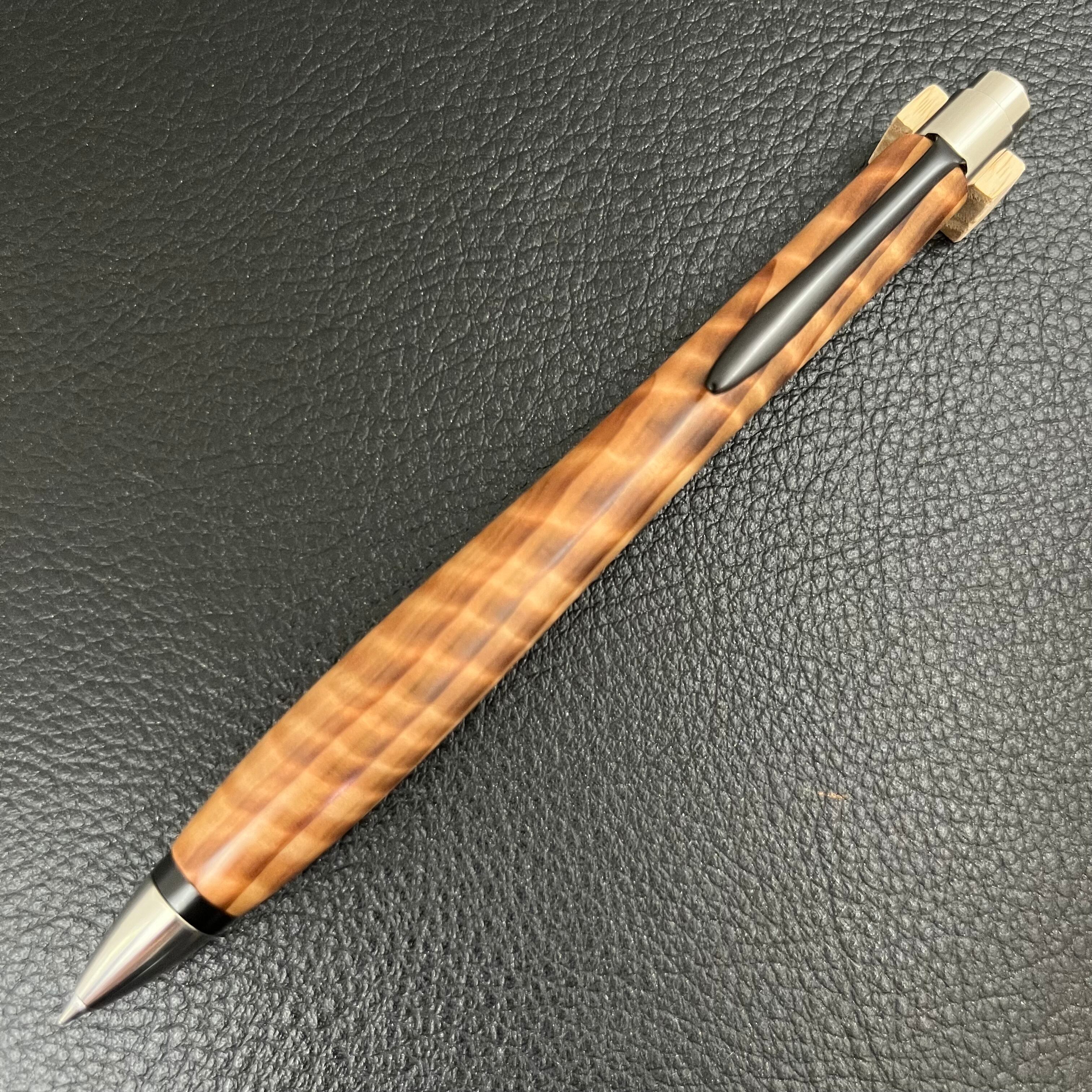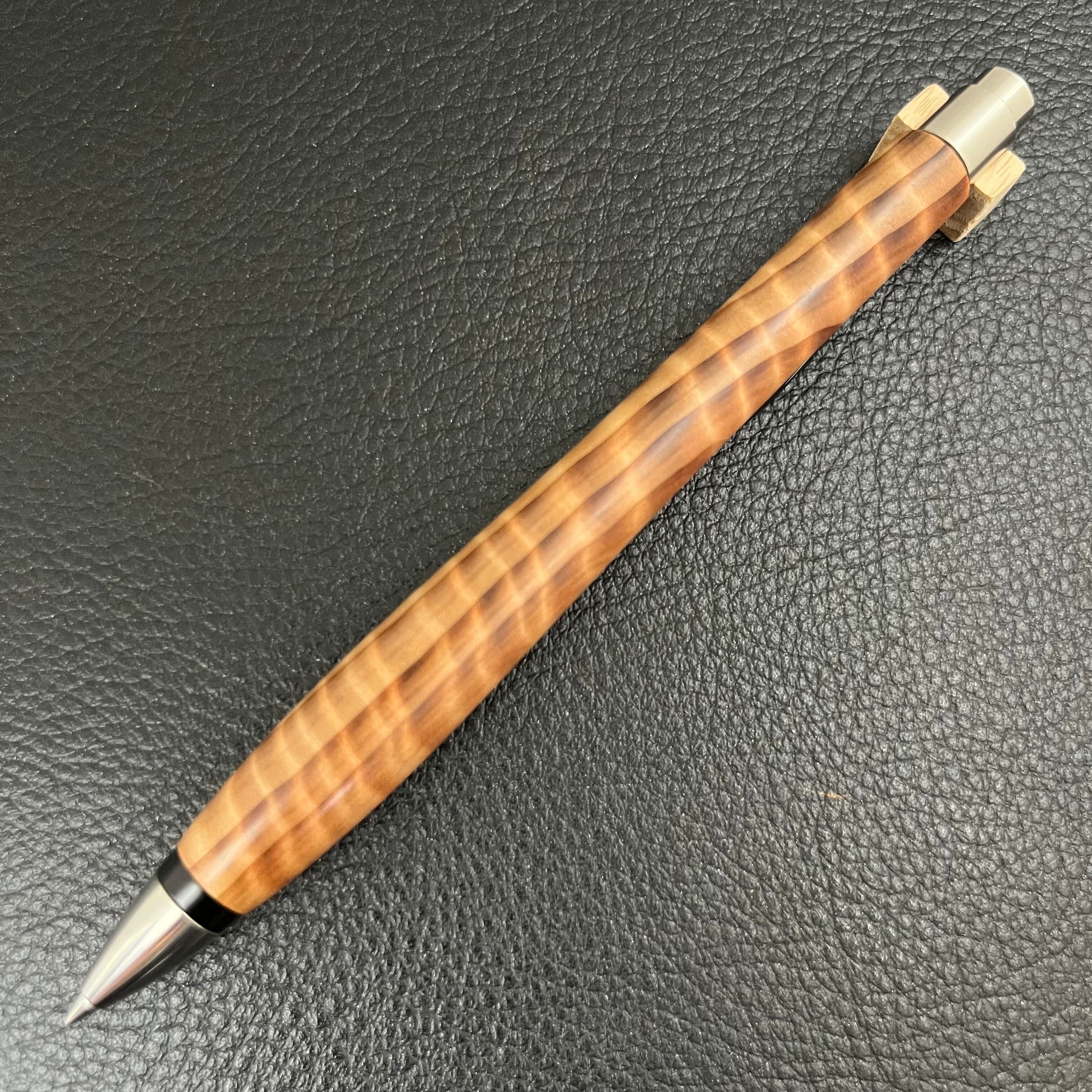ボールペンのノックシステムは、ドイツ最高のクリックメカニズムを採用してあります。このメカニズムはユニークな機構のため、クリックしたときのカチカチ音が静かで、どんな場所でも気兼ねなく使うことができます。滑らかに動くこのプッシュ感覚を一度味わうと他には戻れなくなってしまうほどの魅力があります。 100分の1単位の加工精度で削り出されたペン先は、軸ブレも全くありません。