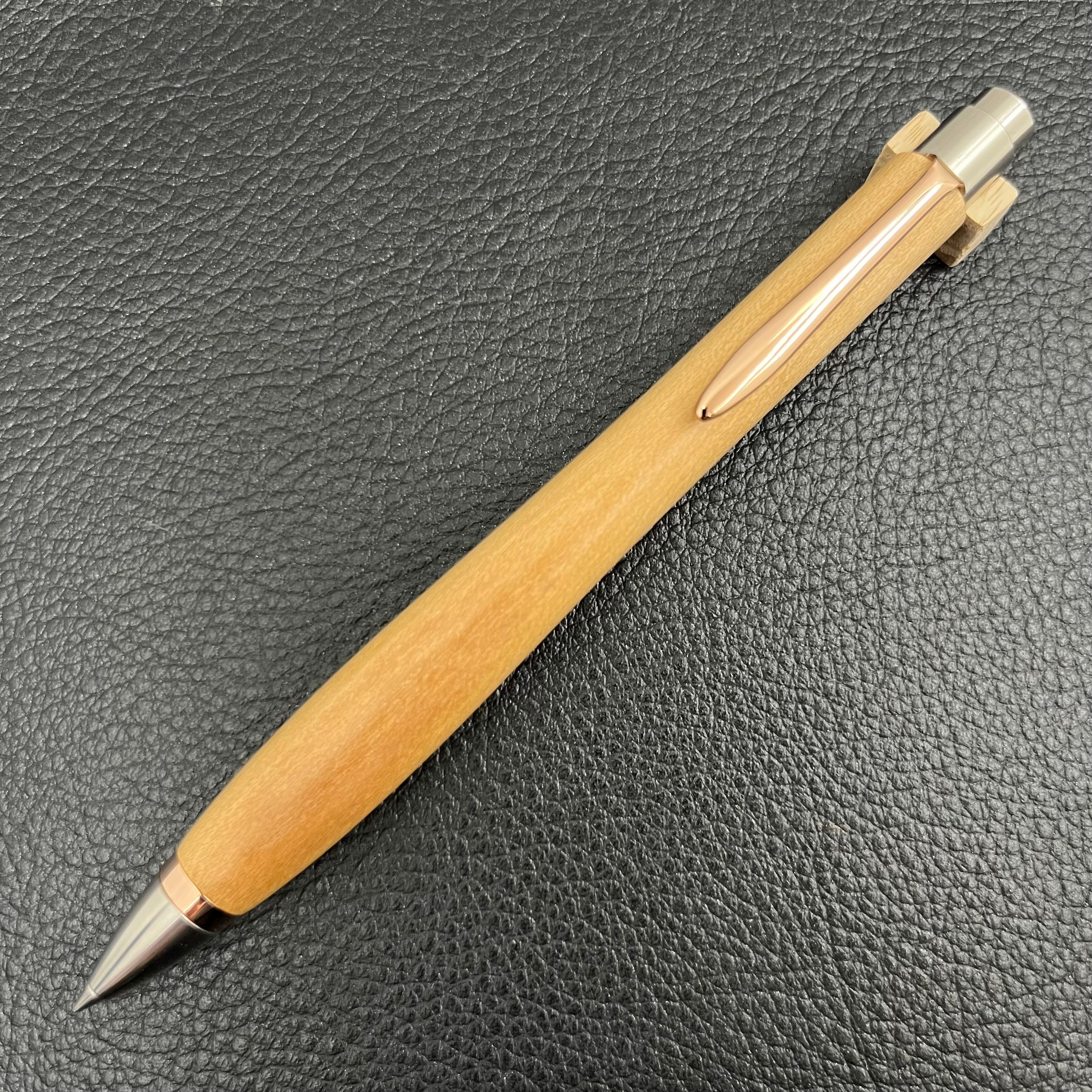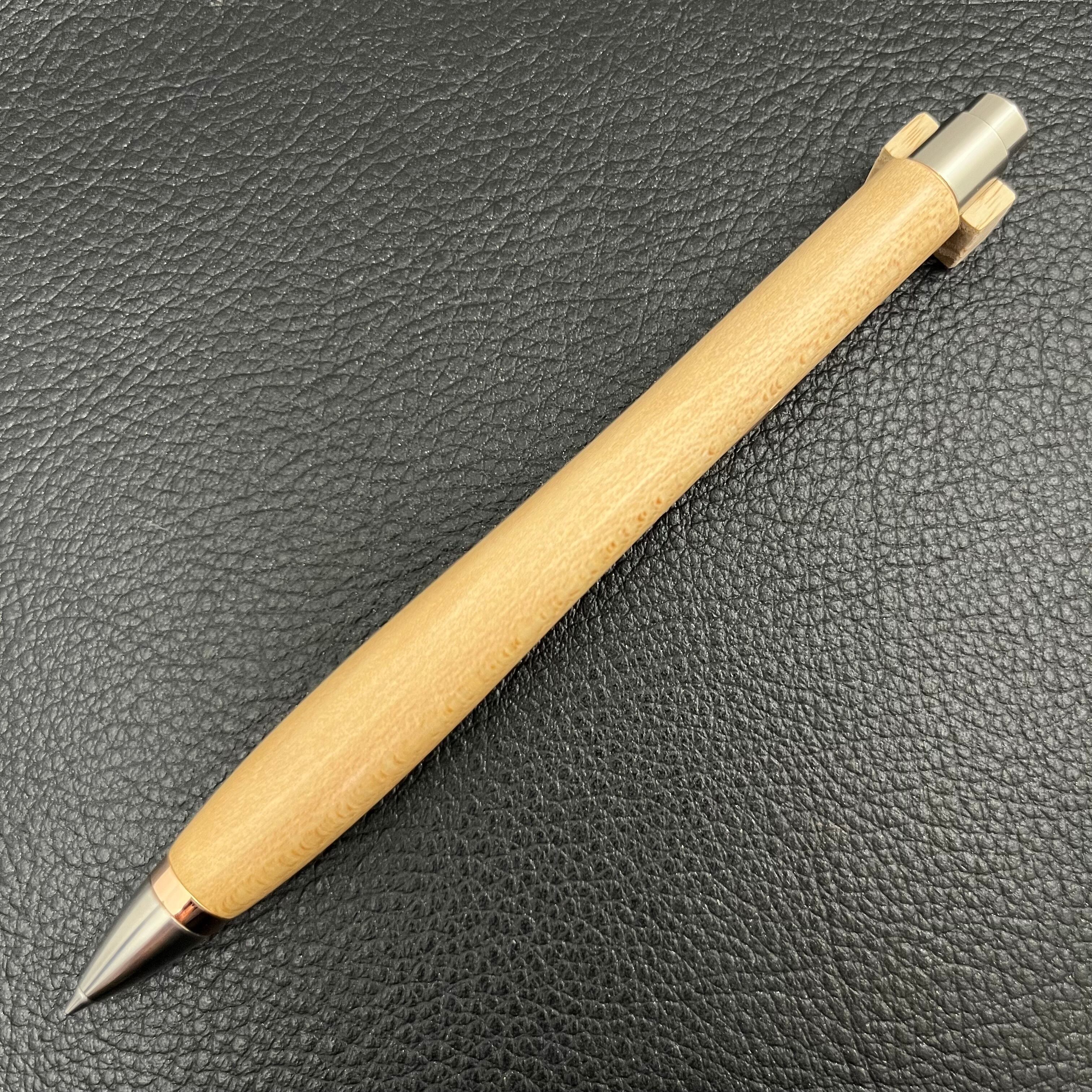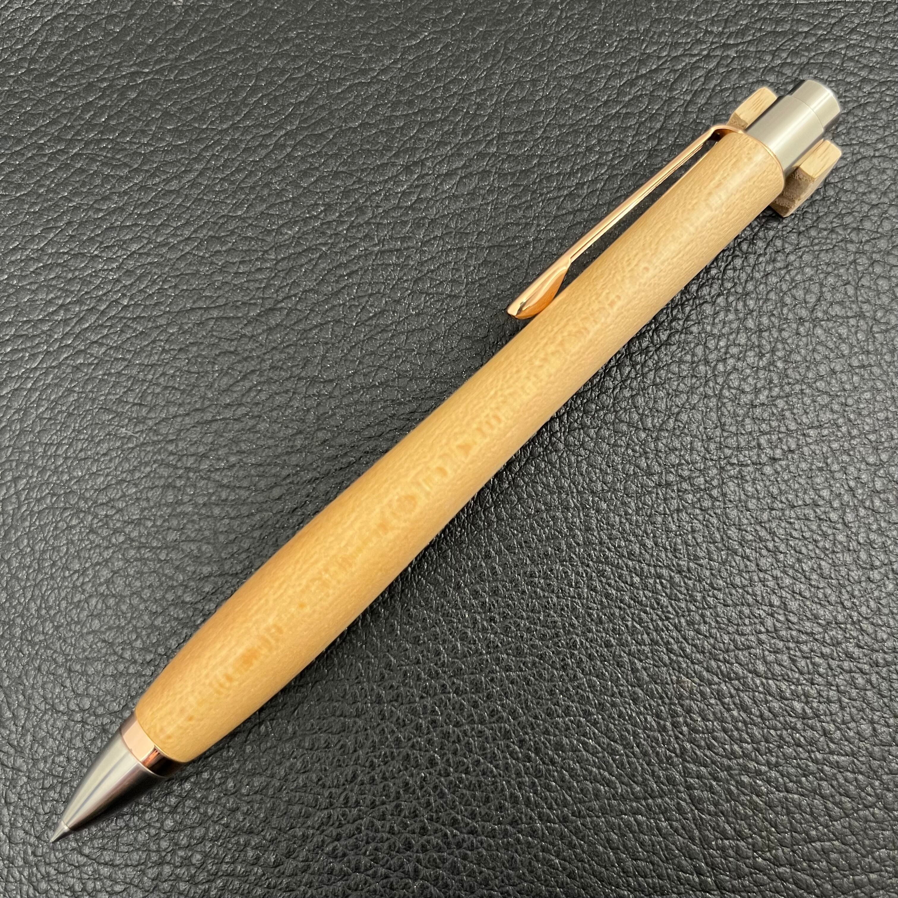 ボールペンのノックシステムは、ドイツ最高のクリックメカニズムを採用してあります。このメカニズムはユニークな機構のため、クリックしたときのカチカチ音が静かで、どんな場所でも気兼ねなく使うことができます。滑らかに動くこのプッシュ感覚を一度味わうと他には戻れなくなってしまうほどの魅力があります。 100分の1単位の加工精度で削り出されたペン先は、軸ブレも全くありません。