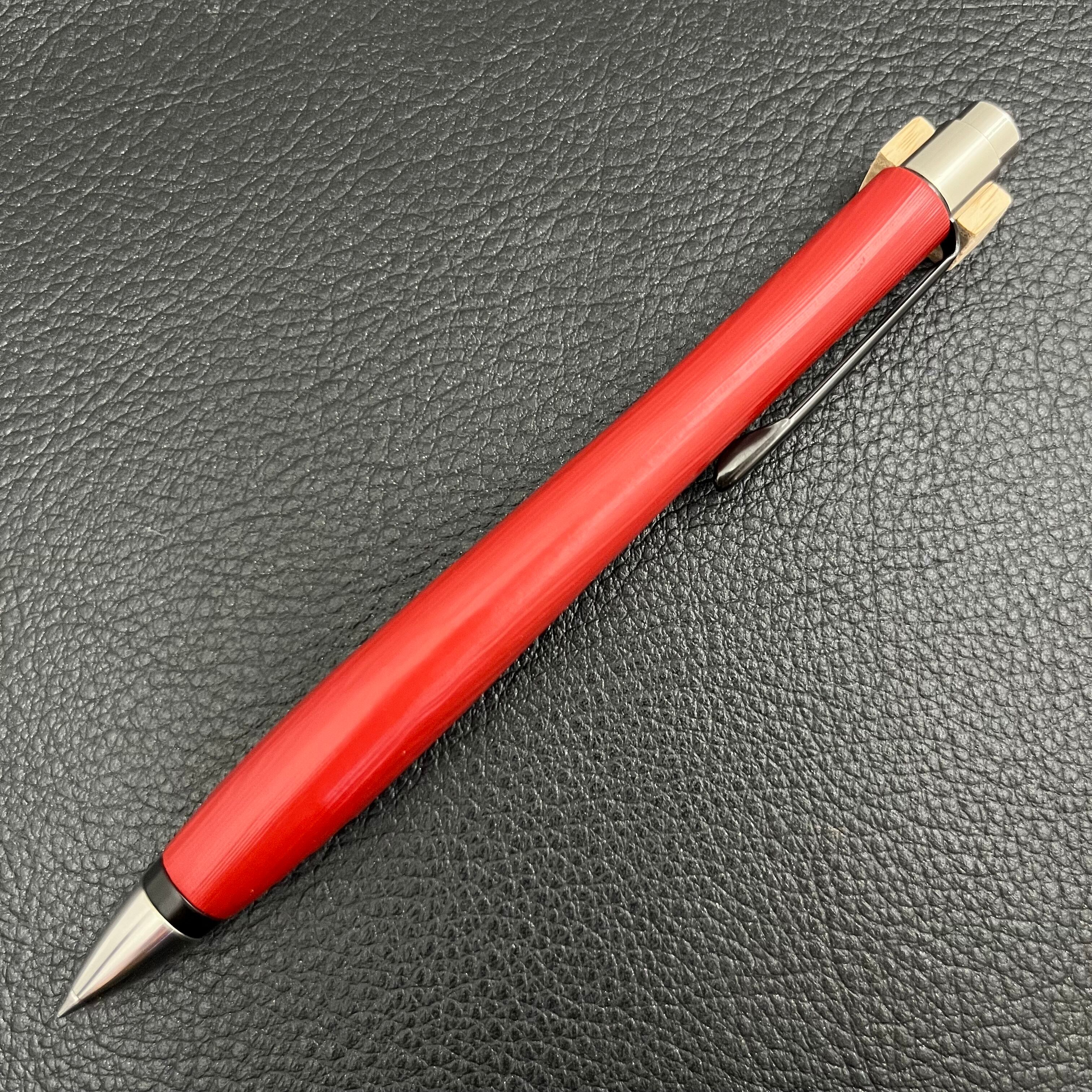 ボールペンのノックシステムは、ドイツ最高のクリックメカニズムを採用してあります。このメカニズムはユニークな機構のため、クリックしたときのカチカチ音が静かで、どんな場所でも気兼ねなく使うことができます。滑らかに動くこのプッシュ感覚を一度味わうと他には戻れなくなってしまうほどの魅力があります。 100分の1単位の加工精度で削り出されたペン先は、軸ブレも全くありません。