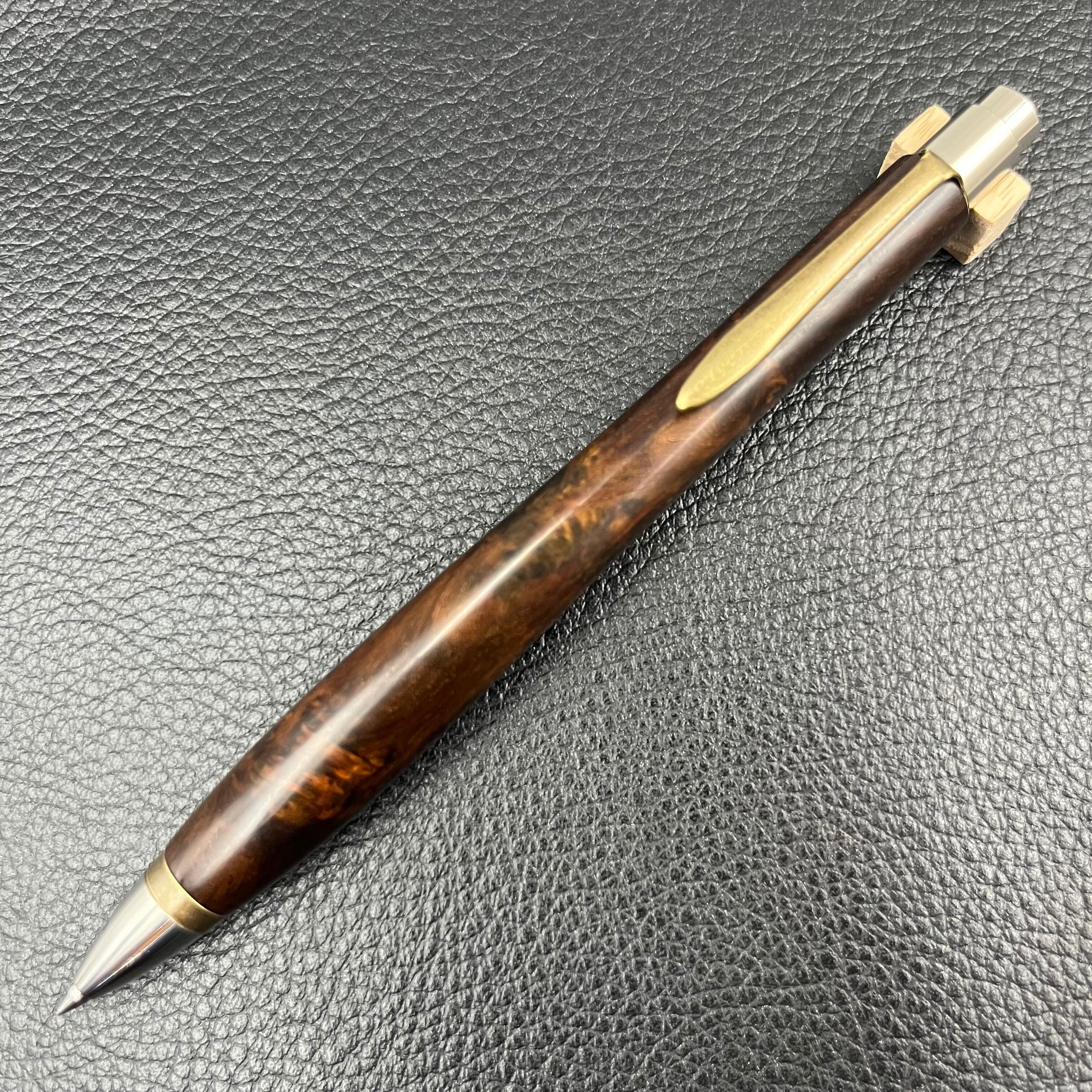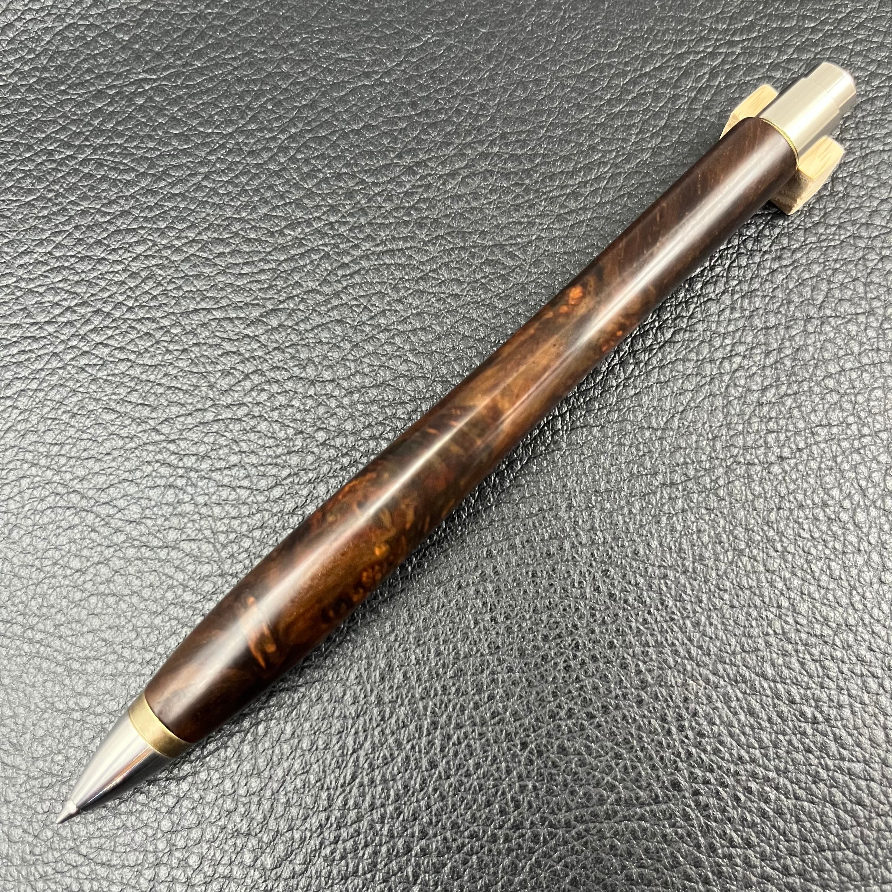 ボールペンのノックシステムは、ドイツ最高のクリックメカニズムを採用してあります。このメカニズムはユニークな機構のため、クリックしたときのカチカチ音が静かで、どんな場所でも気兼ねなく使うことができます。滑らかに動くこのプッシュ感覚を一度味わうと他には戻れなくなってしまうほどの魅力があります。 100分の1単位の加工精度で削り出されたペン先は、軸ブレも全くありません。