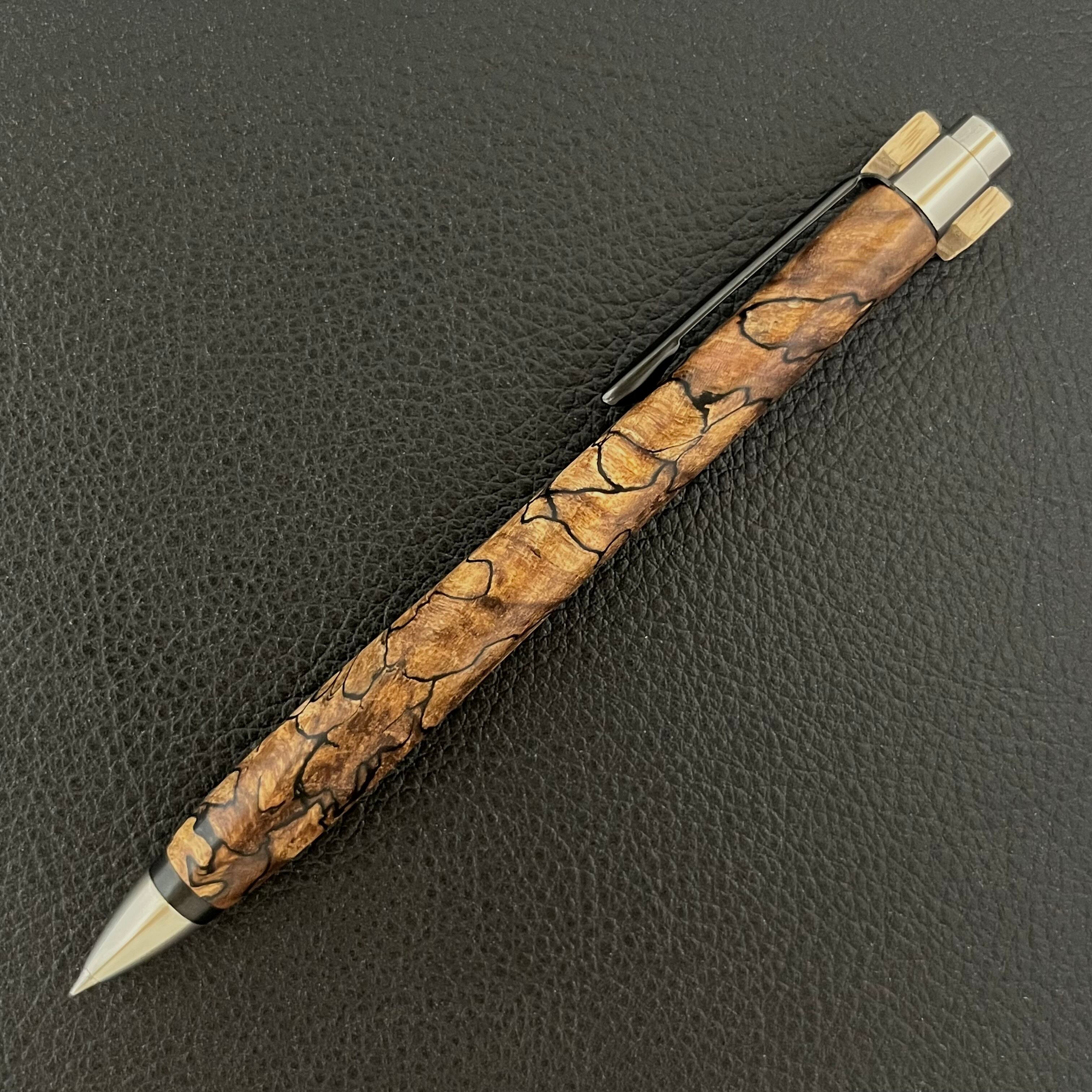 ボールペンのノックシステムは、ドイツ最高のクリックメカニズムを採用してあります。このメカニズムはユニークな機構のため、クリックしたときのカチカチ音が静かで、どんな場所でも気兼ねなく使うことができます。滑らかに動くこのプッシュ感覚を一度味わうと他には戻れなくなってしまうほどの魅力があります。 100分の1単位の加工精度で削り出されたペン先は、軸ブレも全くありません。