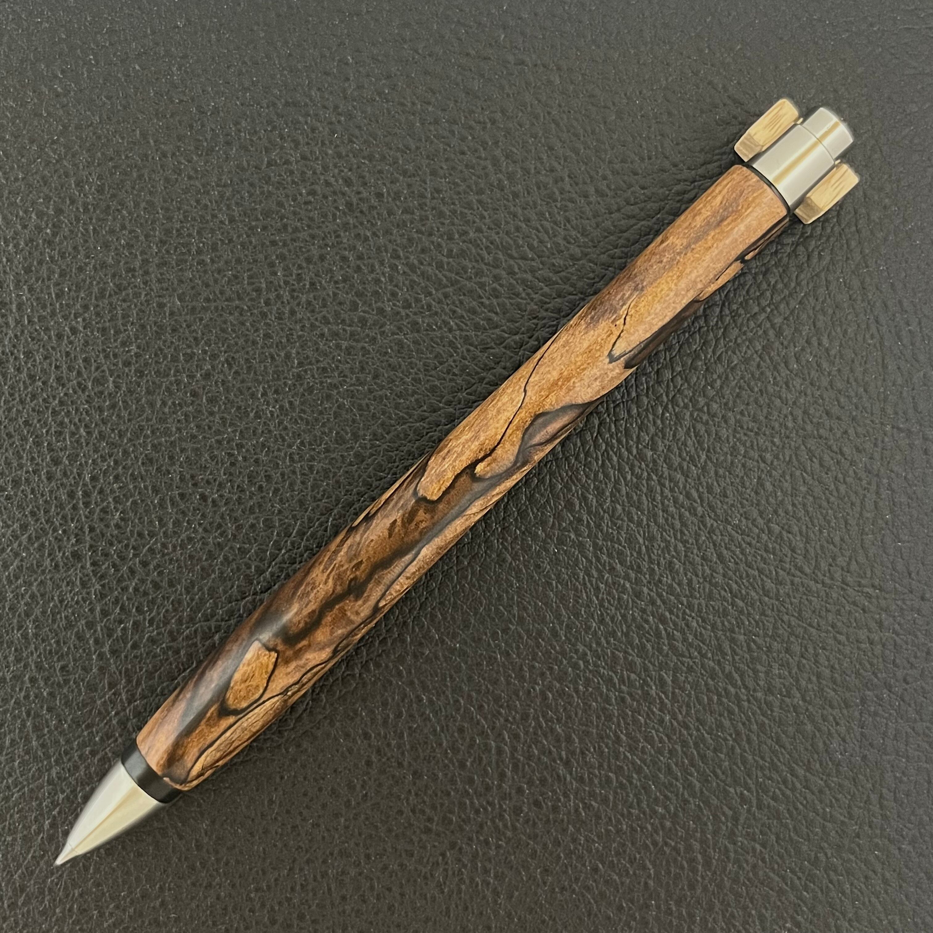 ボールペンのノックシステムは、ドイツ最高のクリックメカニズムを採用してあります。このメカニズムはユニークな機構のため、クリックしたときのカチカチ音が静かで、どんな場所でも気兼ねなく使うことができます。滑らかに動くこのプッシュ感覚を一度味わうと他には戻れなくなってしまうほどの魅力があります。 100分の1単位の加工精度で削り出されたペン先は、軸ブレも全くありません。