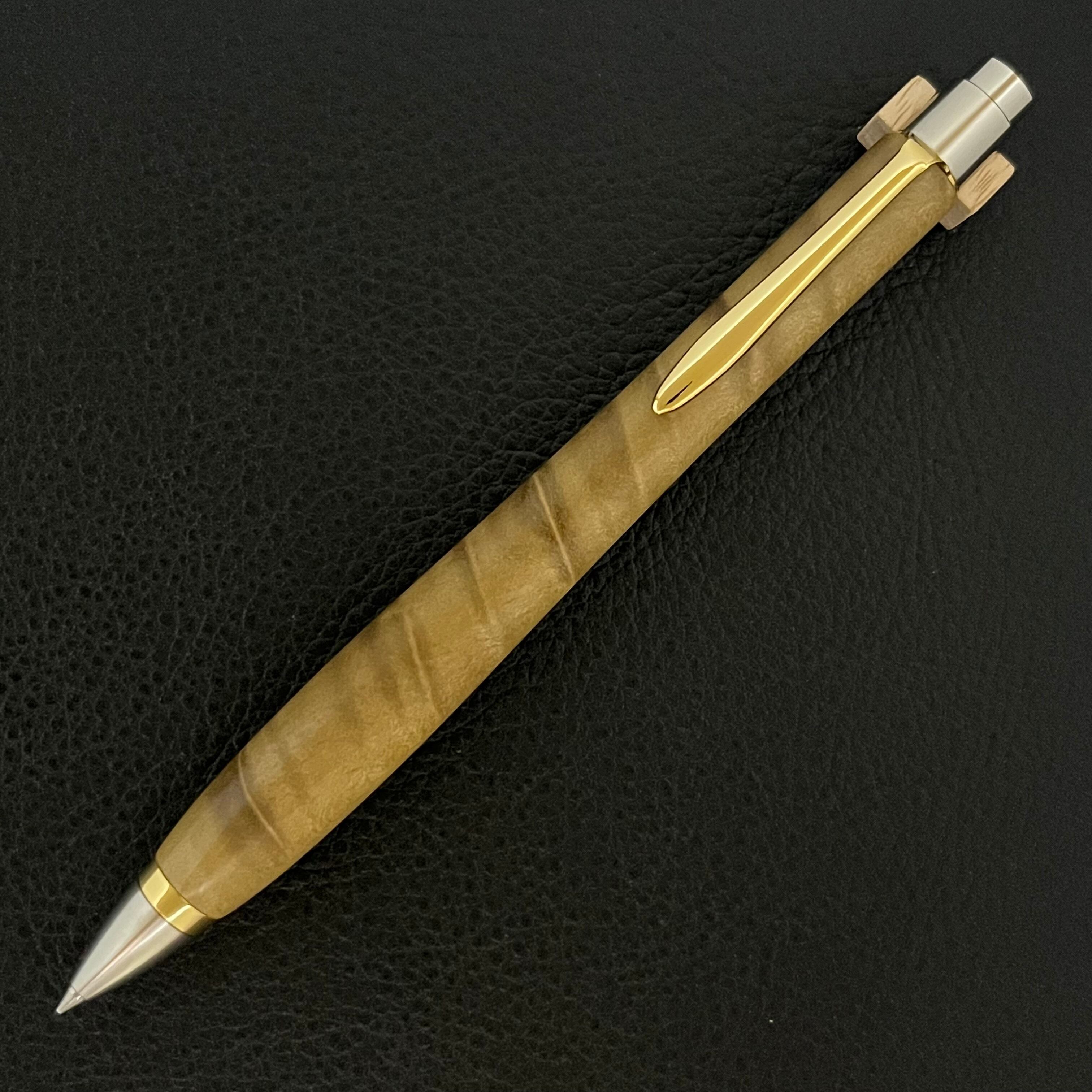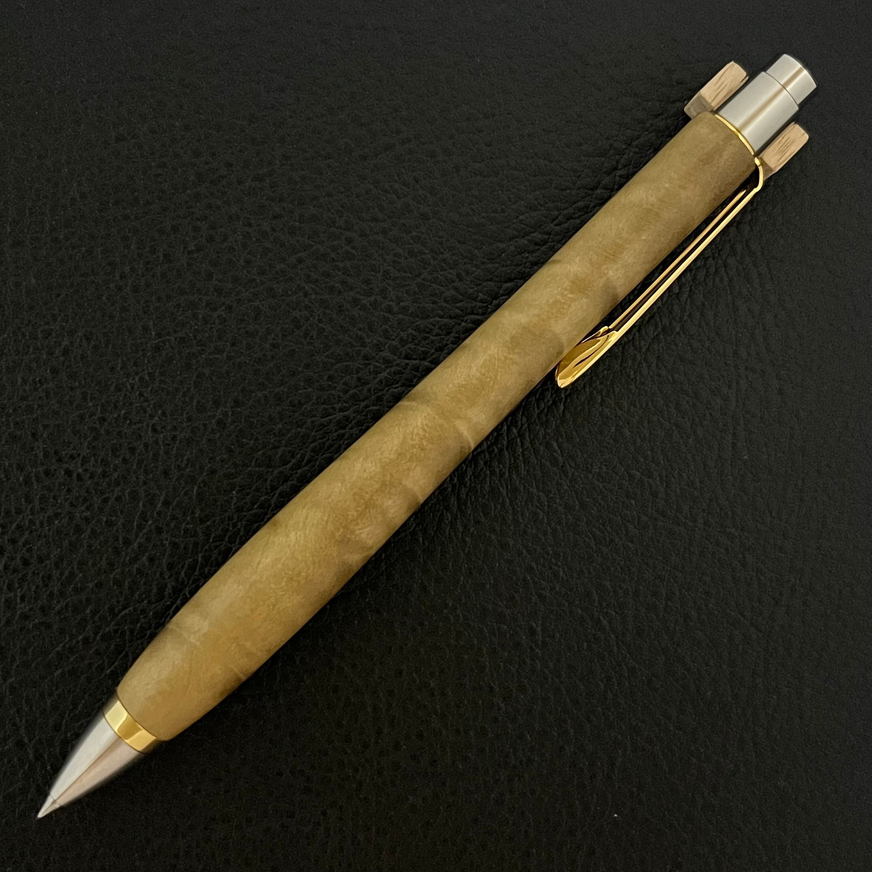 ボールペンのノックシステムは、ドイツ最高のクリックメカニズムを採用してあります。このメカニズムはユニークな機構のため、クリックしたときのカチカチ音が静かで、どんな場所でも気兼ねなく使うことができます。滑らかに動くこのプッシュ感覚を一度味わうと他には戻れなくなってしまうほどの魅力があります。 100分の1単位の加工精度で削り出されたペン先は、軸ブレも全くありません。