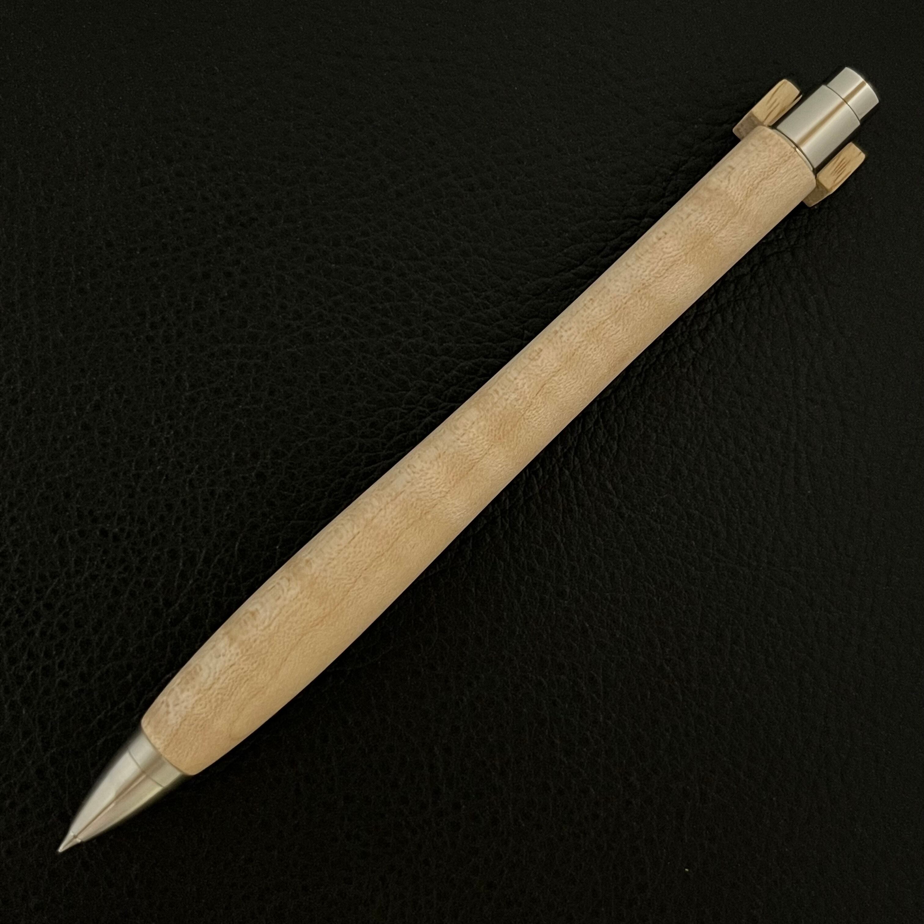 ボールペンのノックシステムは、ドイツ最高のクリックメカニズムを採用してあります。このメカニズムはユニークな機構のため、クリックしたときのカチカチ音が静かで、どんな場所でも気兼ねなく使うことができます。滑らかに動くこのプッシュ感覚を一度味わうと他には戻れなくなってしまうほどの魅力があります。 100分の1単位の加工精度で削り出されたペン先は、軸ブレも全くありません。