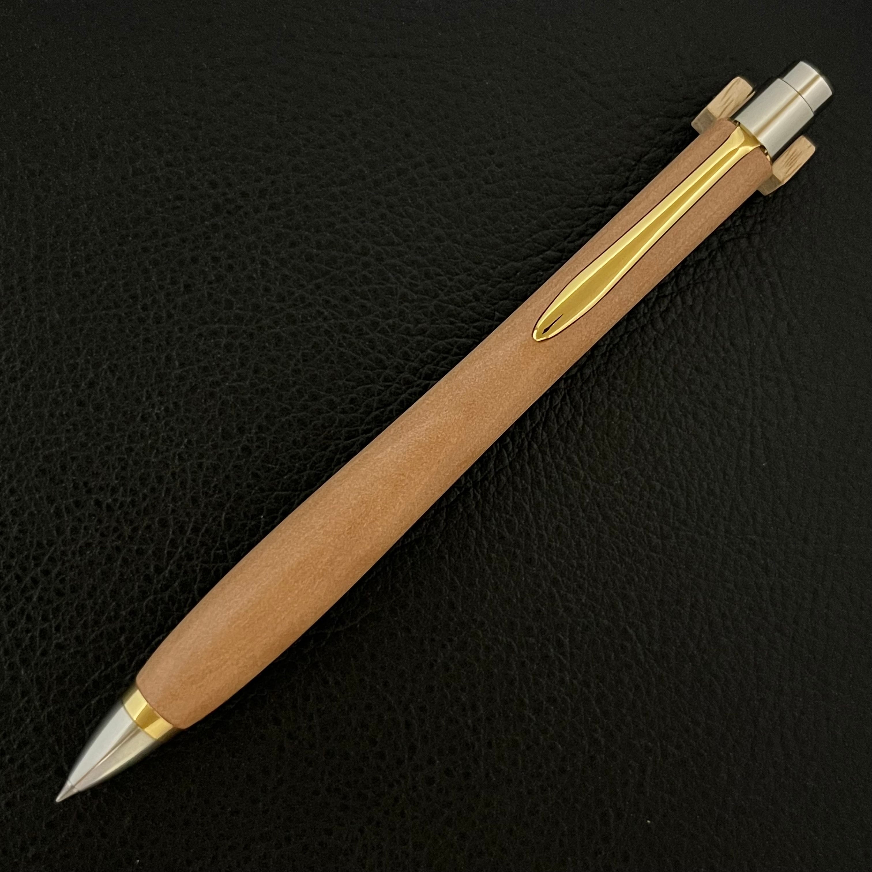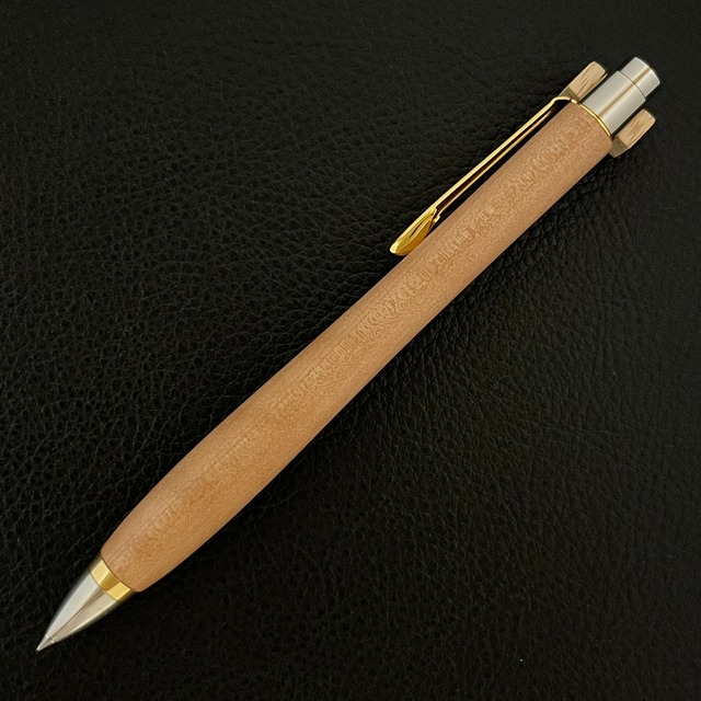 ボールペンのノックシステムは、ドイツ最高のクリックメカニズムを採用してあります。このメカニズムはユニークな機構のため、クリックしたときのカチカチ音が静かで、どんな場所でも気兼ねなく使うことができます。滑らかに動くこのプッシュ感覚を一度味わうと他には戻れなくなってしまうほどの魅力があります。 100分の1単位の加工精度で削り出されたペン先は、軸ブレも全くありません。