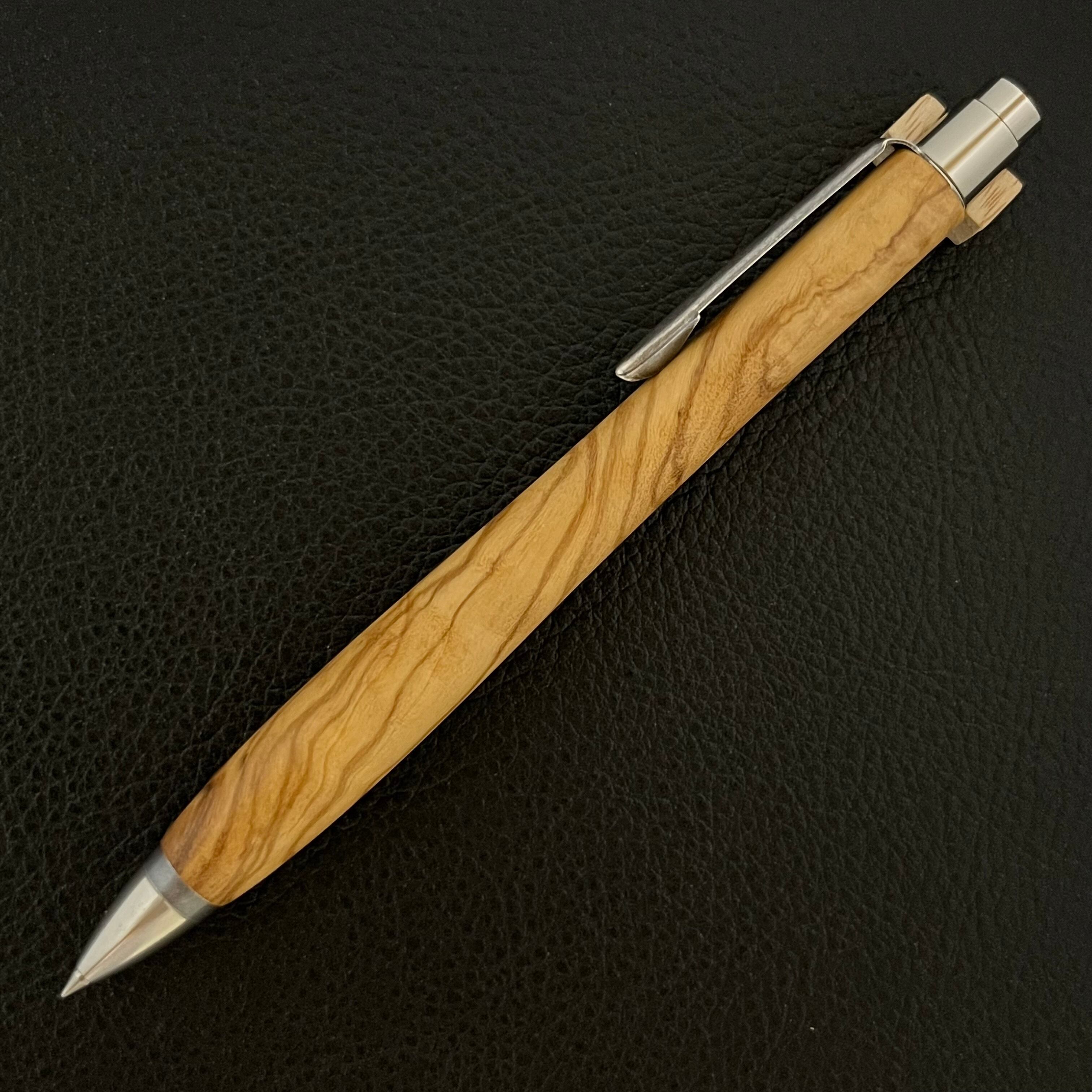 ボールペンのノックシステムは、ドイツ最高のクリックメカニズムを採用してあります。このメカニズムはユニークな機構のため、クリックしたときのカチカチ音が静かで、どんな場所でも気兼ねなく使うことができます。滑らかに動くこのプッシュ感覚を一度味わうと他には戻れなくなってしまうほどの魅力があります。 100分の1単位の加工精度で削り出されたペン先は、軸ブレも全くありません。