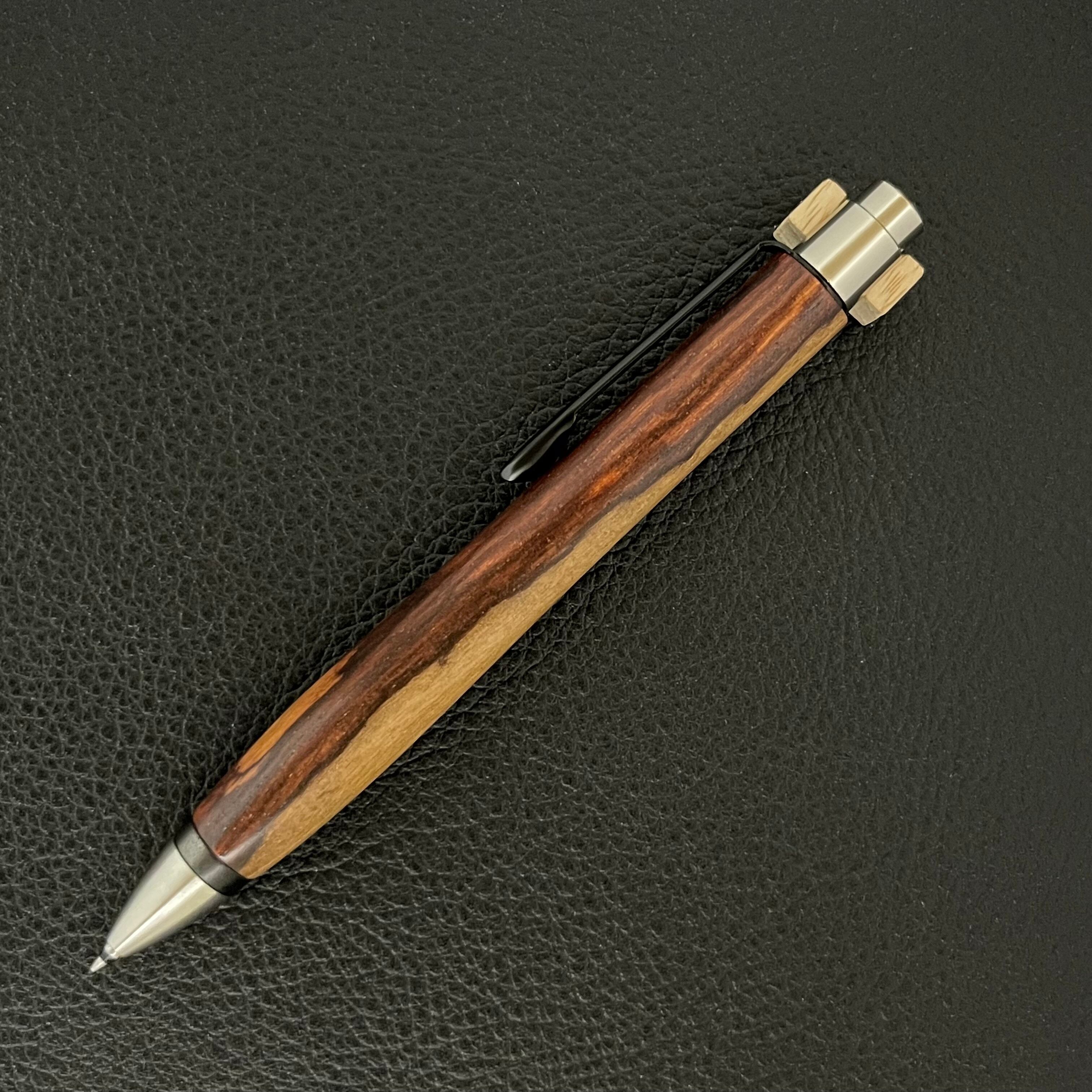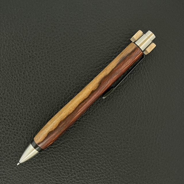 ボールペンのノックシステムは、ドイツ最高のクリックメカニズムを採用してあります。このメカニズムはユニークな機構のため、クリックしたときのカチカチ音が静かで、どんな場所でも気兼ねなく使うことができます。滑らかに動くこのプッシュ感覚を一度味わうと他には戻れなくなってしまうほどの魅力があります。 高級ステンレス材を100分の1単位の加工精度で削り出された口金により芯ブレも全くありません。内部のアルミを使ったリフィルアダプターもオリジナルです。