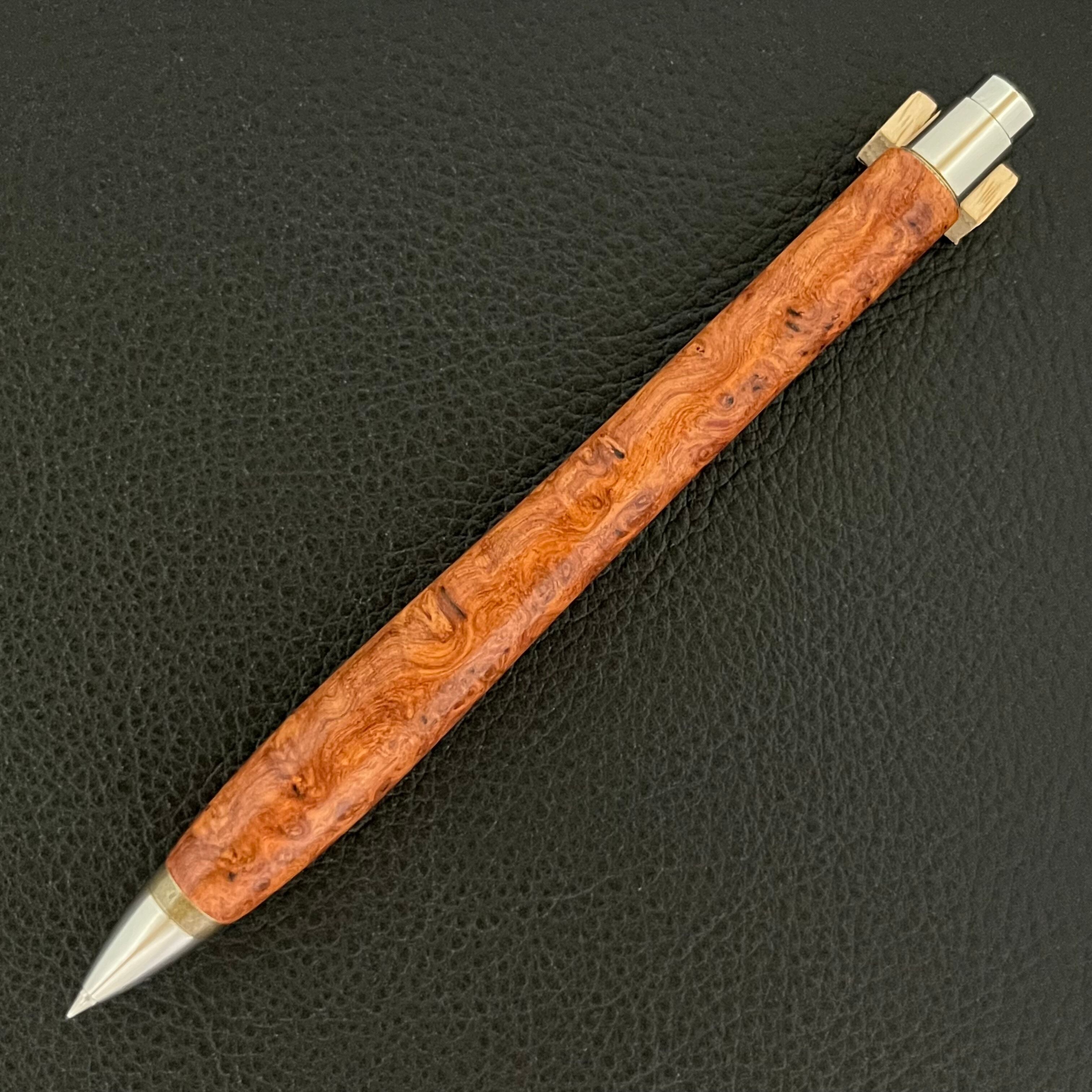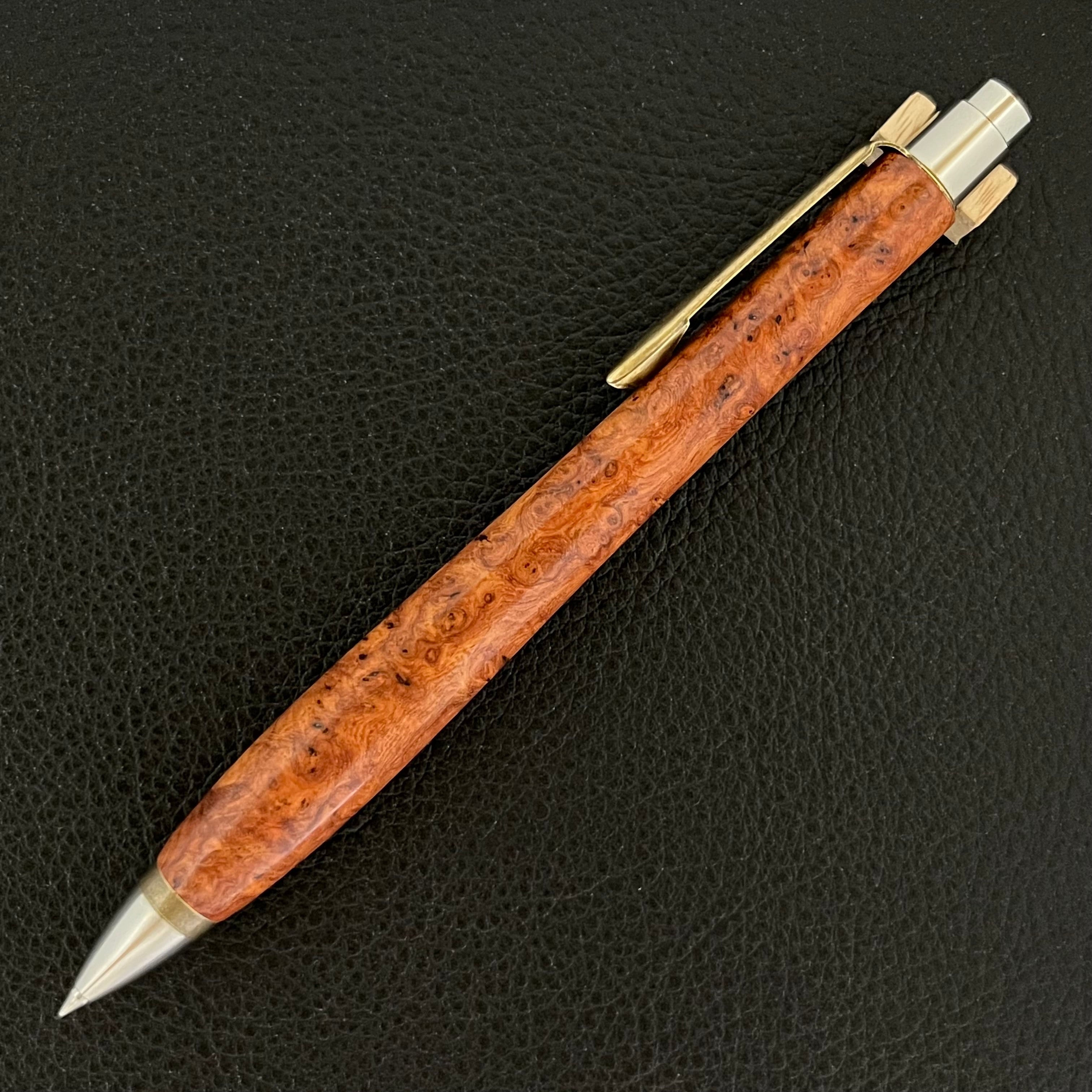 ボールペンのノックシステムは、ドイツ最高のクリックメカニズムを採用してあります。このメカニズムはユニークな機構のため、クリックしたときのカチカチ音が静かで、どんな場所でも気兼ねなく使うことができます。滑らかに動くこのプッシュ感覚を一度味わうと他には戻れなくなってしまうほどの魅力があります。 100分の1単位の加工精度で削り出されたペン先は、軸ブレも全くありません。