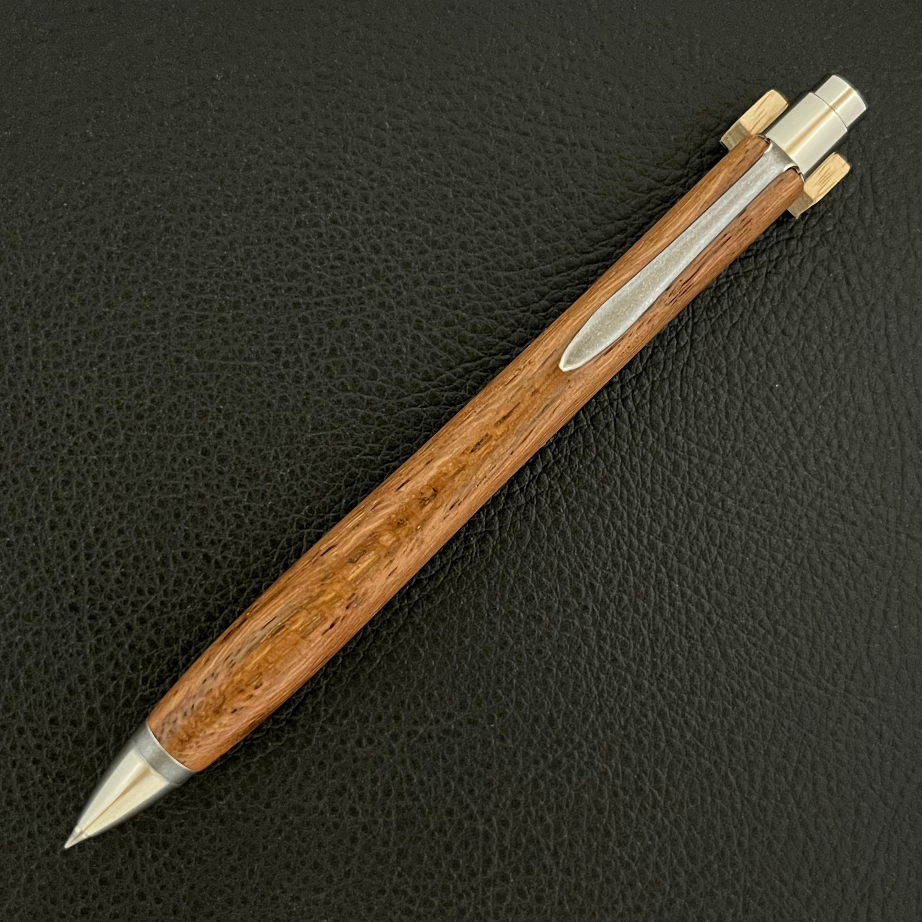 ボールペンのノックシステムは、ドイツ最高のクリックメカニズムを採用してあります。このメカニズムはユニークな機構のため、クリックしたときのカチカチ音が静かで、どんな場所でも気兼ねなく使うことができます。滑らかに動くこのプッシュ感覚を一度味わうと他には戻れなくなってしまうほどの魅力があります。 100分の1単位の加工精度で削り出されたペン先は、軸ブレも全くありません。