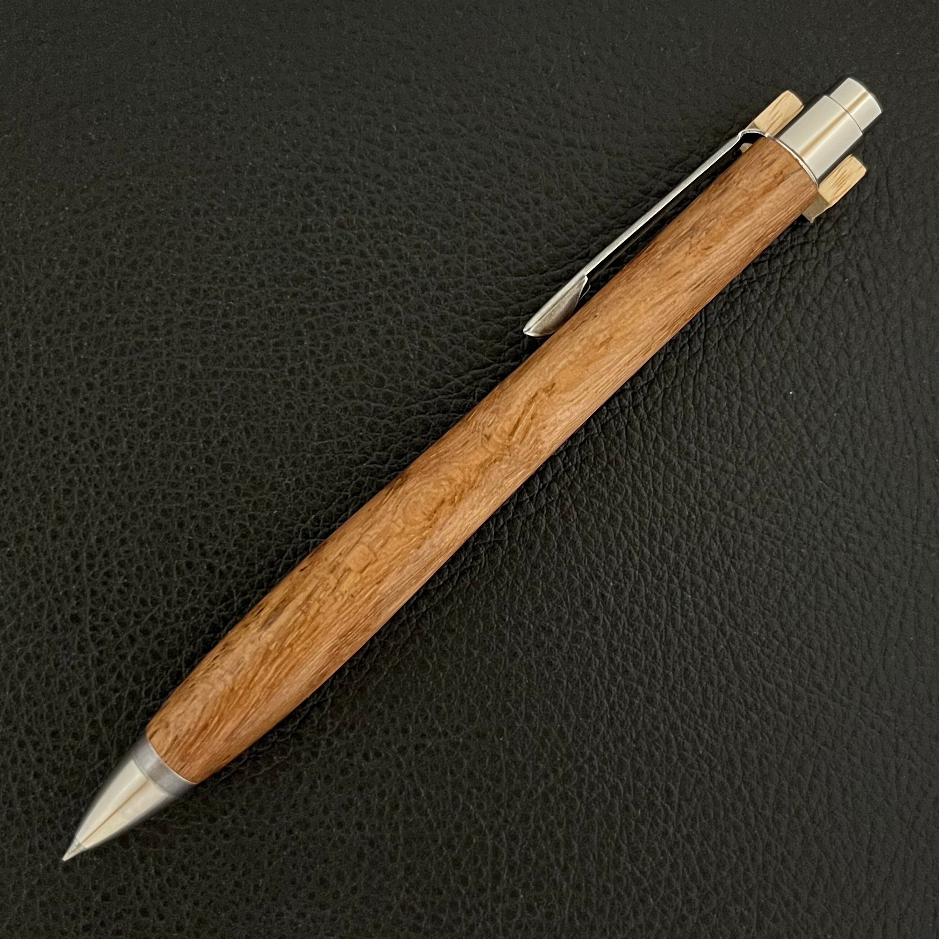 ボールペンのノックシステムは、ドイツ最高のクリックメカニズムを採用してあります。このメカニズムはユニークな機構のため、クリックしたときのカチカチ音が静かで、どんな場所でも気兼ねなく使うことができます。滑らかに動くこのプッシュ感覚を一度味わうと他には戻れなくなってしまうほどの魅力があります。 100分の1単位の加工精度で削り出されたペン先は、軸ブレも全くありません。