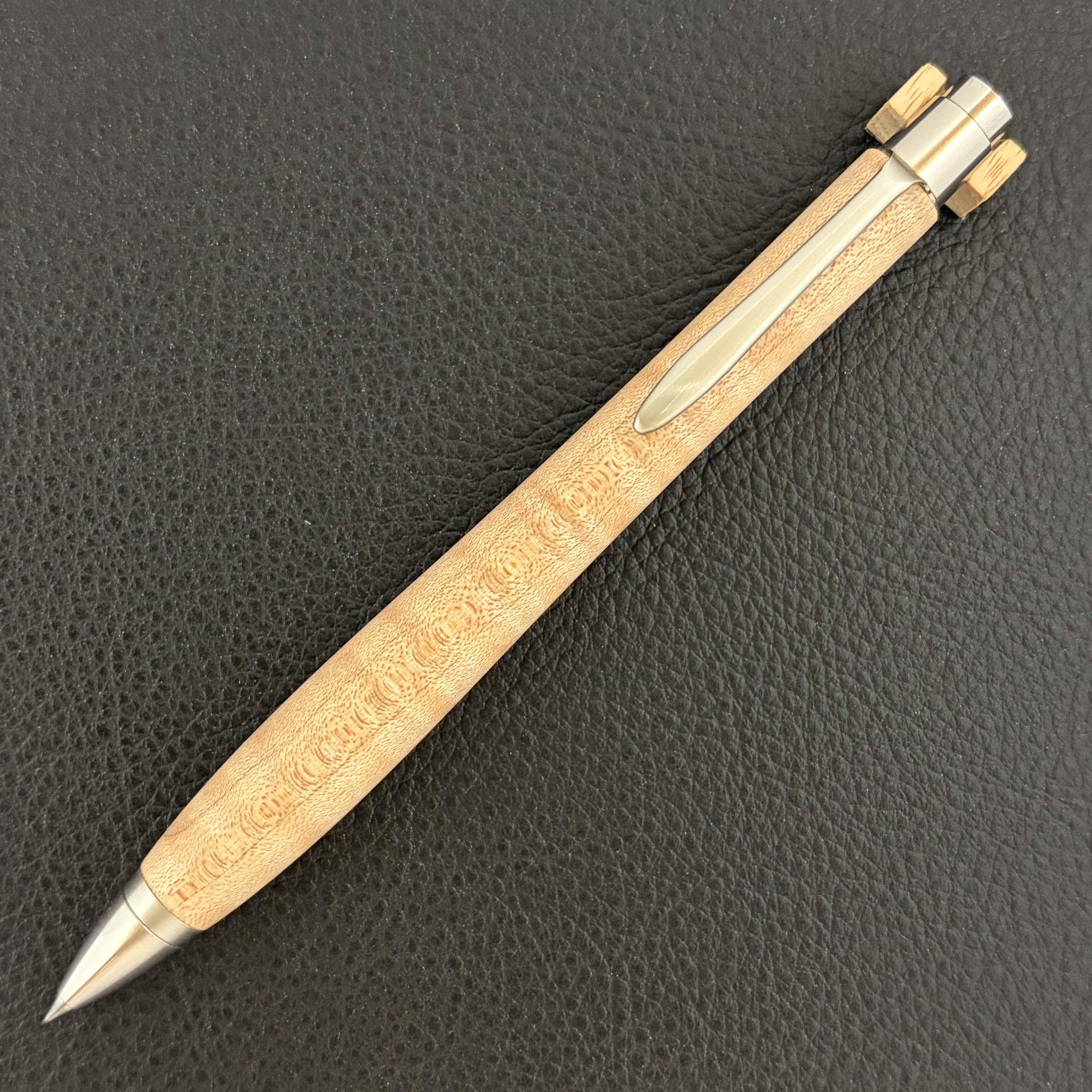 ボールペンのノックシステムは、ドイツ最高のクリックメカニズムを採用してあります。このメカニズムはユニークな機構のため、クリックしたときのカチカチ音が静かで、どんな場所でも気兼ねなく使うことができます。滑らかに動くこのプッシュ感覚を一度味わうと他には戻れなくなってしまうほどの魅力があります。 100分の1単位の加工精度で削り出されたペン先は、軸ブレも全くありません。