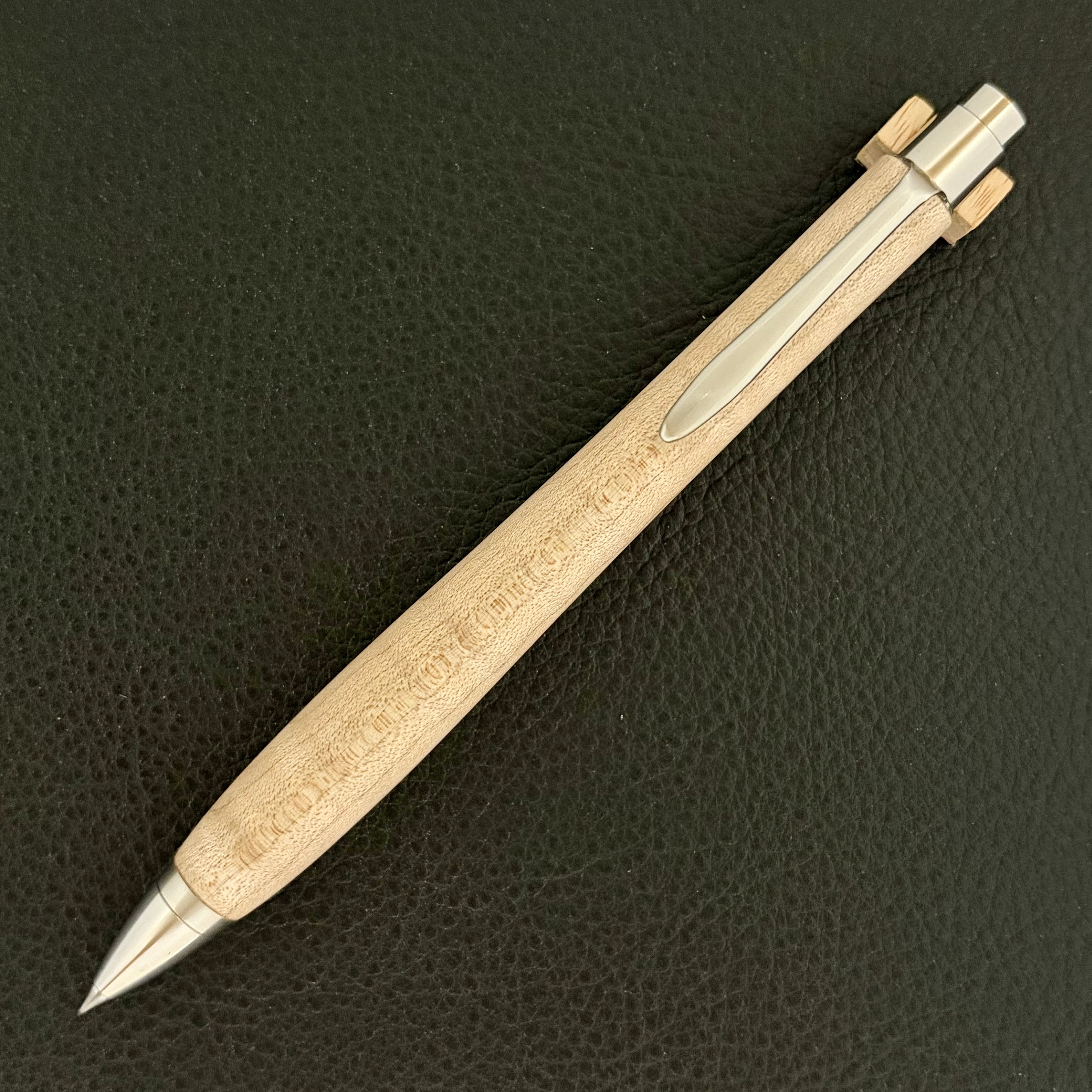 ボールペンのノックシステムは、ドイツ最高のクリックメカニズムを採用してあります。このメカニズムはユニークな機構のため、クリックしたときのカチカチ音が静かで、どんな場所でも気兼ねなく使うことができます。滑らかに動くこのプッシュ感覚を一度味わうと他には戻れなくなってしまうほどの魅力があります。 100分の1単位の加工精度で削り出されたペン先は、軸ブレも全くありません。