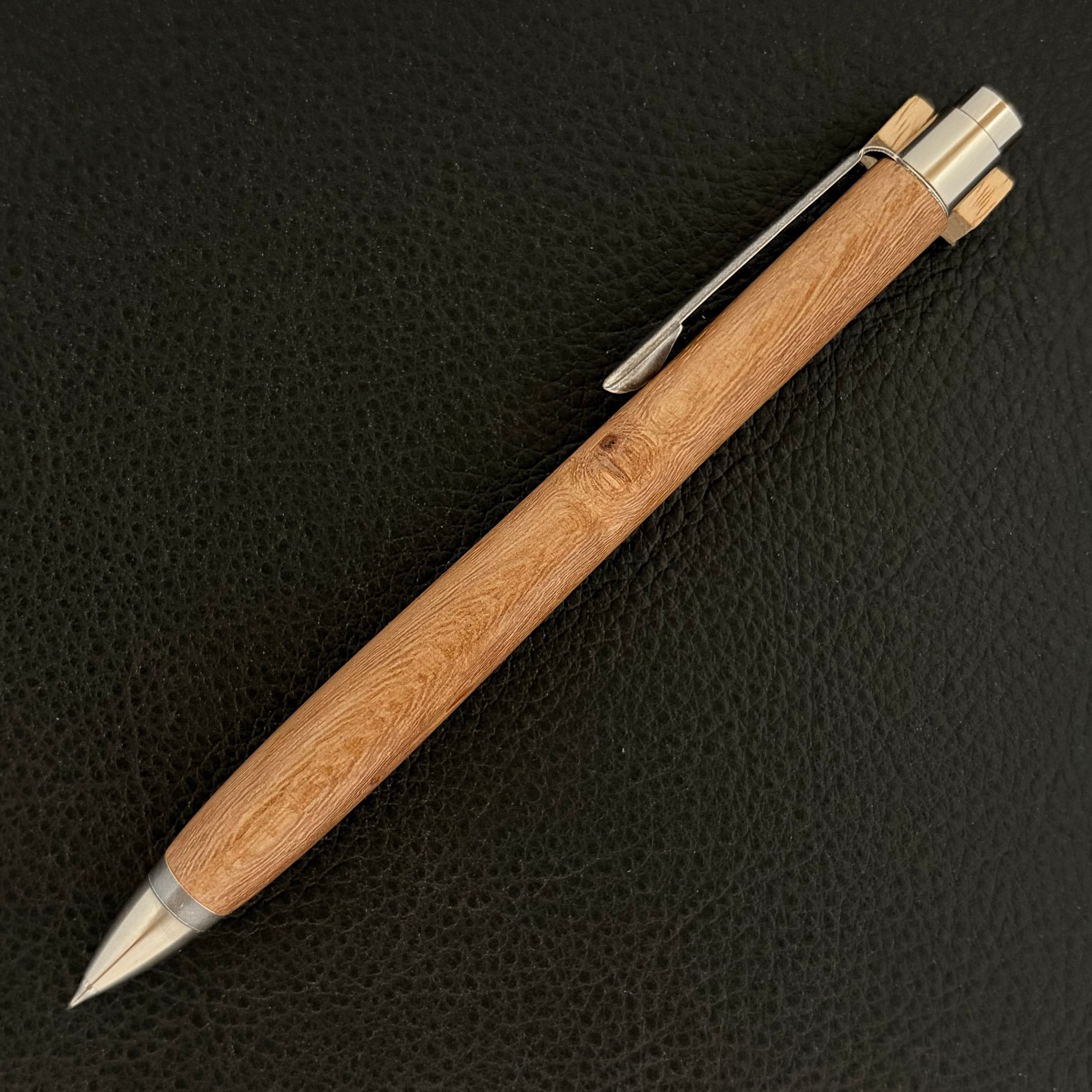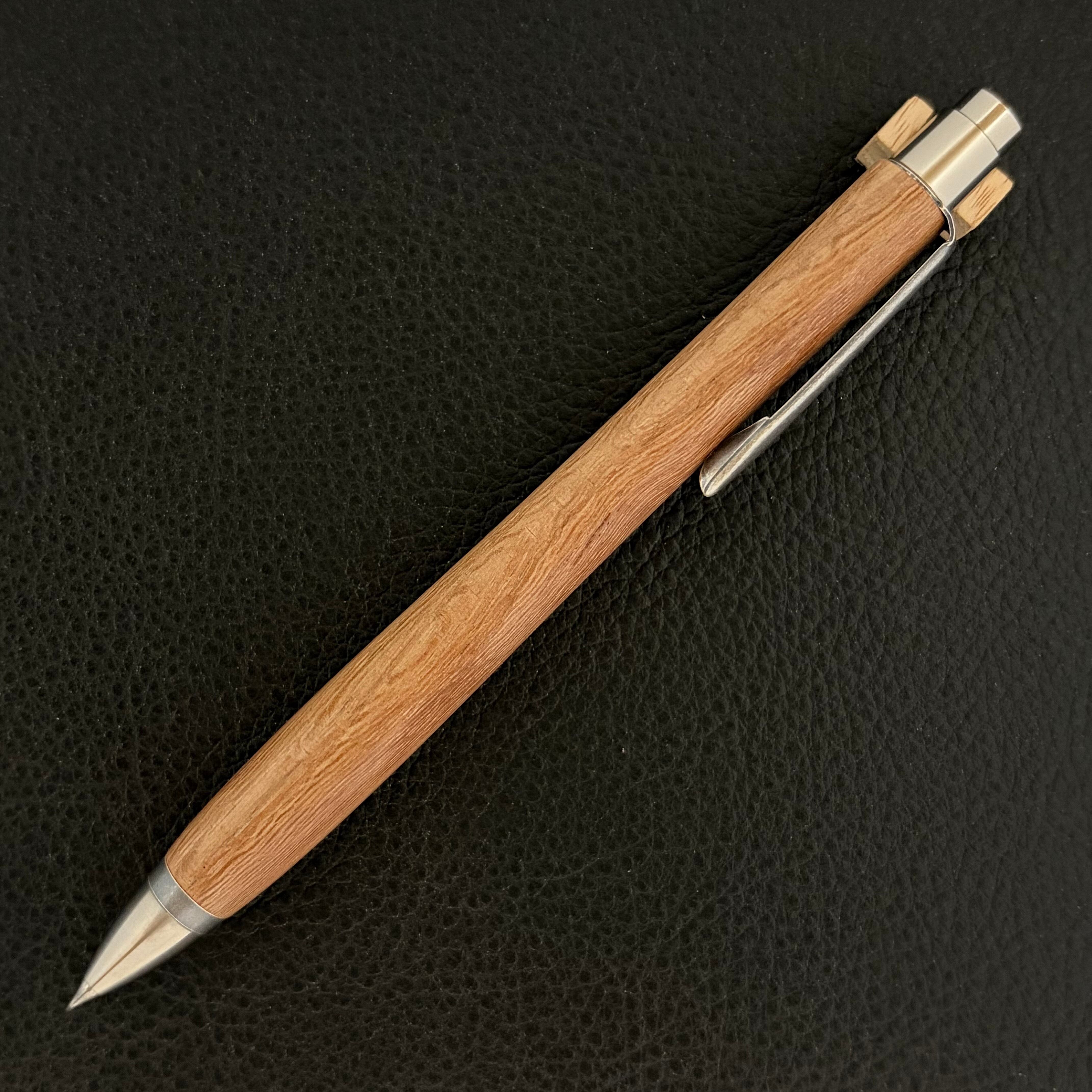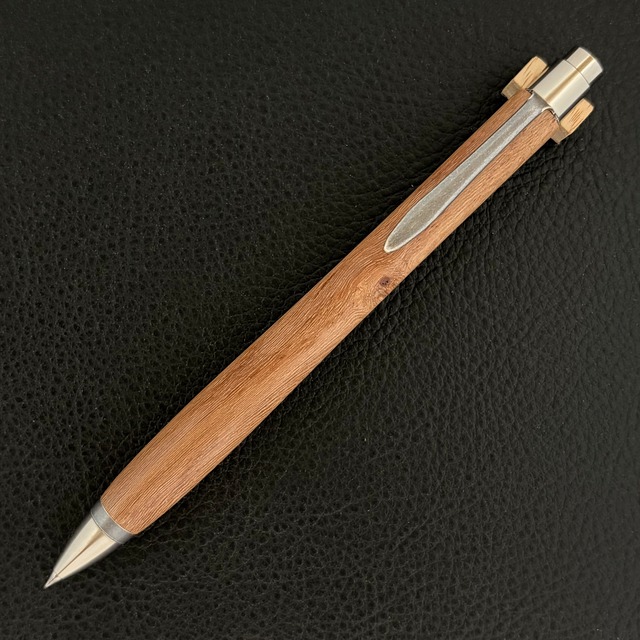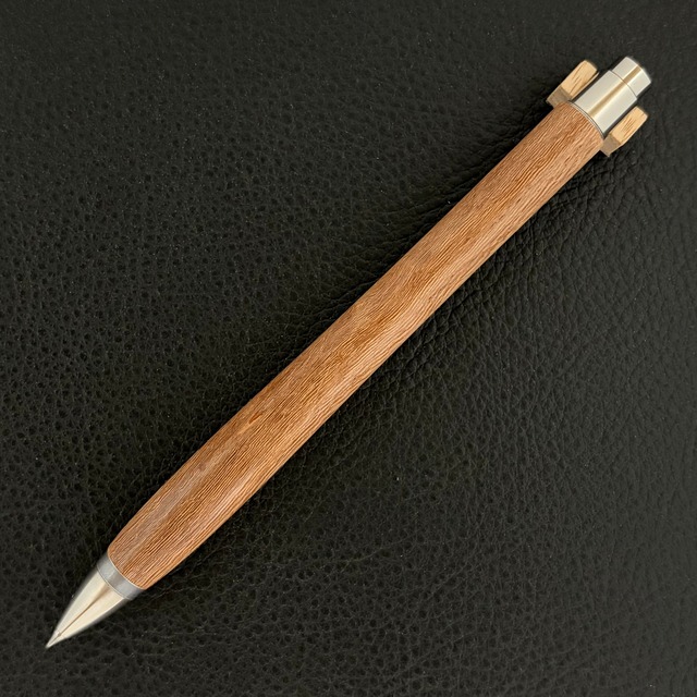 ボールペンのノックシステムは、ドイツ最高のクリックメカニズムを採用してあります。このメカニズムはユニークな機構のため、クリックしたときのカチカチ音が静かで、どんな場所でも気兼ねなく使うことができます。滑らかに動くこのプッシュ感覚を一度味わうと他には戻れなくなってしまうほどの魅力があります。 100分の1単位の加工精度で削り出されたペン先は、軸ブレも全くありません。