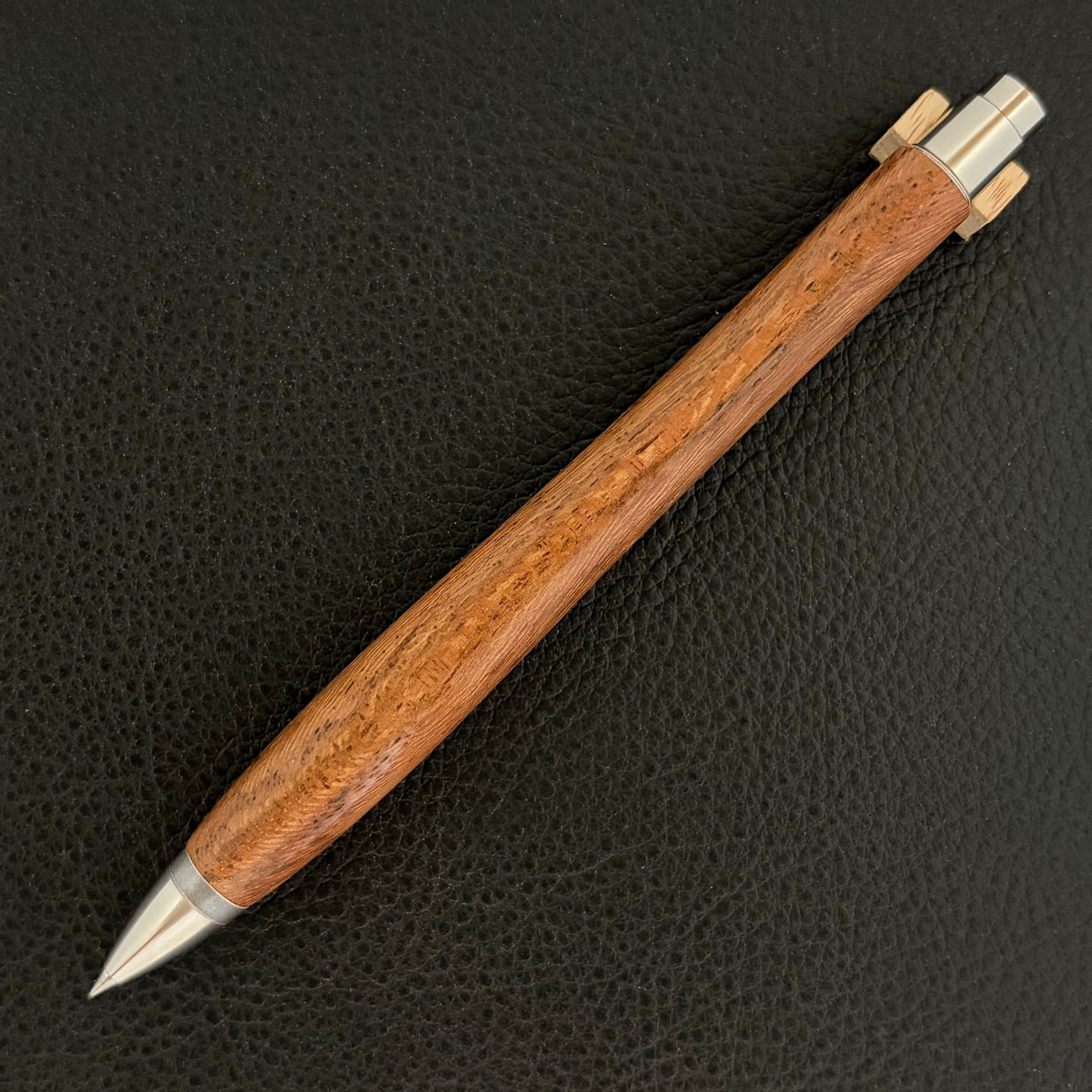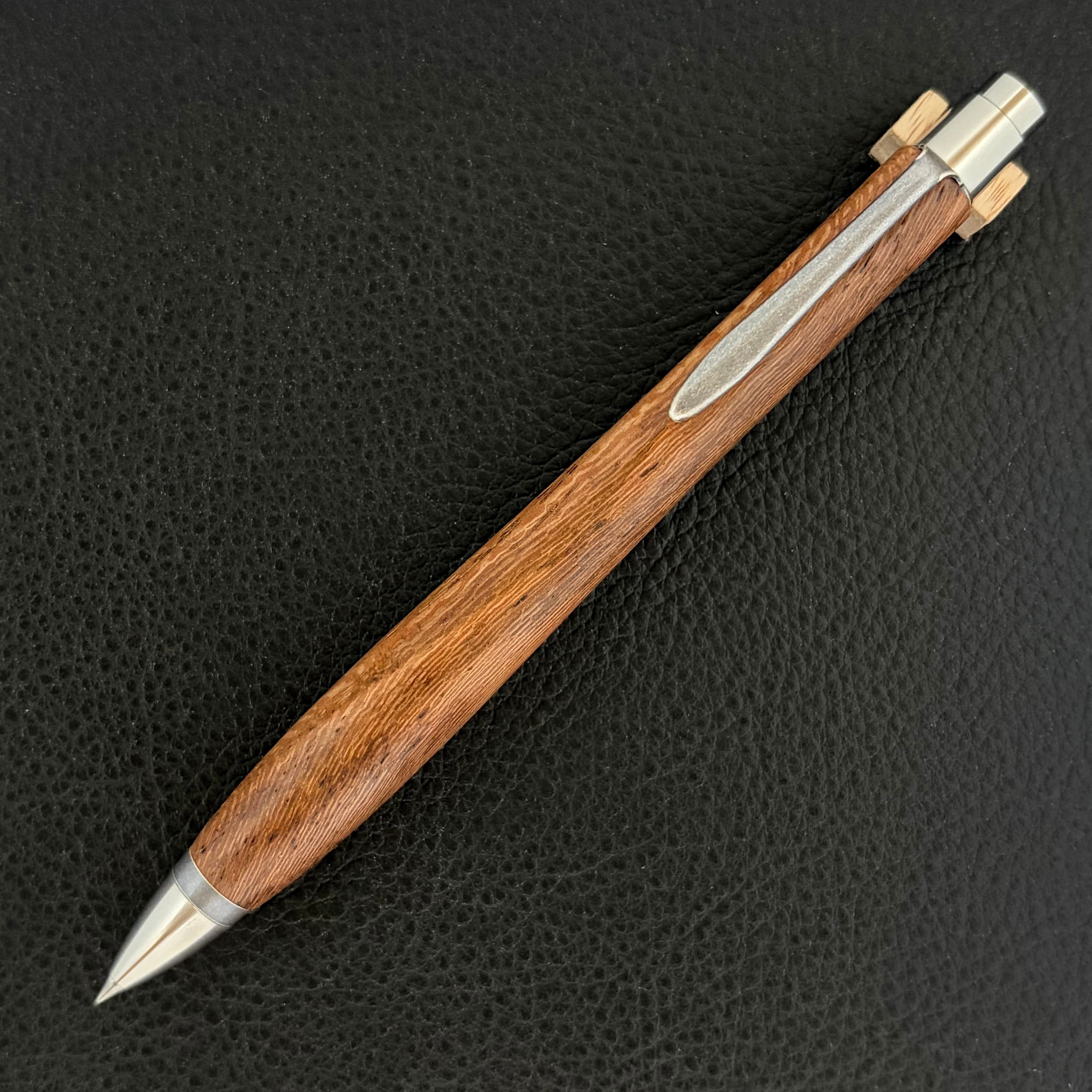 ボールペンのノックシステムは、ドイツ最高のクリックメカニズムを採用してあります。このメカニズムはユニークな機構のため、クリックしたときのカチカチ音が静かで、どんな場所でも気兼ねなく使うことができます。滑らかに動くこのプッシュ感覚を一度味わうと他には戻れなくなってしまうほどの魅力があります。 100分の1単位の加工精度で削り出されたペン先は、軸ブレも全くありません。