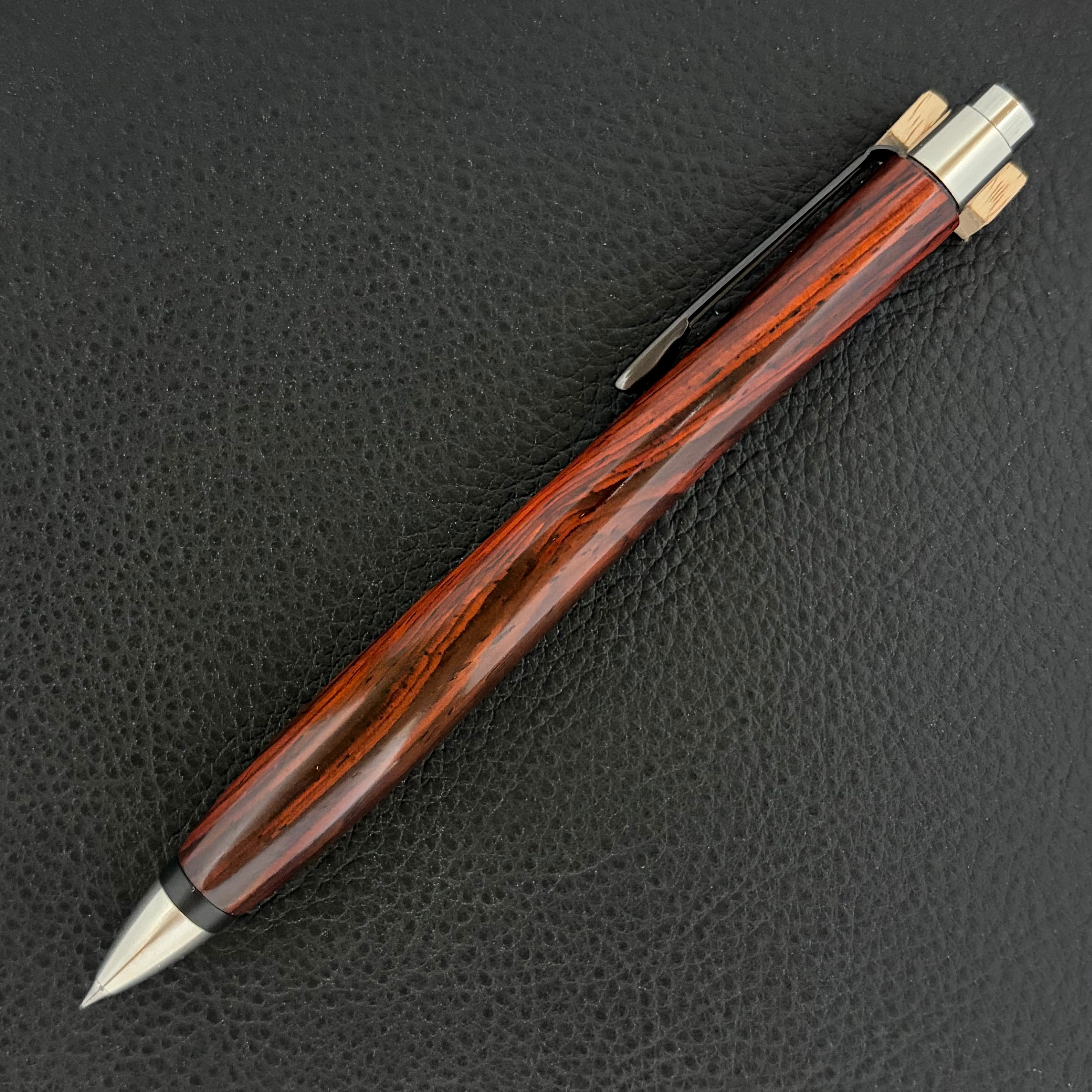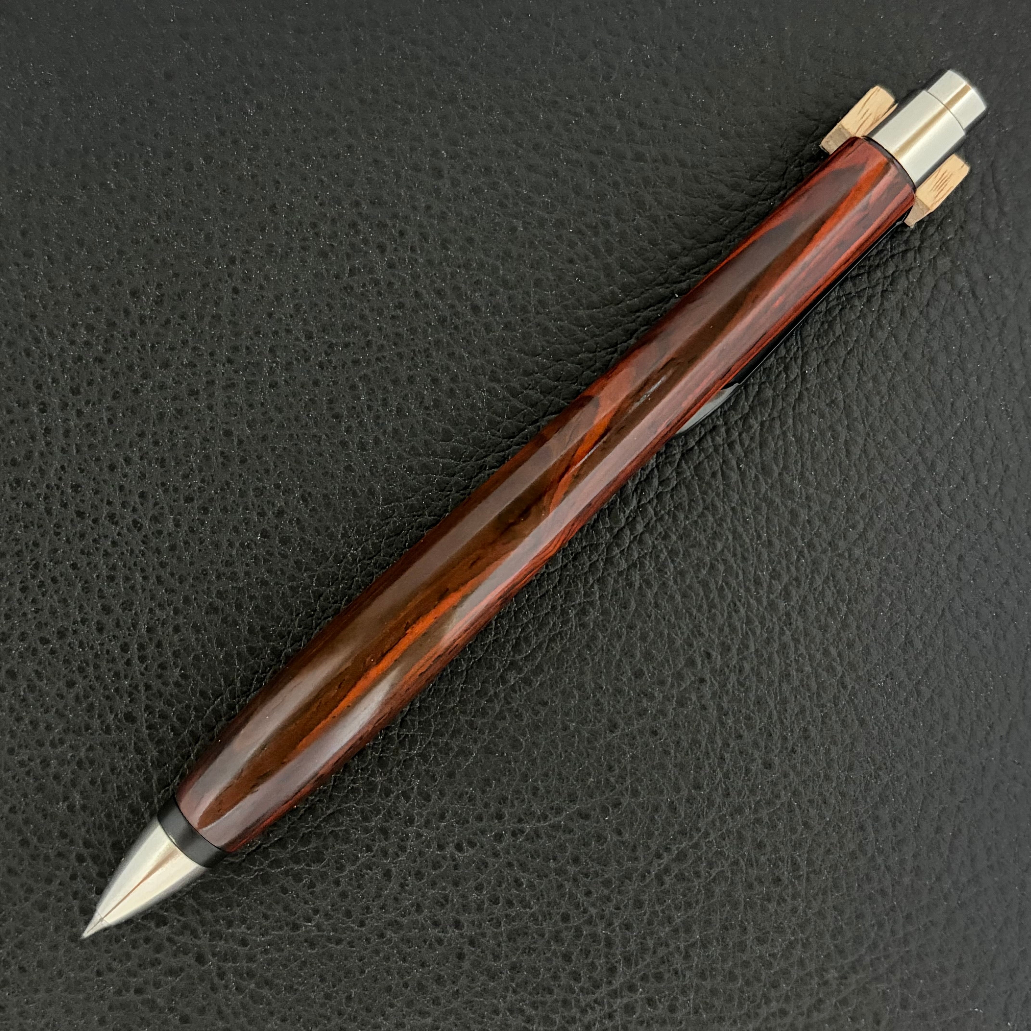 ボールペンのノックシステムは、ドイツ最高のクリックメカニズムを採用してあります。このメカニズムはユニークな機構のため、クリックしたときのカチカチ音が静かで、どんな場所でも気兼ねなく使うことができます。滑らかに動くこのプッシュ感覚を一度味わうと他には戻れなくなってしまうほどの魅力があります。 100分の1単位の加工精度で削り出されたペン先は、軸ブレも全くありません。