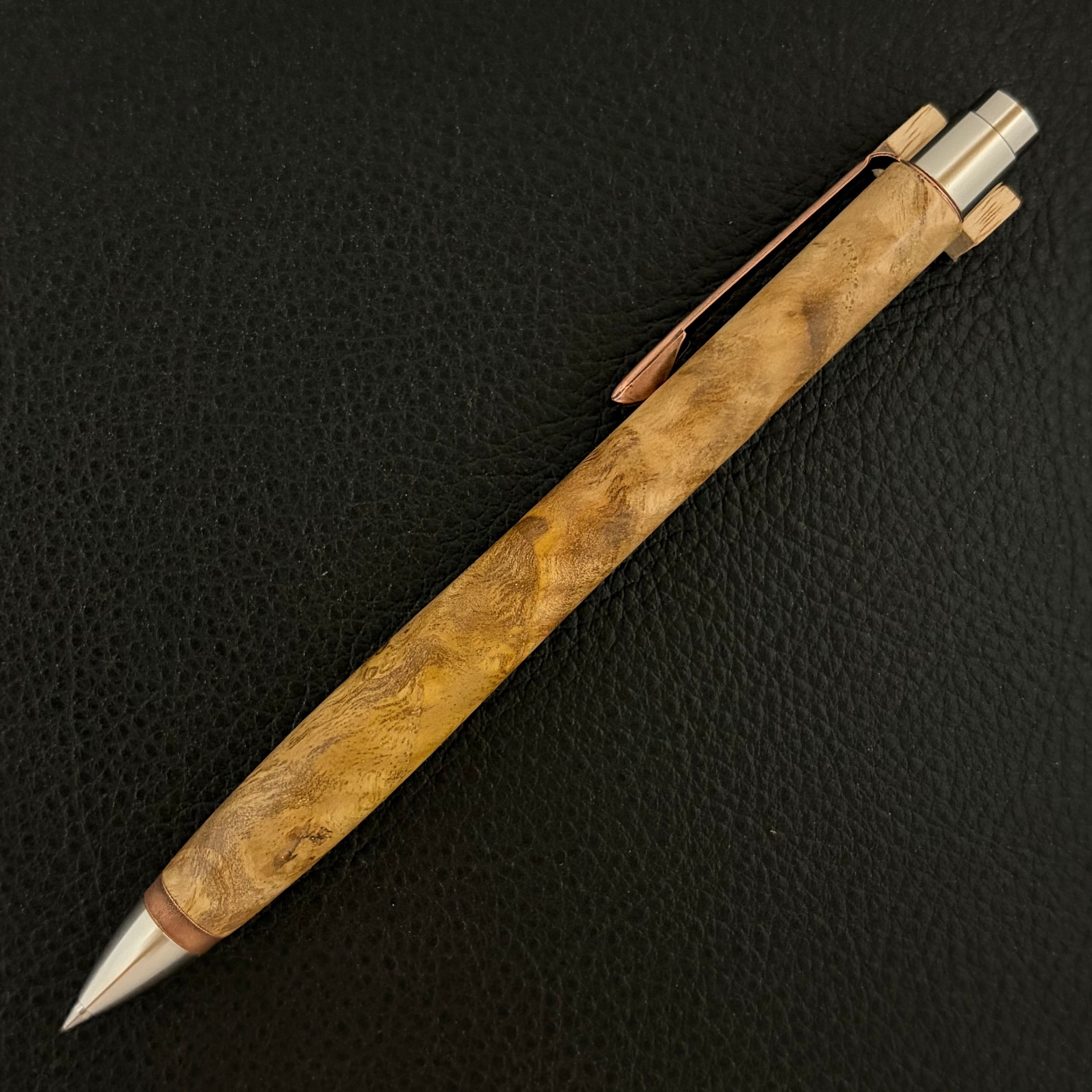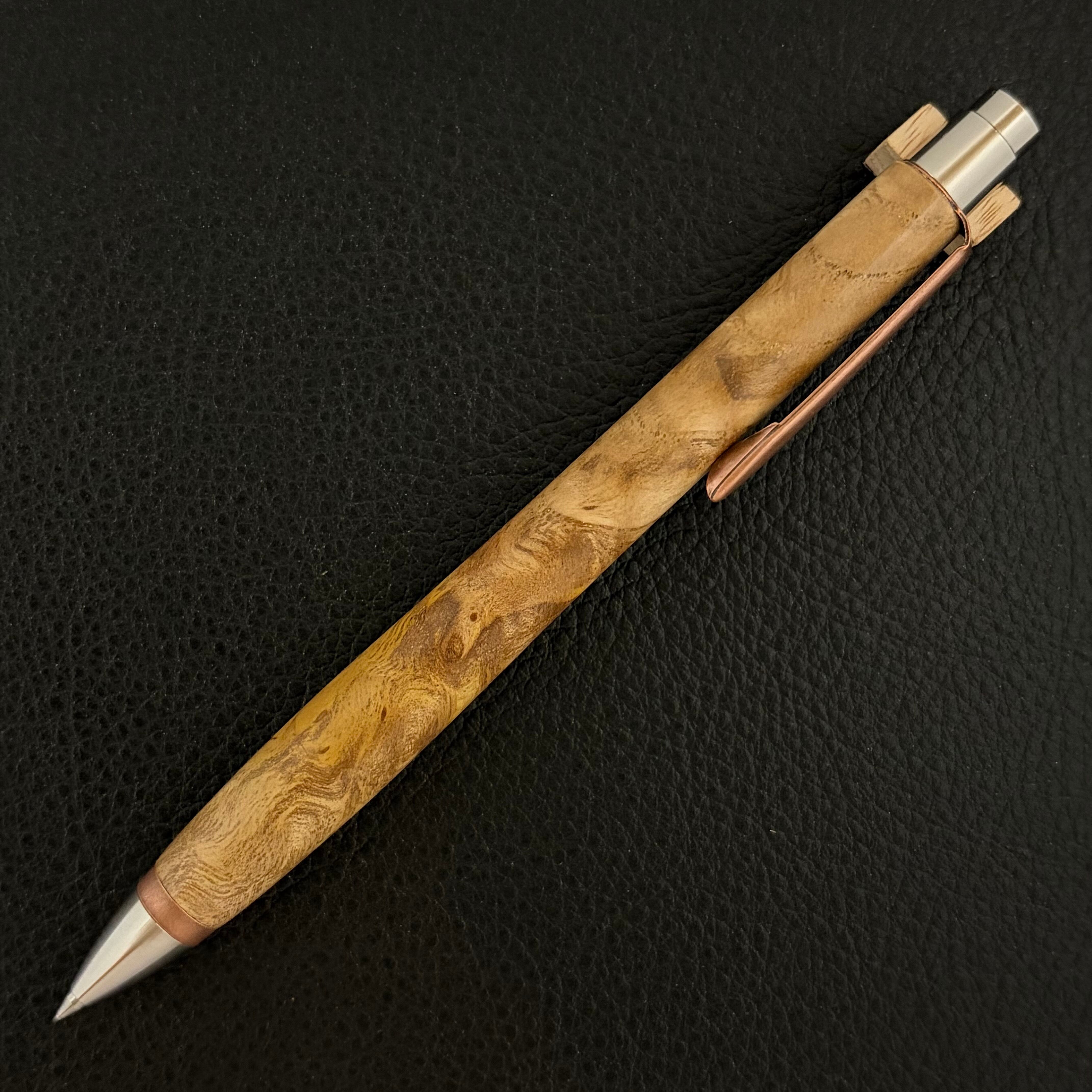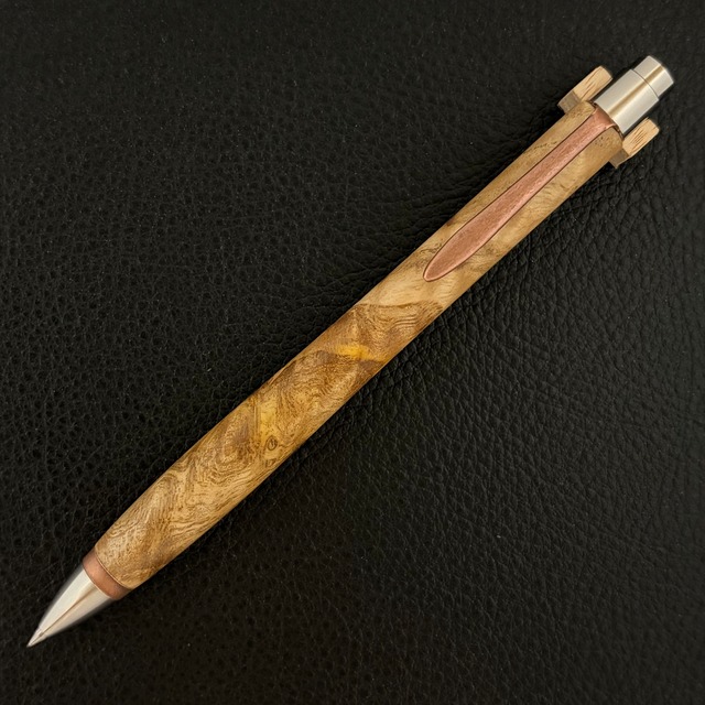 ボールペンのノックシステムは、ドイツ最高のクリックメカニズムを採用してあります。このメカニズムはユニークな機構のため、クリックしたときのカチカチ音が静かで、どんな場所でも気兼ねなく使うことができます。滑らかに動くこのプッシュ感覚を一度味わうと他には戻れなくなってしまうほどの魅力があります。 100分の1単位の加工精度で削り出されたペン先は、軸ブレも全くありません。