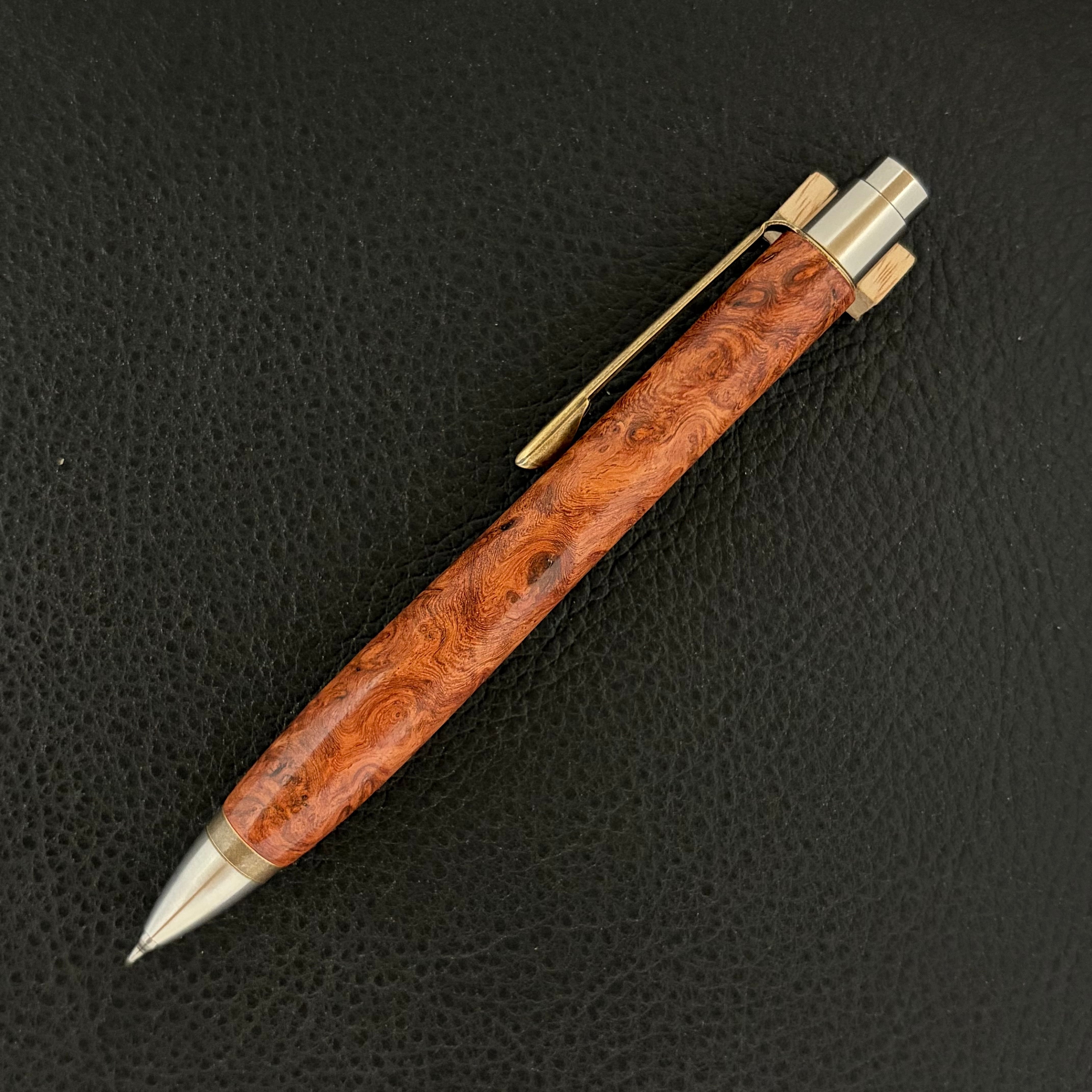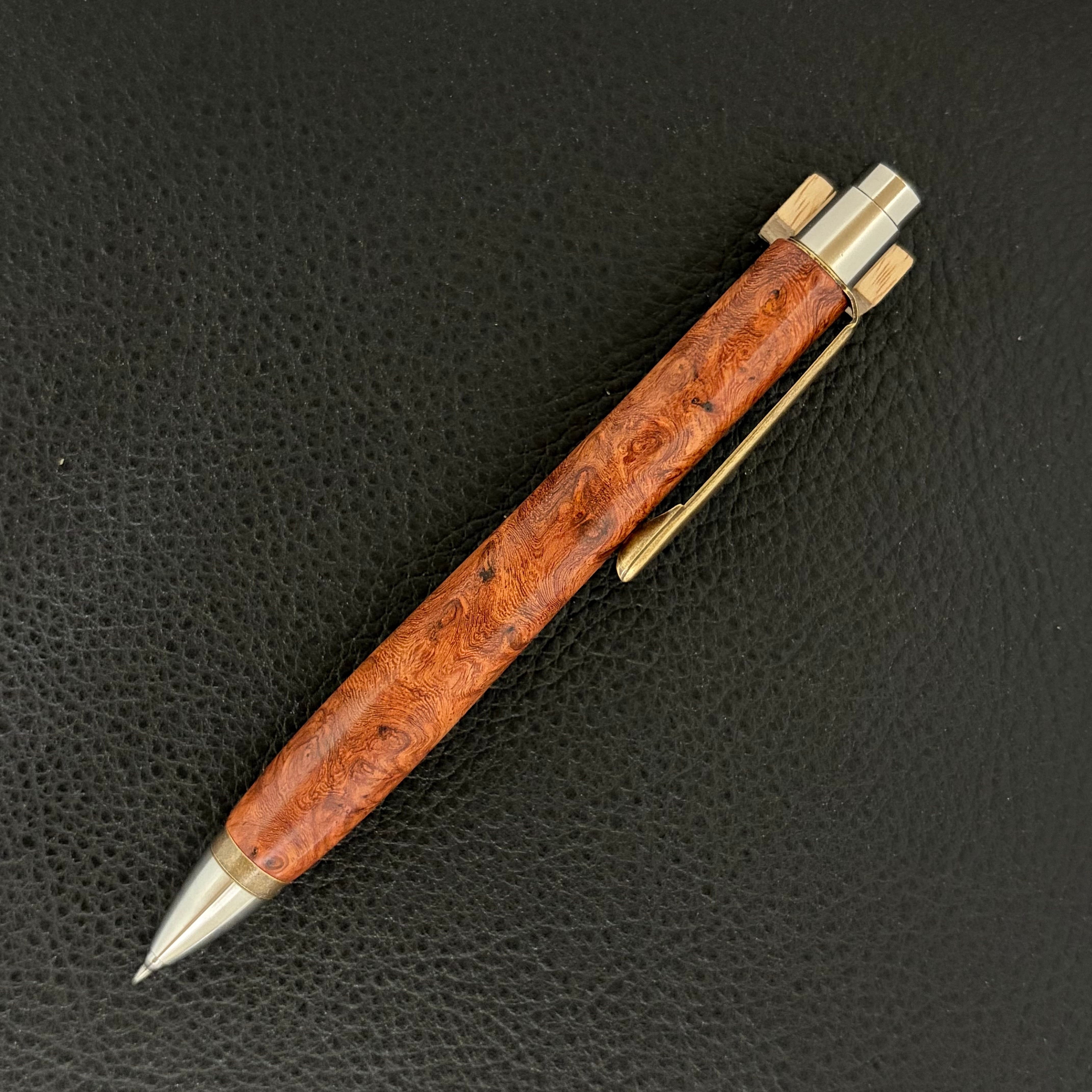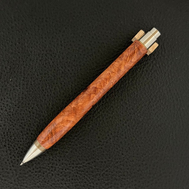 ボールペンのノックシステムは、ドイツ最高のクリックメカニズムを採用してあります。このメカニズムはユニークな機構のため、クリックしたときのカチカチ音が静かで、どんな場所でも気兼ねなく使うことができます。滑らかに動くこのプッシュ感覚を一度味わうと他には戻れなくなってしまうほどの魅力があります。 高級ステンレス材を100分の1単位の加工精度で削り出された口金により芯ブレも全くありません。内部のアルミを使ったリフィルアダプターもオリジナルです。