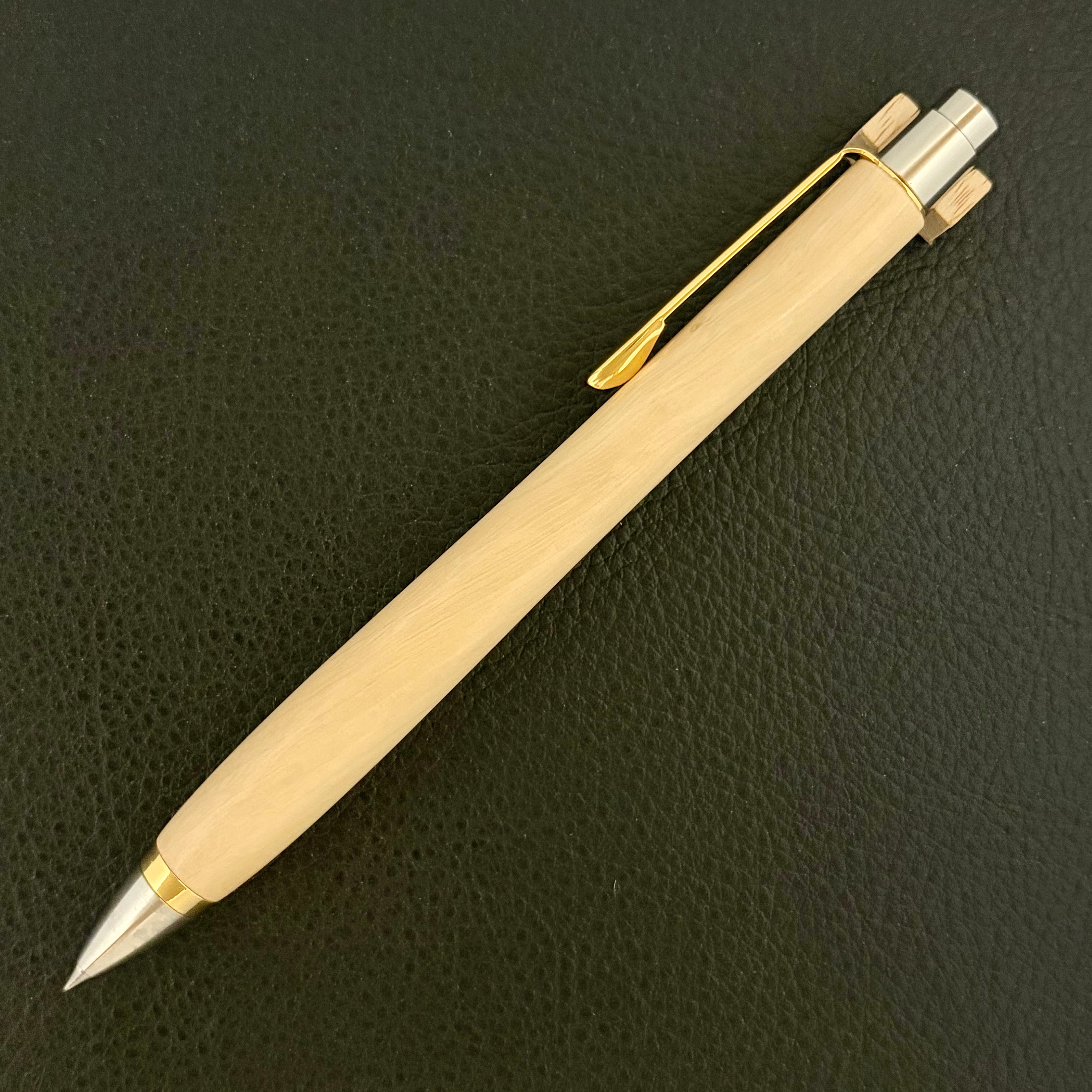 ボールペンのノックシステムは、ドイツ最高のクリックメカニズムを採用してあります。このメカニズムはユニークな機構のため、クリックしたときのカチカチ音が静かで、どんな場所でも気兼ねなく使うことができます。滑らかに動くこのプッシュ感覚を一度味わうと他には戻れなくなってしまうほどの魅力があります。 100分の1単位の加工精度で削り出されたペン先は、軸ブレも全くありません。