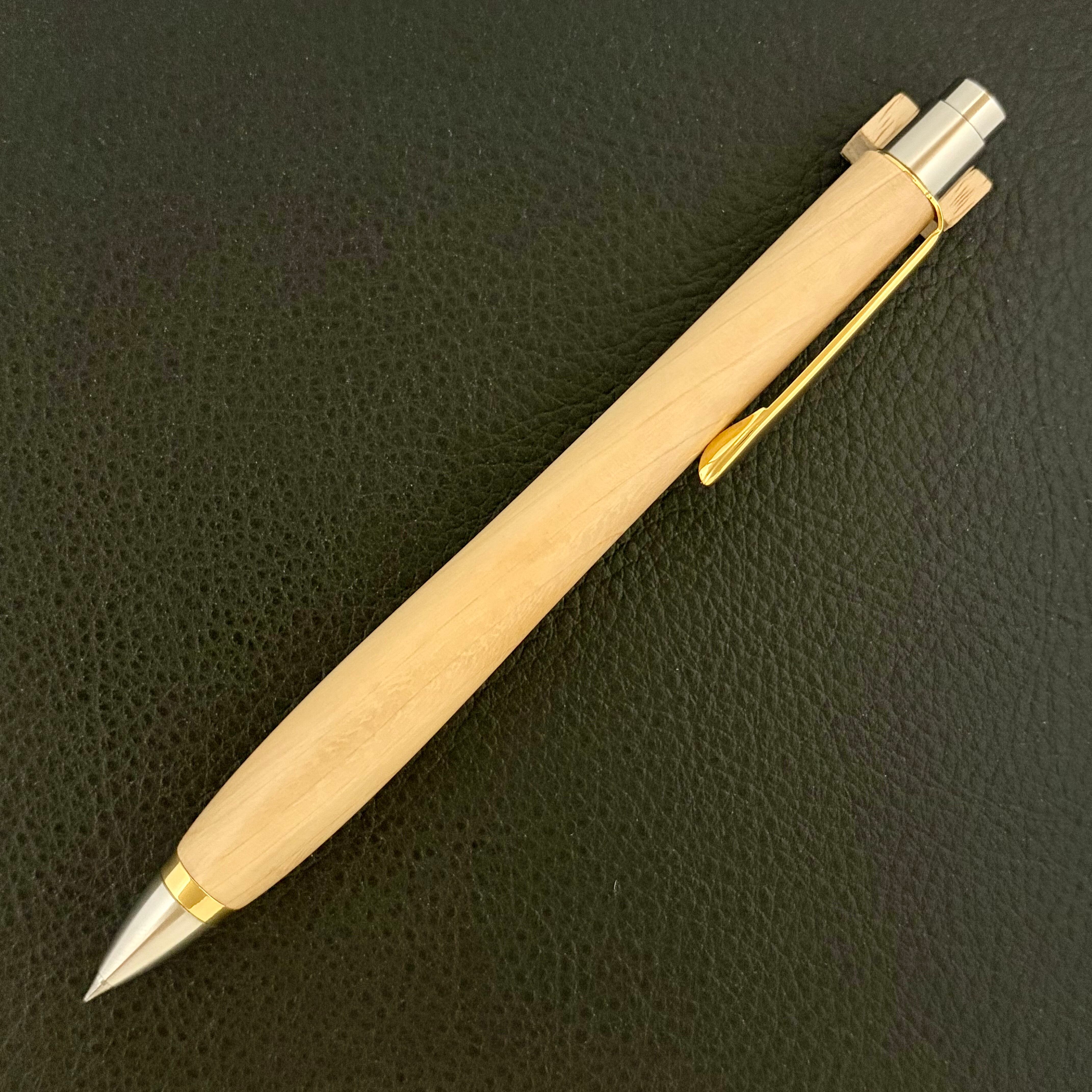 ボールペンのノックシステムは、ドイツ最高のクリックメカニズムを採用してあります。このメカニズムはユニークな機構のため、クリックしたときのカチカチ音が静かで、どんな場所でも気兼ねなく使うことができます。滑らかに動くこのプッシュ感覚を一度味わうと他には戻れなくなってしまうほどの魅力があります。 100分の1単位の加工精度で削り出されたペン先は、軸ブレも全くありません。