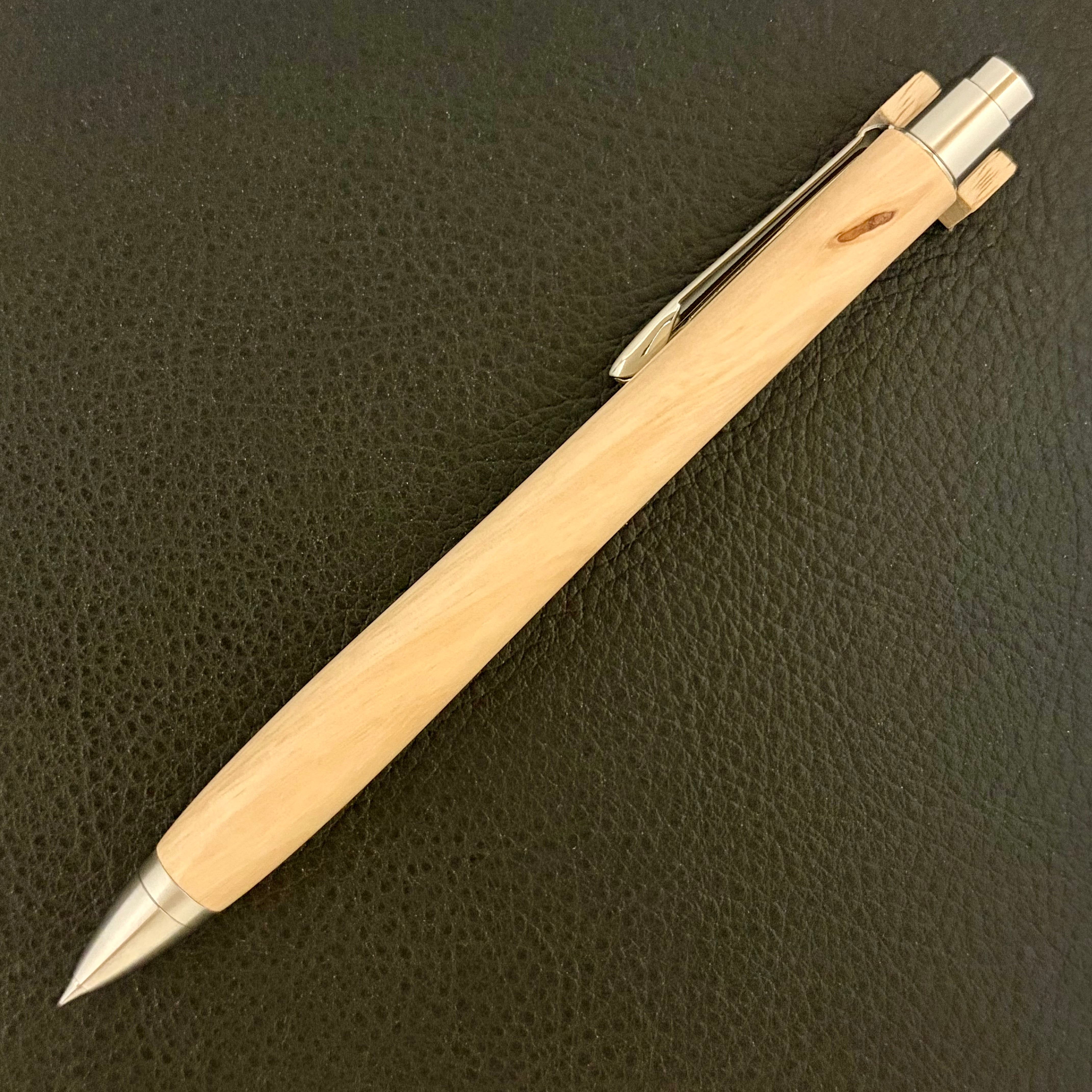 ボールペンのノックシステムは、ドイツ最高のクリックメカニズムを採用してあります。このメカニズムはユニークな機構のため、クリックしたときのカチカチ音が静かで、どんな場所でも気兼ねなく使うことができます。滑らかに動くこのプッシュ感覚を一度味わうと他には戻れなくなってしまうほどの魅力があります。 100分の1単位の加工精度で削り出されたペン先は、軸ブレも全くありません。