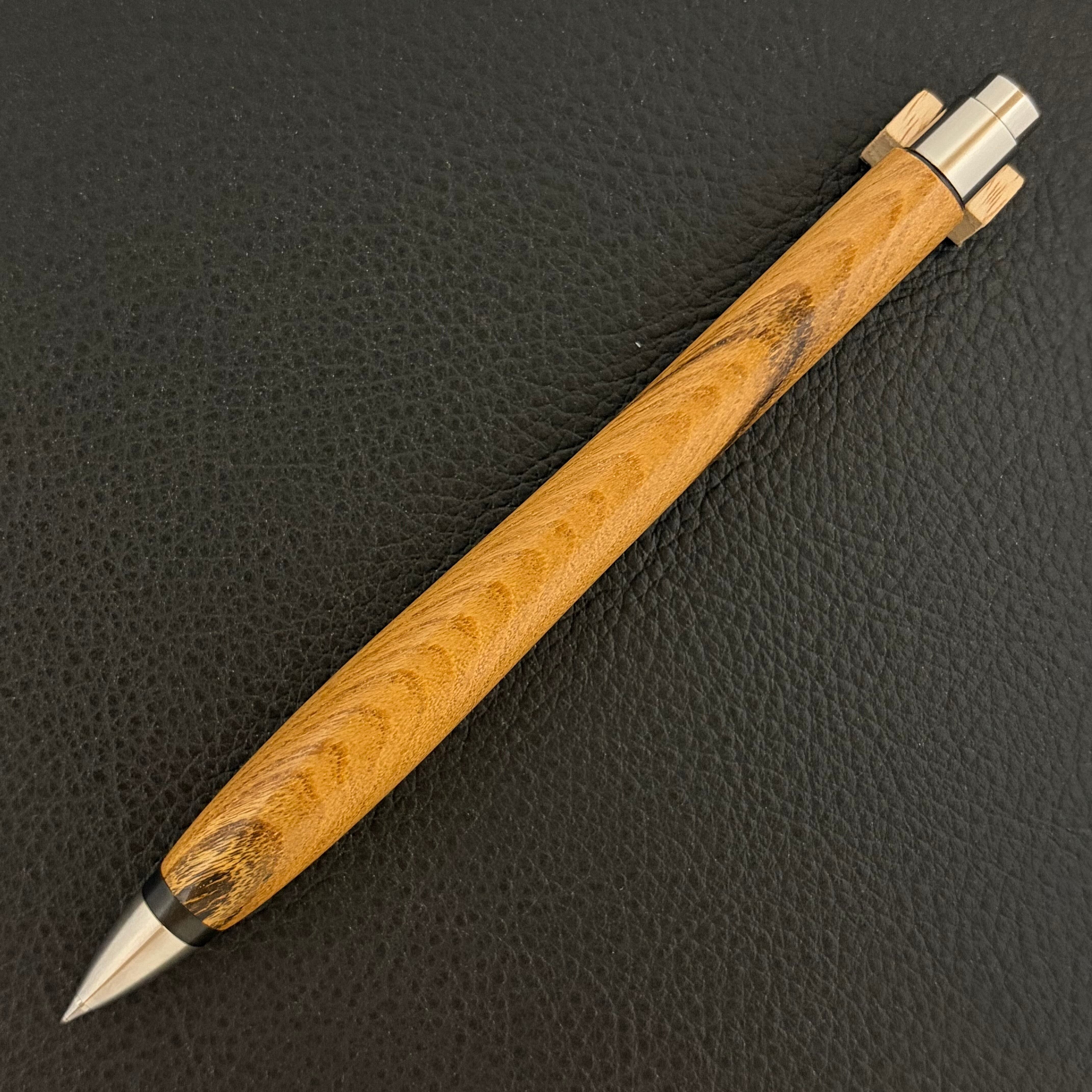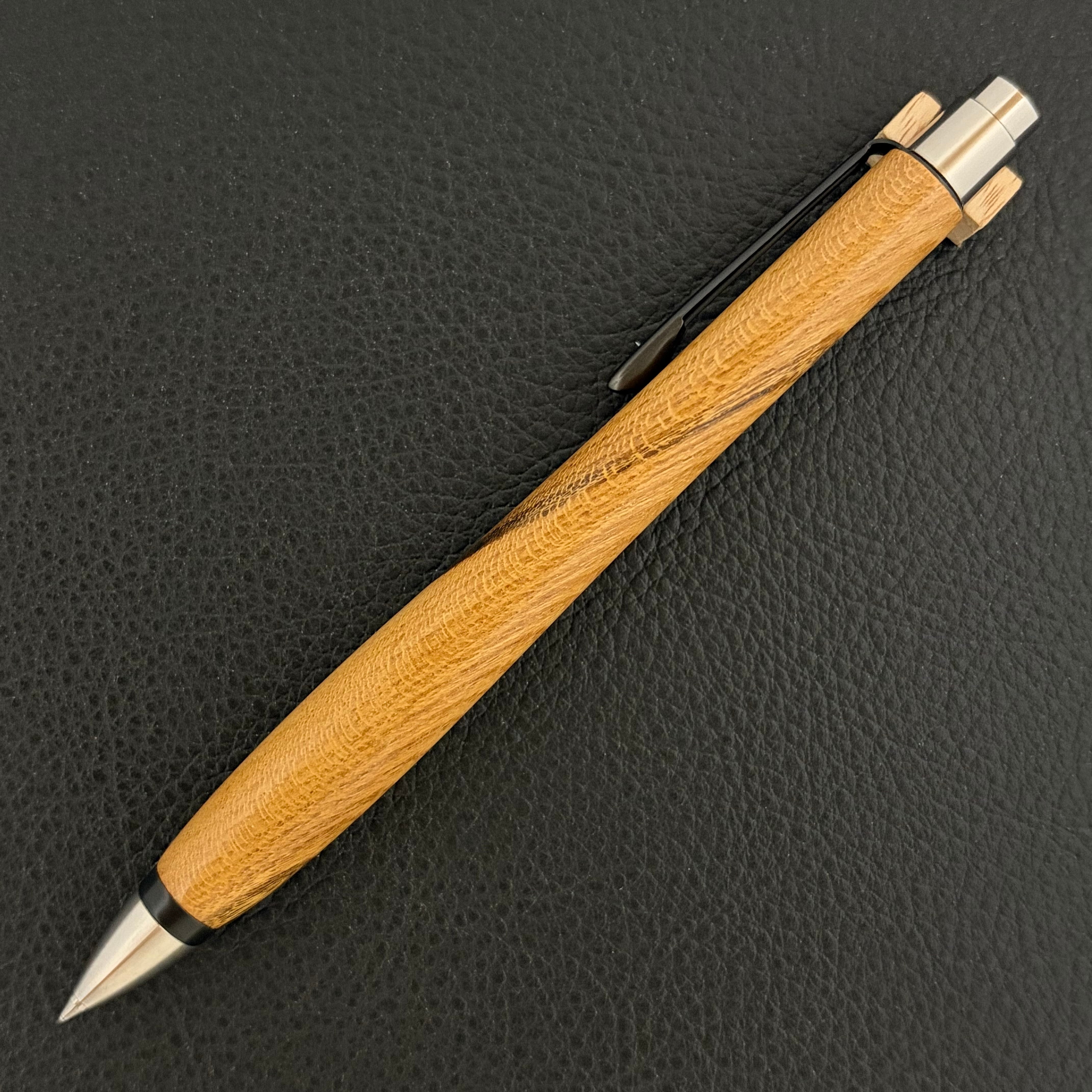 ボールペンのノックシステムは、ドイツ最高のクリックメカニズムを採用してあります。このメカニズムはユニークな機構のため、クリックしたときのカチカチ音が静かで、どんな場所でも気兼ねなく使うことができます。滑らかに動くこのプッシュ感覚を一度味わうと他には戻れなくなってしまうほどの魅力があります。 100分の1単位の加工精度で削り出されたペン先は、軸ブレも全くありません。