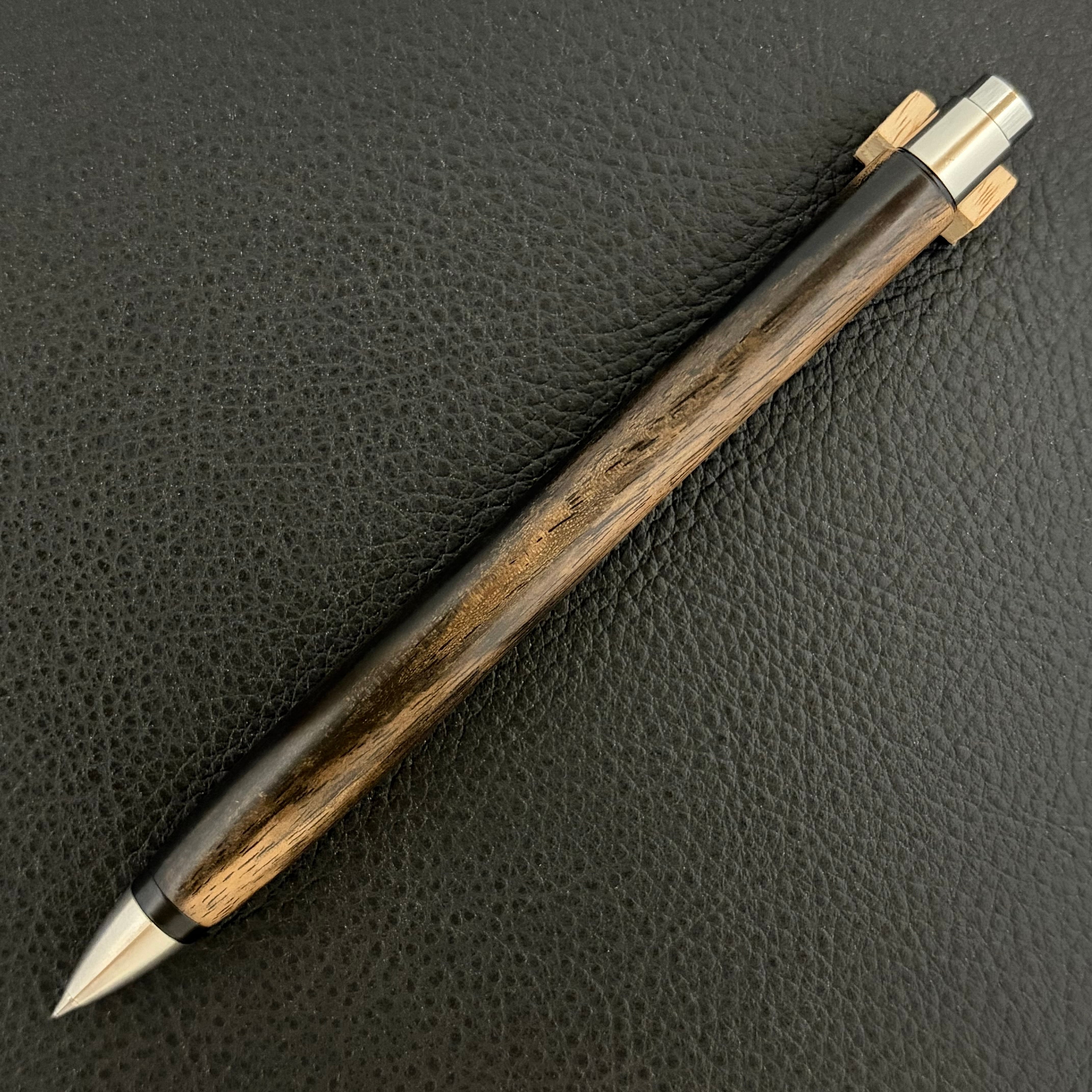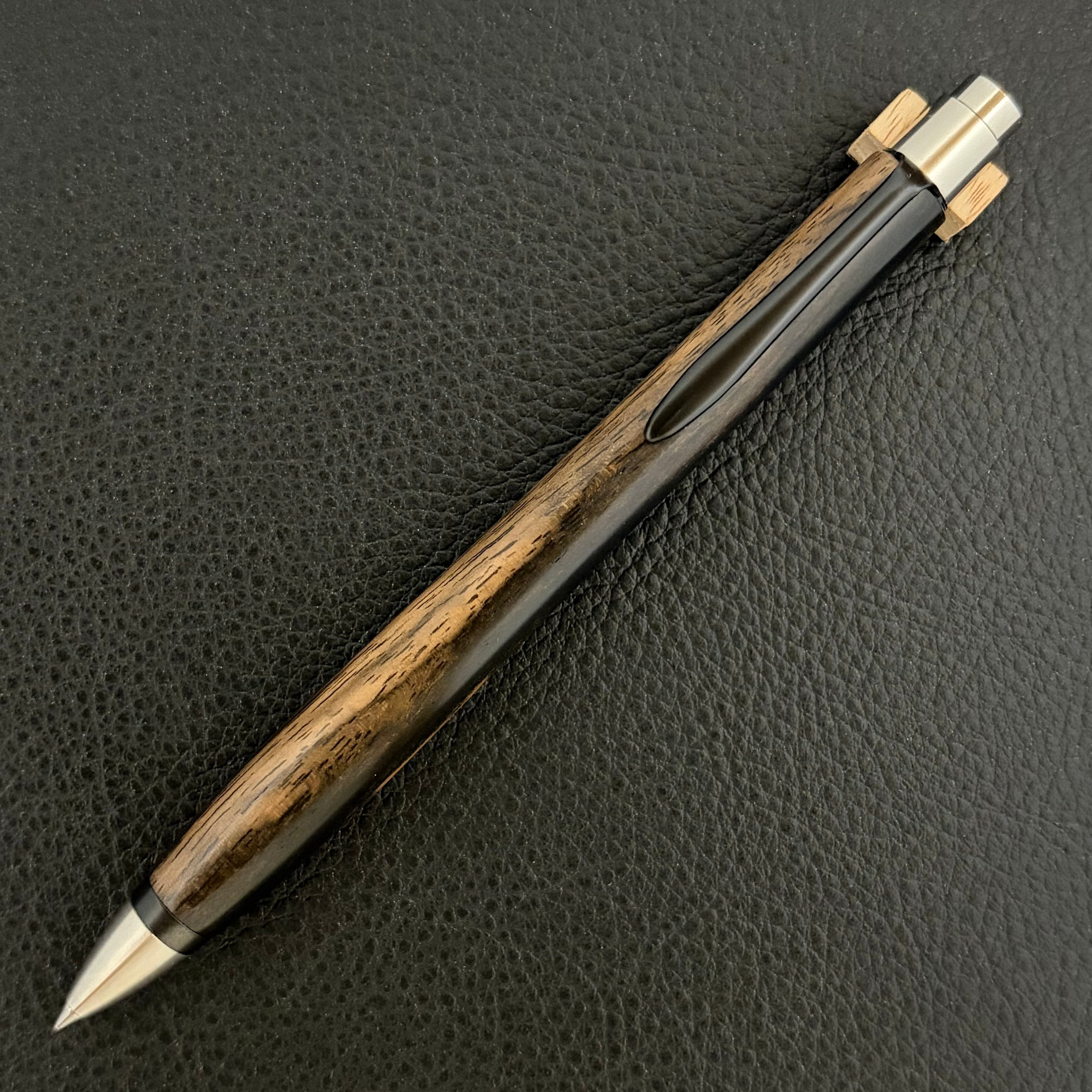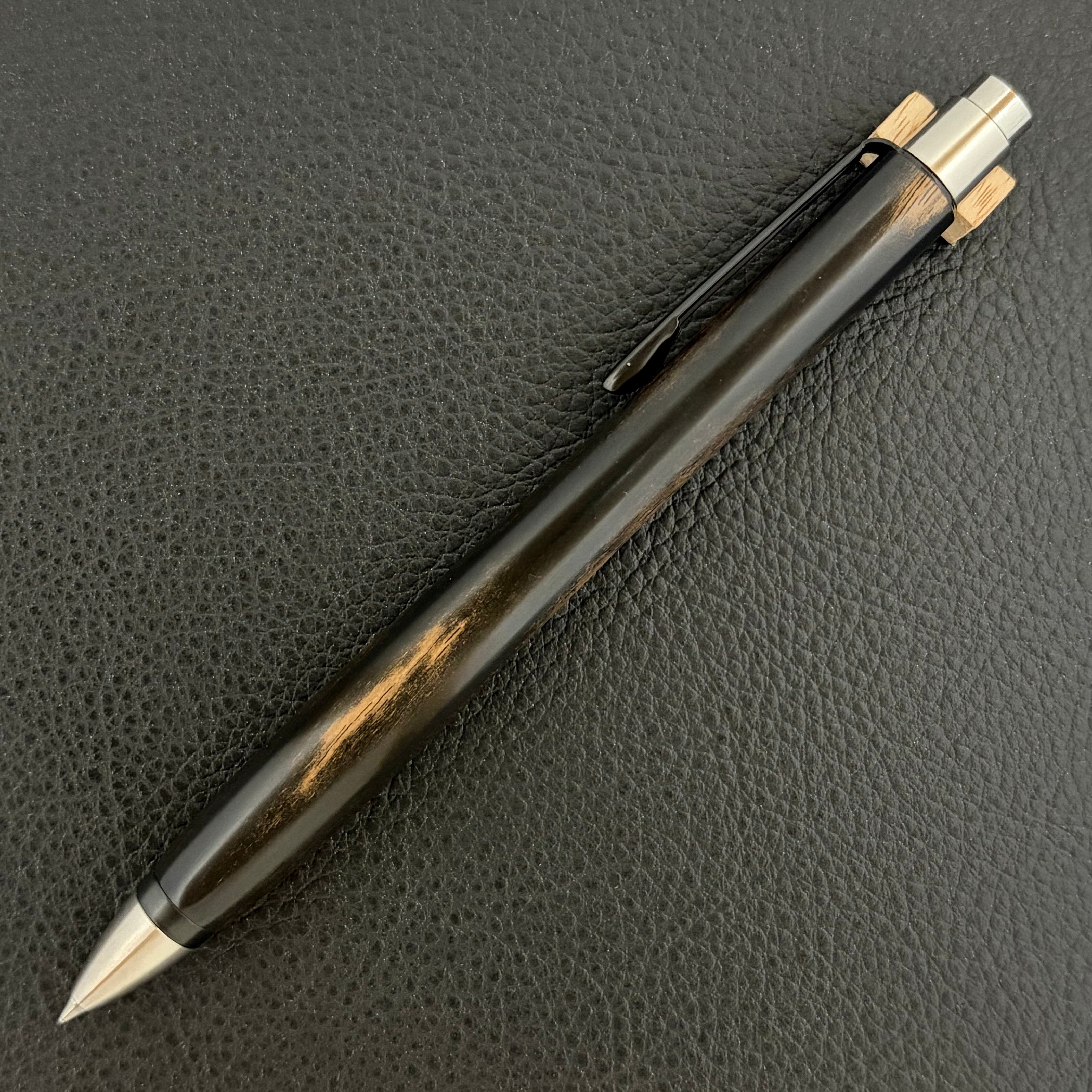 ボールペンのノックシステムは、ドイツ最高のクリックメカニズムを採用してあります。このメカニズムはユニークな機構のため、クリックしたときのカチカチ音が静かで、どんな場所でも気兼ねなく使うことができます。滑らかに動くこのプッシュ感覚を一度味わうと他には戻れなくなってしまうほどの魅力があります。 100分の1単位の加工精度で削り出されたペン先は、軸ブレも全くありません。