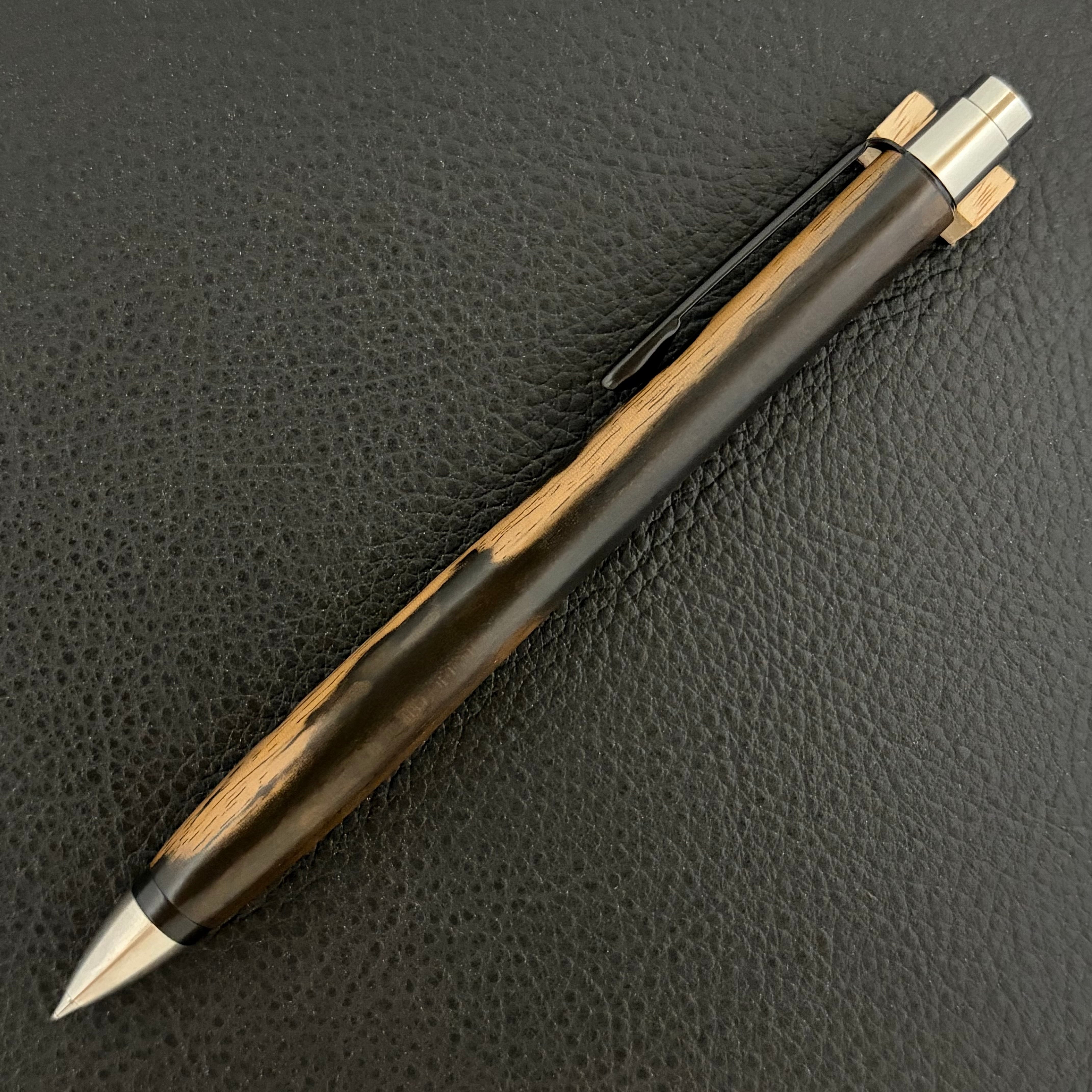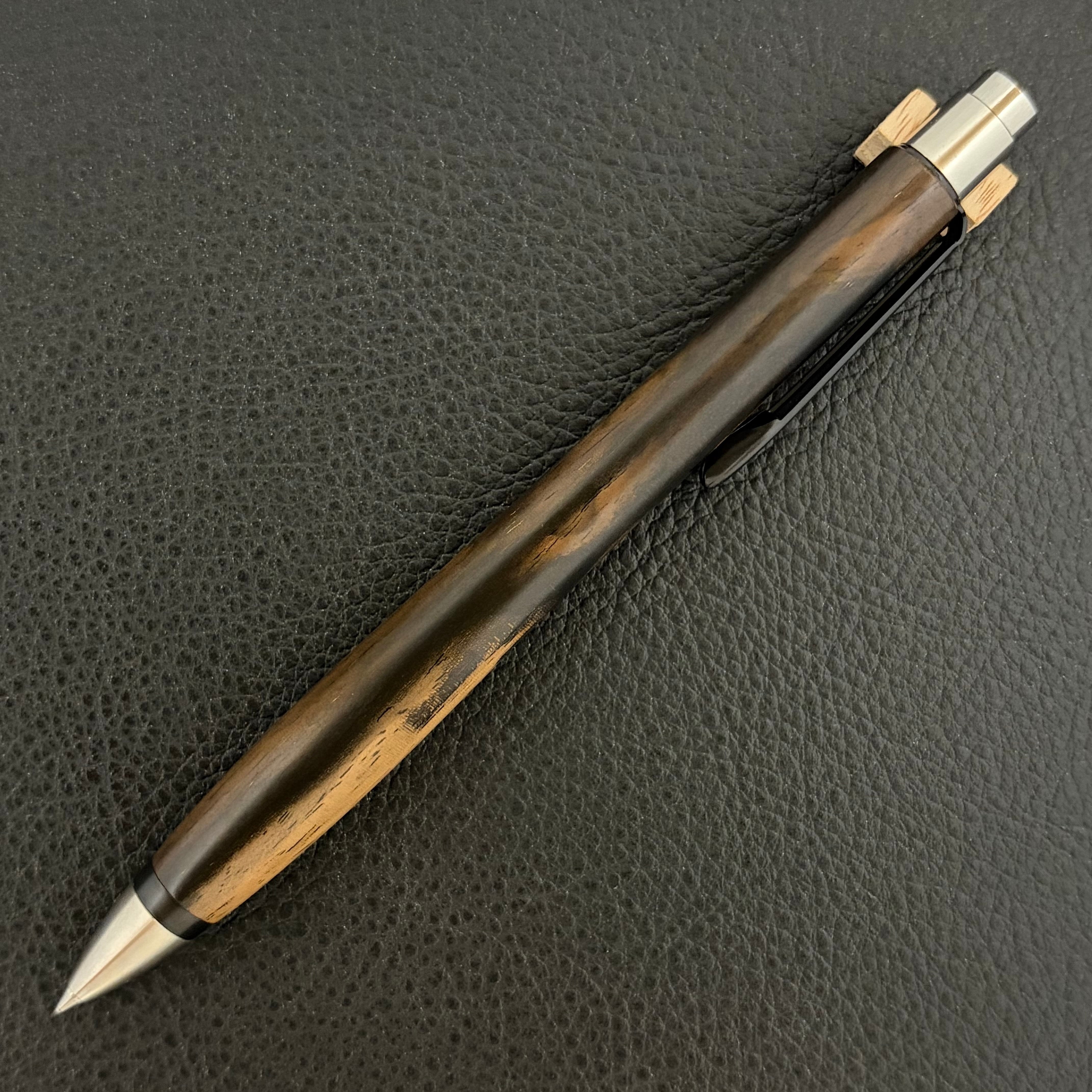 ボールペンのノックシステムは、ドイツ最高のクリックメカニズムを採用してあります。このメカニズムはユニークな機構のため、クリックしたときのカチカチ音が静かで、どんな場所でも気兼ねなく使うことができます。滑らかに動くこのプッシュ感覚を一度味わうと他には戻れなくなってしまうほどの魅力があります。 100分の1単位の加工精度で削り出されたペン先は、軸ブレも全くありません。
