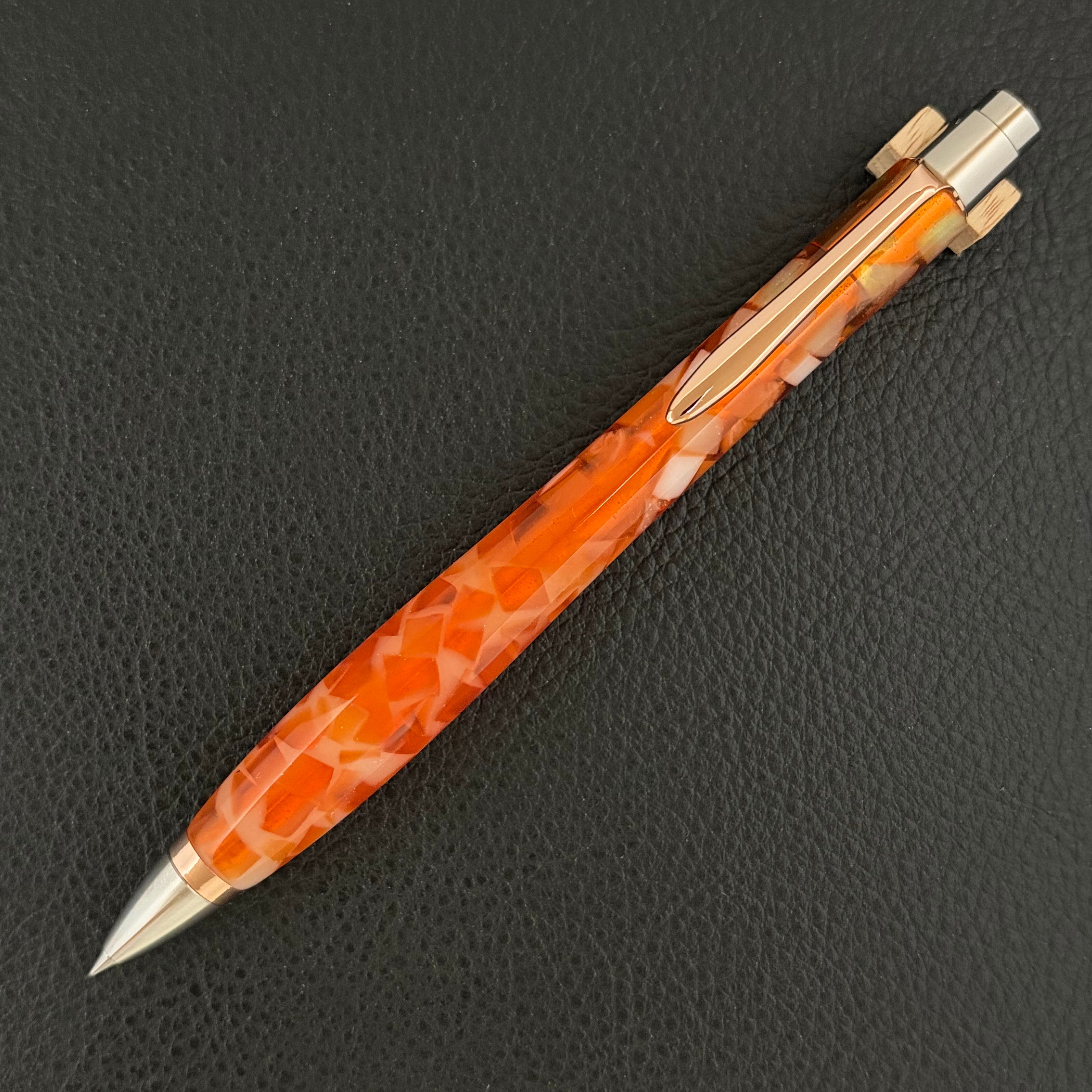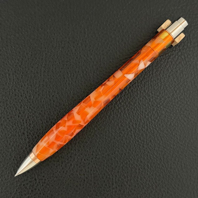 ボールペンのノックシステムは、ドイツ最高のクリックメカニズムを採用してあります。このメカニズムはユニークな機構のため、クリックしたときのカチカチ音が静かで、どんな場所でも気兼ねなく使うことができます。滑らかに動くこのプッシュ感覚を一度味わうと他には戻れなくなってしまうほどの魅力があります。 100分の1単位の加工精度で削り出されたペン先は、軸ブレも全くありません。