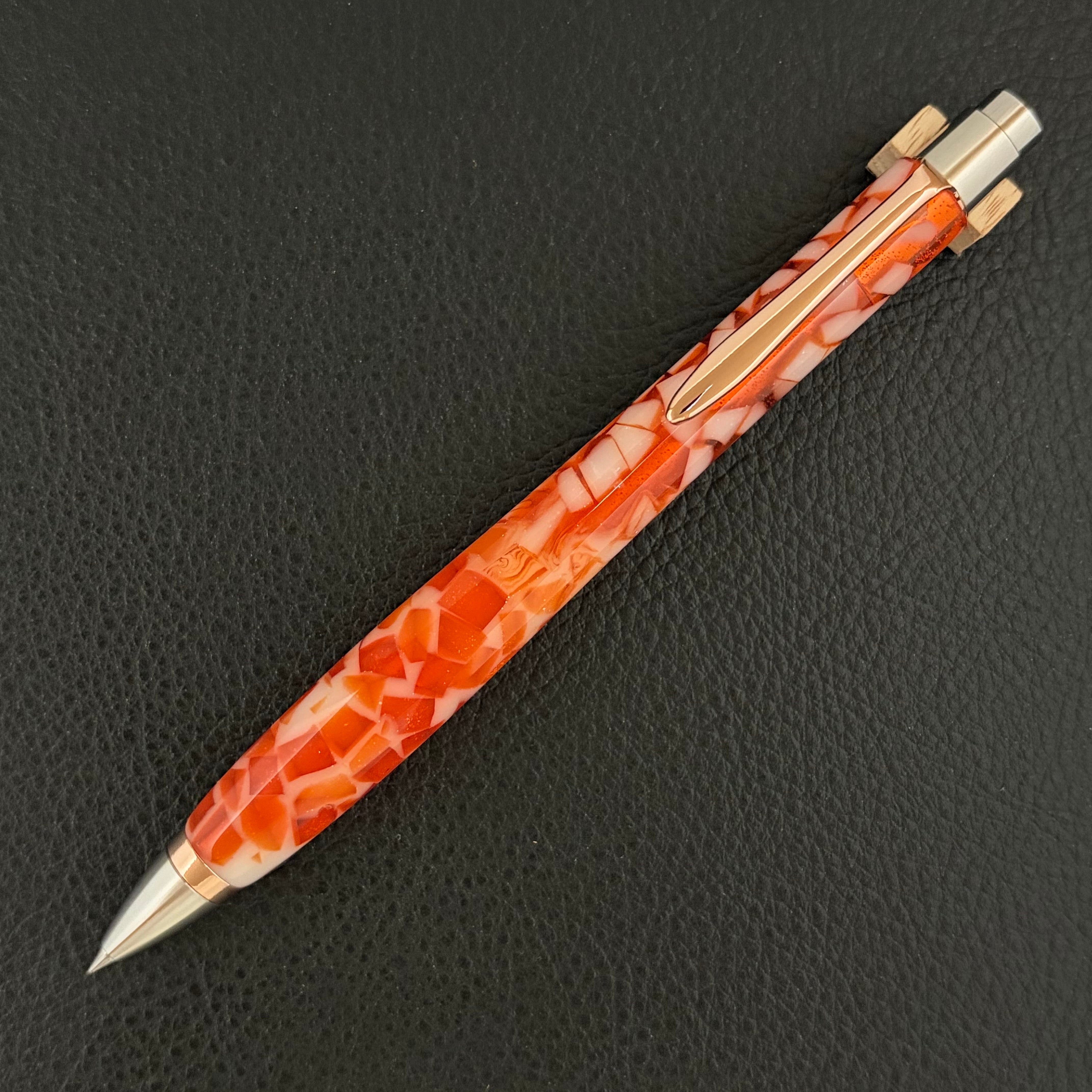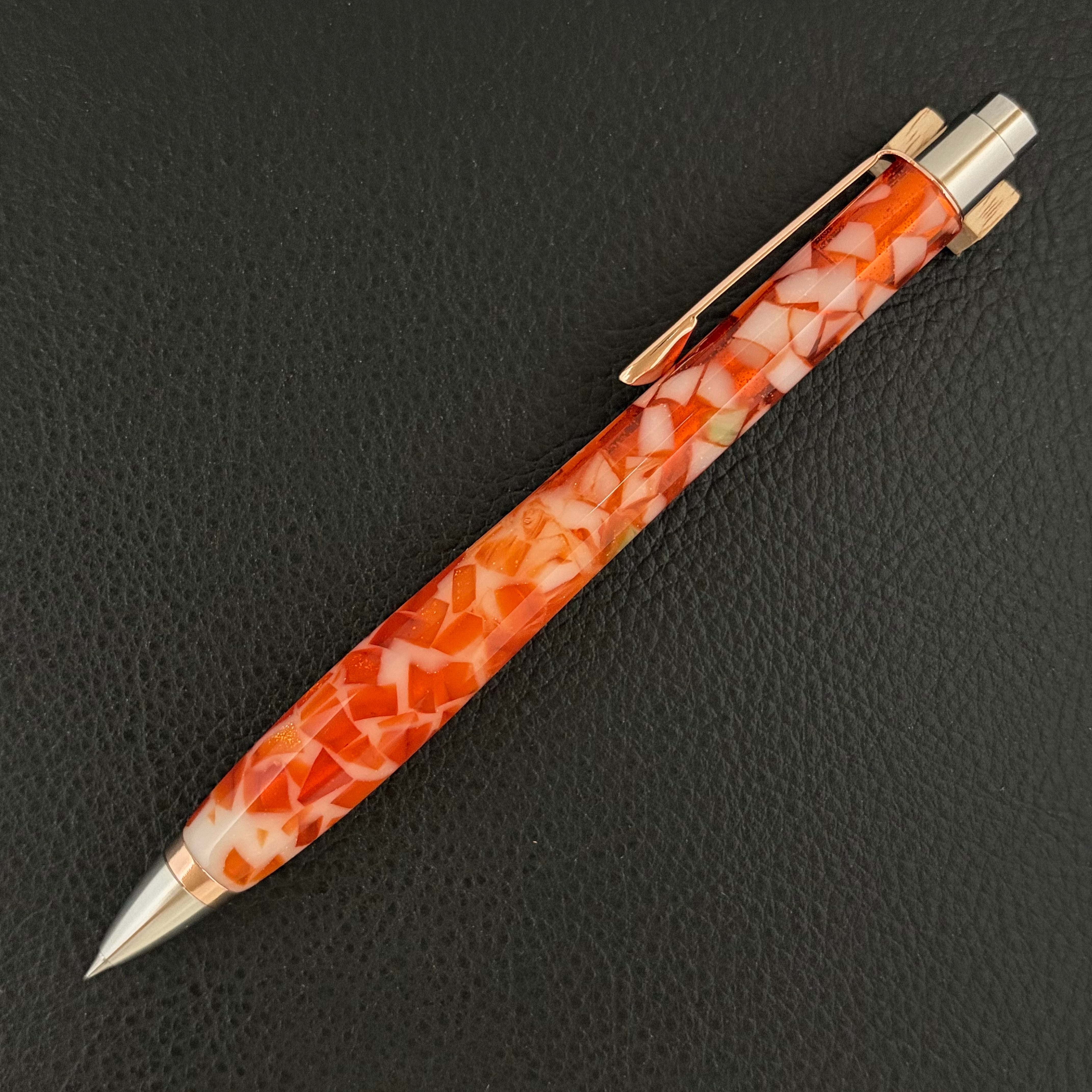 ボールペンのノックシステムは、ドイツ最高のクリックメカニズムを採用してあります。このメカニズムはユニークな機構のため、クリックしたときのカチカチ音が静かで、どんな場所でも気兼ねなく使うことができます。滑らかに動くこのプッシュ感覚を一度味わうと他には戻れなくなってしまうほどの魅力があります。 100分の1単位の加工精度で削り出されたペン先は、軸ブレも全くありません。