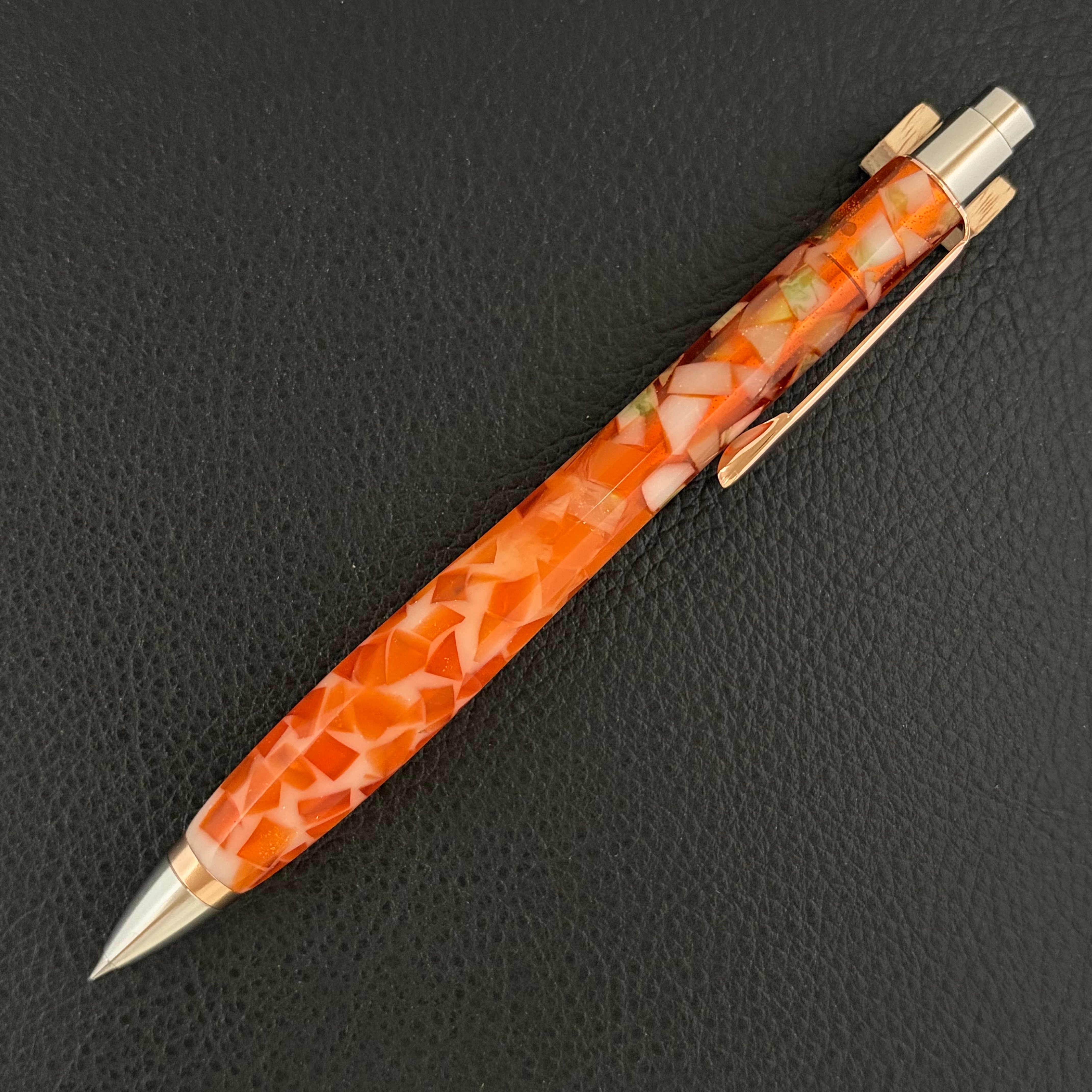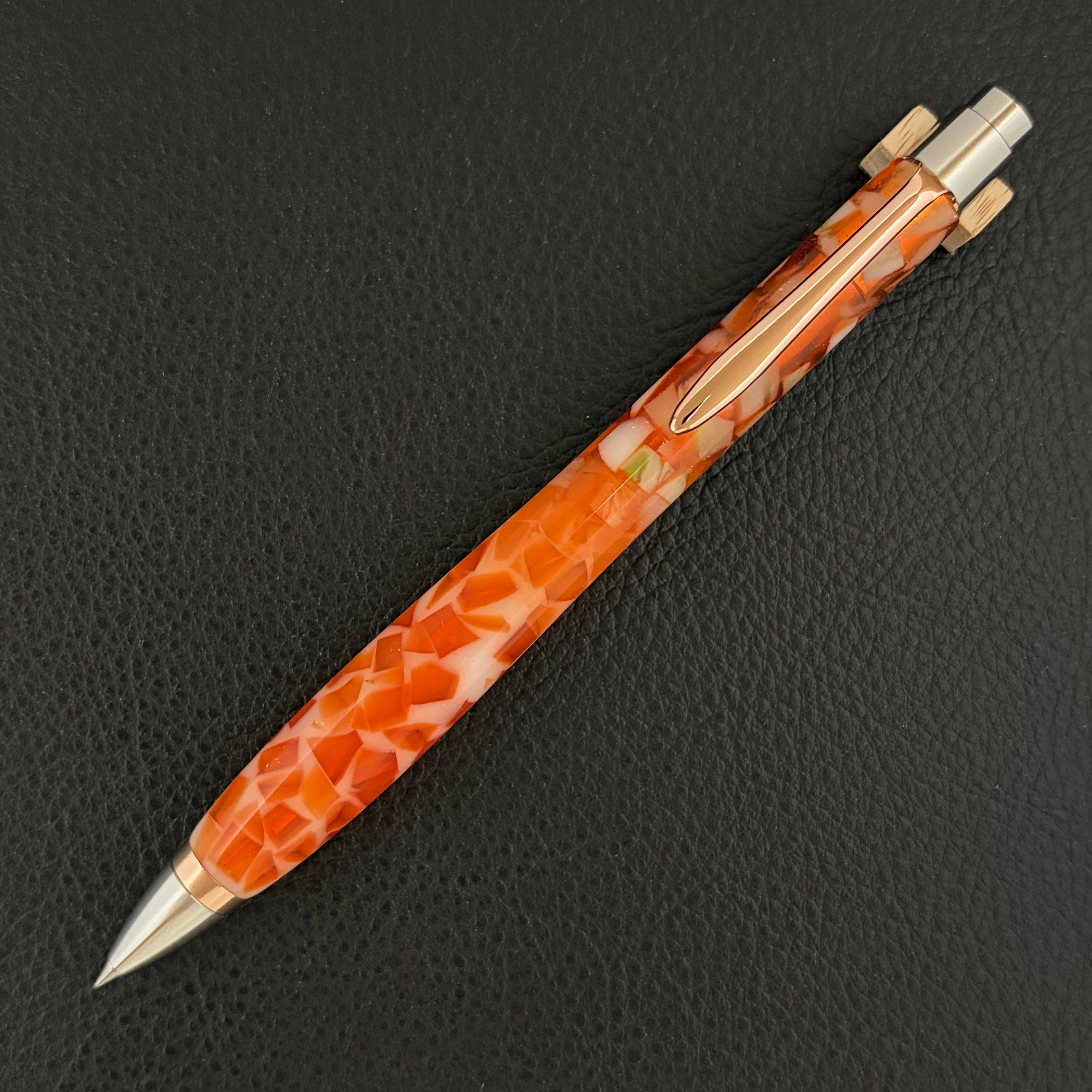 ボールペンのノックシステムは、ドイツ最高のクリックメカニズムを採用してあります。このメカニズムはユニークな機構のため、クリックしたときのカチカチ音が静かで、どんな場所でも気兼ねなく使うことができます。滑らかに動くこのプッシュ感覚を一度味わうと他には戻れなくなってしまうほどの魅力があります。 100分の1単位の加工精度で削り出されたペン先は、軸ブレも全くありません。