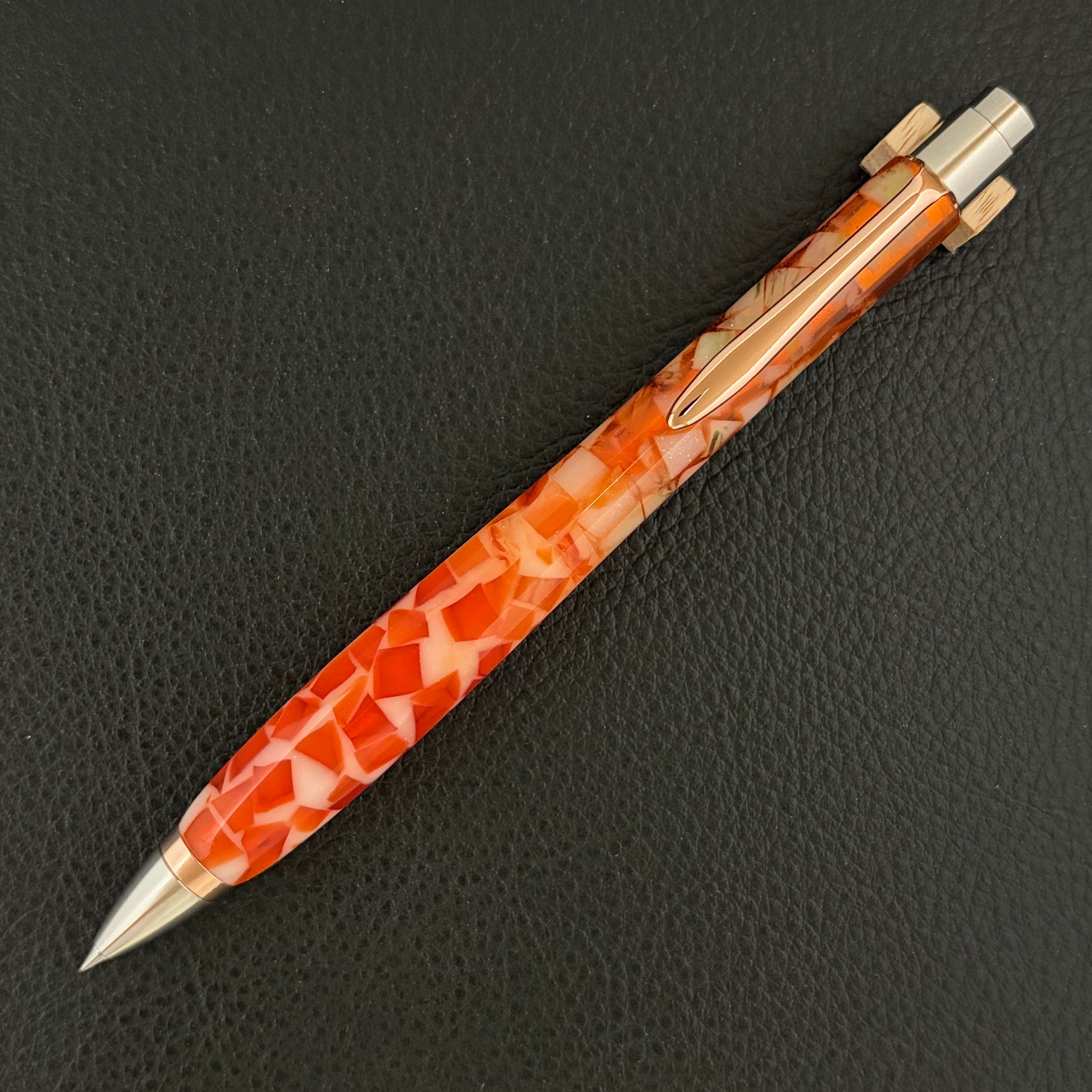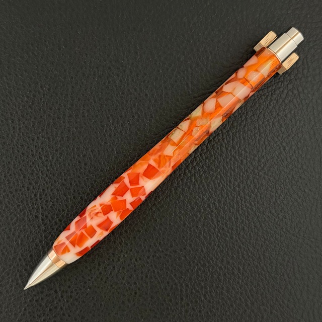 ボールペンのノックシステムは、ドイツ最高のクリックメカニズムを採用してあります。このメカニズムはユニークな機構のため、クリックしたときのカチカチ音が静かで、どんな場所でも気兼ねなく使うことができます。滑らかに動くこのプッシュ感覚を一度味わうと他には戻れなくなってしまうほどの魅力があります。 100分の1単位の加工精度で削り出されたペン先は、軸ブレも全くありません。