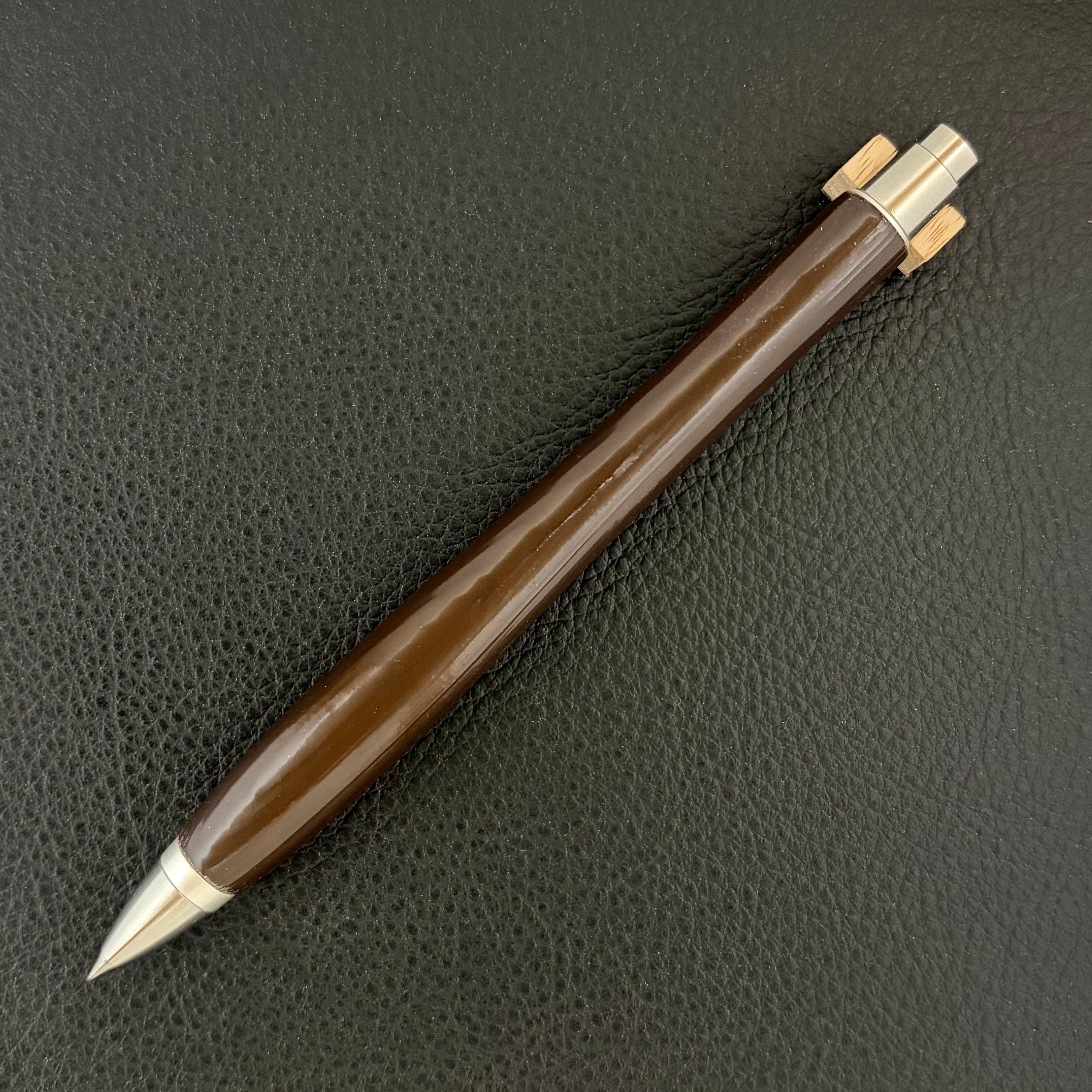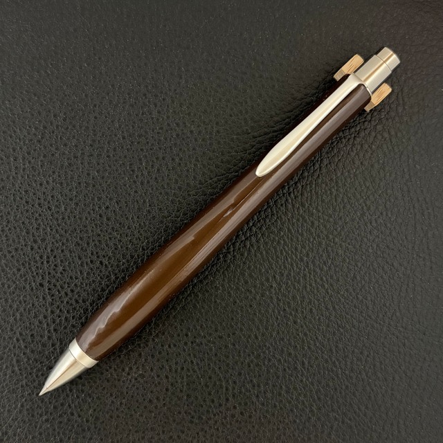 ボールペンのノックシステムは、ドイツ最高のクリックメカニズムを採用してあります。このメカニズムはユニークな機構のため、クリックしたときのカチカチ音が静かで、どんな場所でも気兼ねなく使うことができます。滑らかに動くこのプッシュ感覚を一度味わうと他には戻れなくなってしまうほどの魅力があります。 100分の1単位の加工精度で削り出されたペン先は、軸ブレも全くありません。