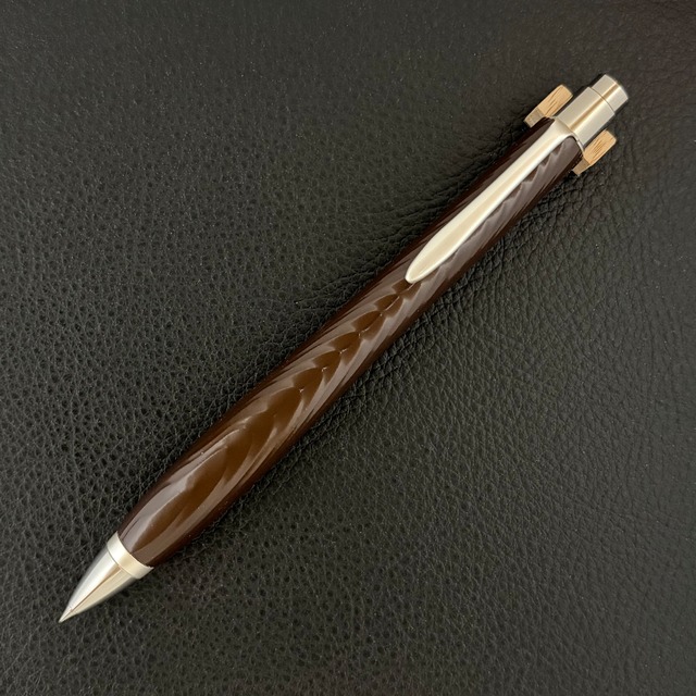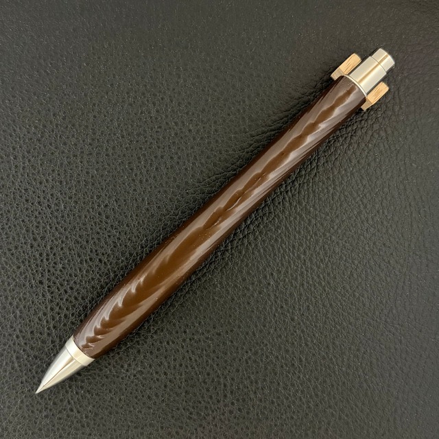 ボールペンのノックシステムは、ドイツ最高のクリックメカニズムを採用してあります。このメカニズムはユニークな機構のため、クリックしたときのカチカチ音が静かで、どんな場所でも気兼ねなく使うことができます。滑らかに動くこのプッシュ感覚を一度味わうと他には戻れなくなってしまうほどの魅力があります。 100分の1単位の加工精度で削り出されたペン先は、軸ブレも全くありません。